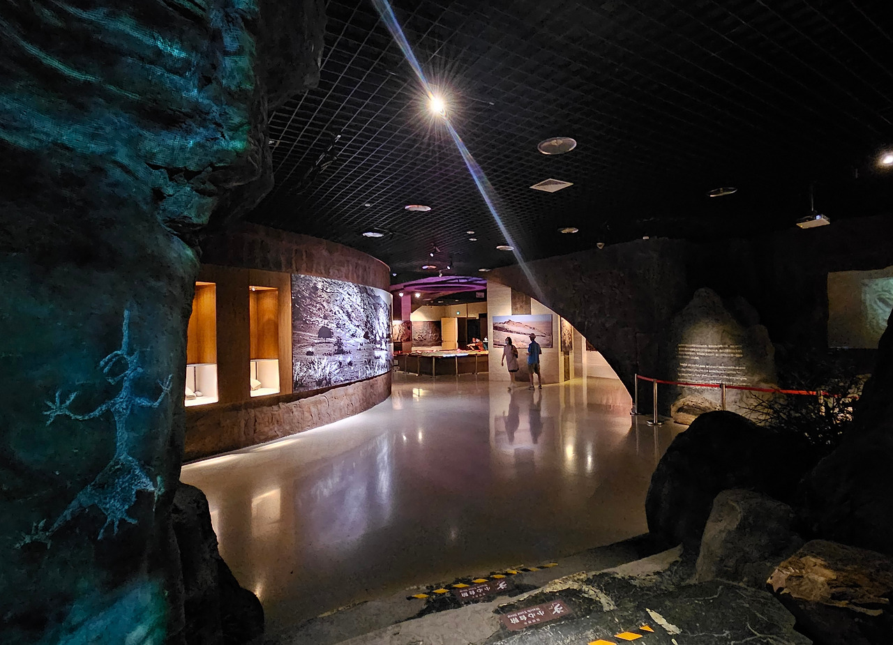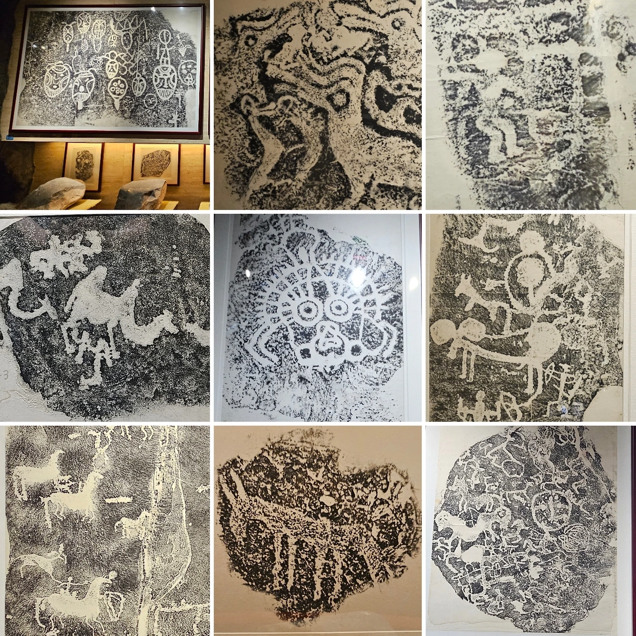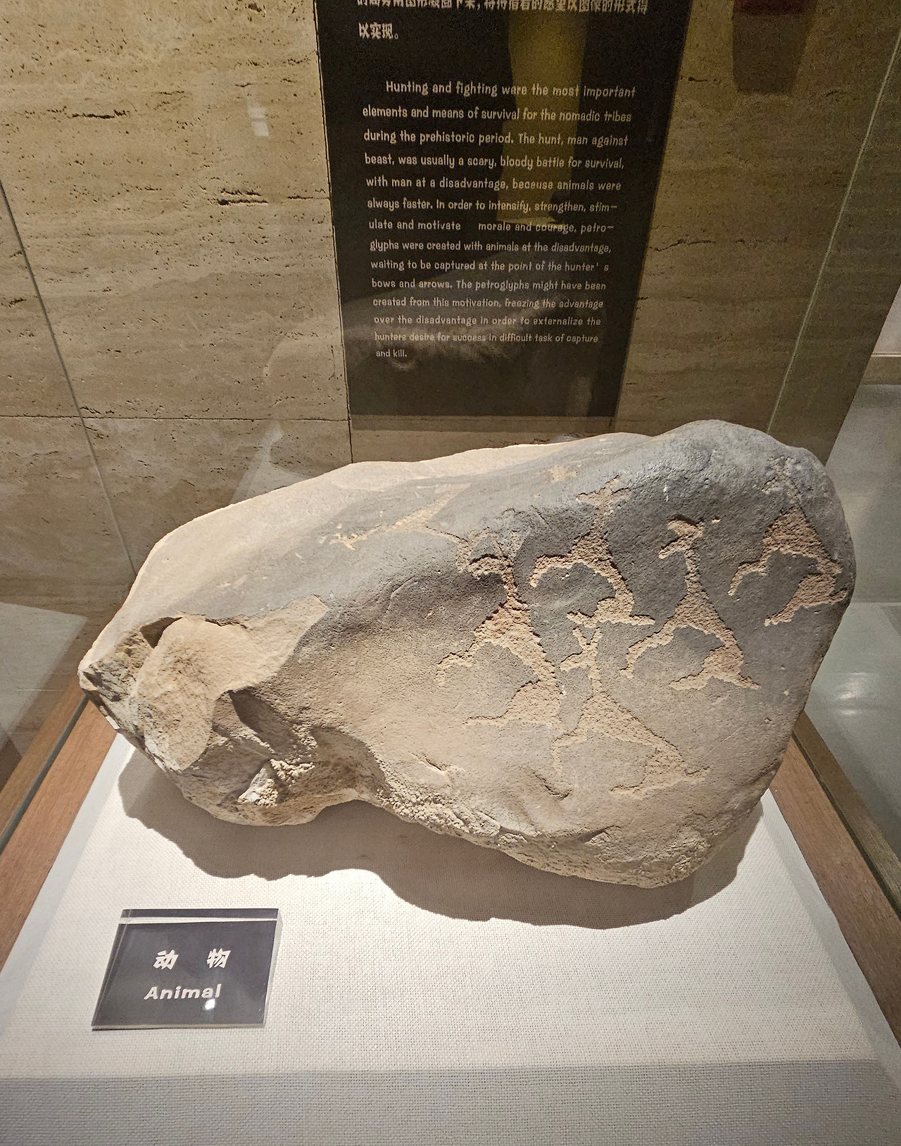 박물관 안으로 들어서니 투명한 원형 유리창으로 장식된 높은 천장의 대형 중앙홀이 맞이한다. 1층에 자리하는 '닝샤 암각화 전시관(石刻史书)'에는 이 지역에서 출토된 방대한 수의 각종 문양의 암각화와 탁본들이 전시되고 있다.