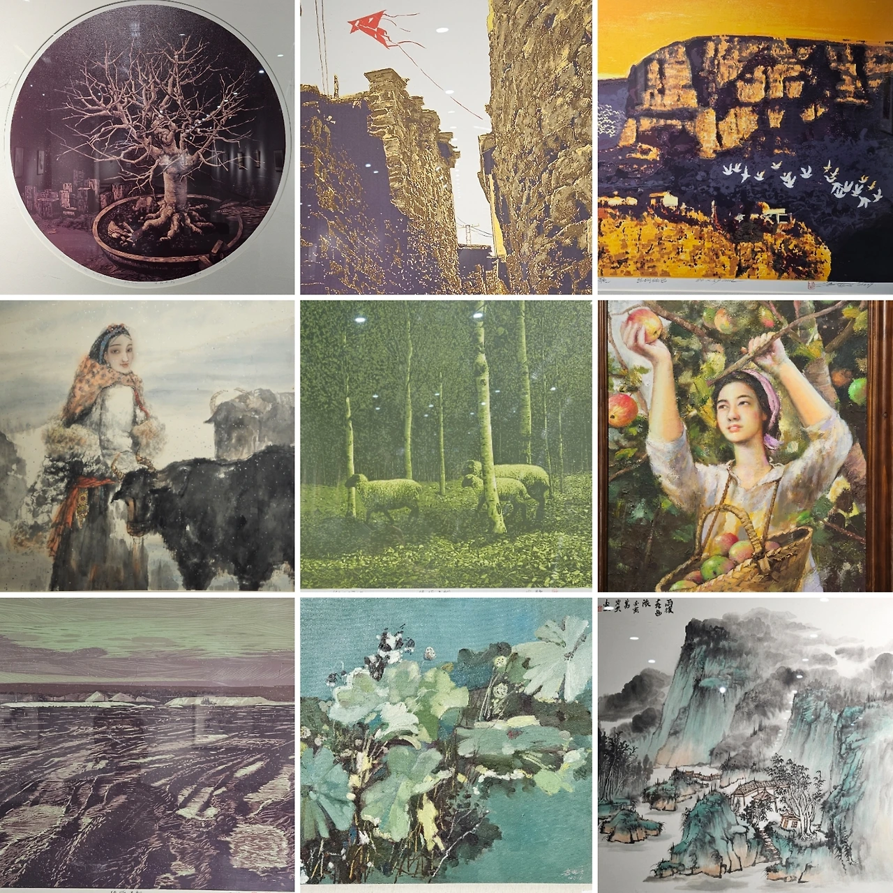 짙은 무채색 계열 물감으로 나목을 그려 낸 <경관(景观)>, 거꾸로 선 사람과 손을 형상화한 <너 아직 괜찮니(你还好吗)>, 투박한 질감의 성곽 길 좁은 하늘 위를 나는 붉은색 가오리연을 그린 <발월 유근(发月留根)>, 깊고 험한 암곡 사이를 나는 백색 군조를 담아낸 <장행비가(长行飞歌)>, 포플러 숲 속에 양(羊) 세 마리가 든 <동행(同行)>, 고양이 정물화 <일세(一岁)>, 황량한 들판 <시월(十月)>, 넓은 초원의 야크 떼와 유목민, 바구니를 목에 걸고 사과를 수확하는 처녀를 담은 치우예(邱野) 작가의 <소녀(少女)>, 청록색이 가득한 까오카오훙(高凯宏) 작가의 <연꽃(荷花)>, 소나무와 매화, 소수민족 여인과 야크를 담은 <인물(人物)>, 말 두 마리를 심플하게 담아낸 작품,...