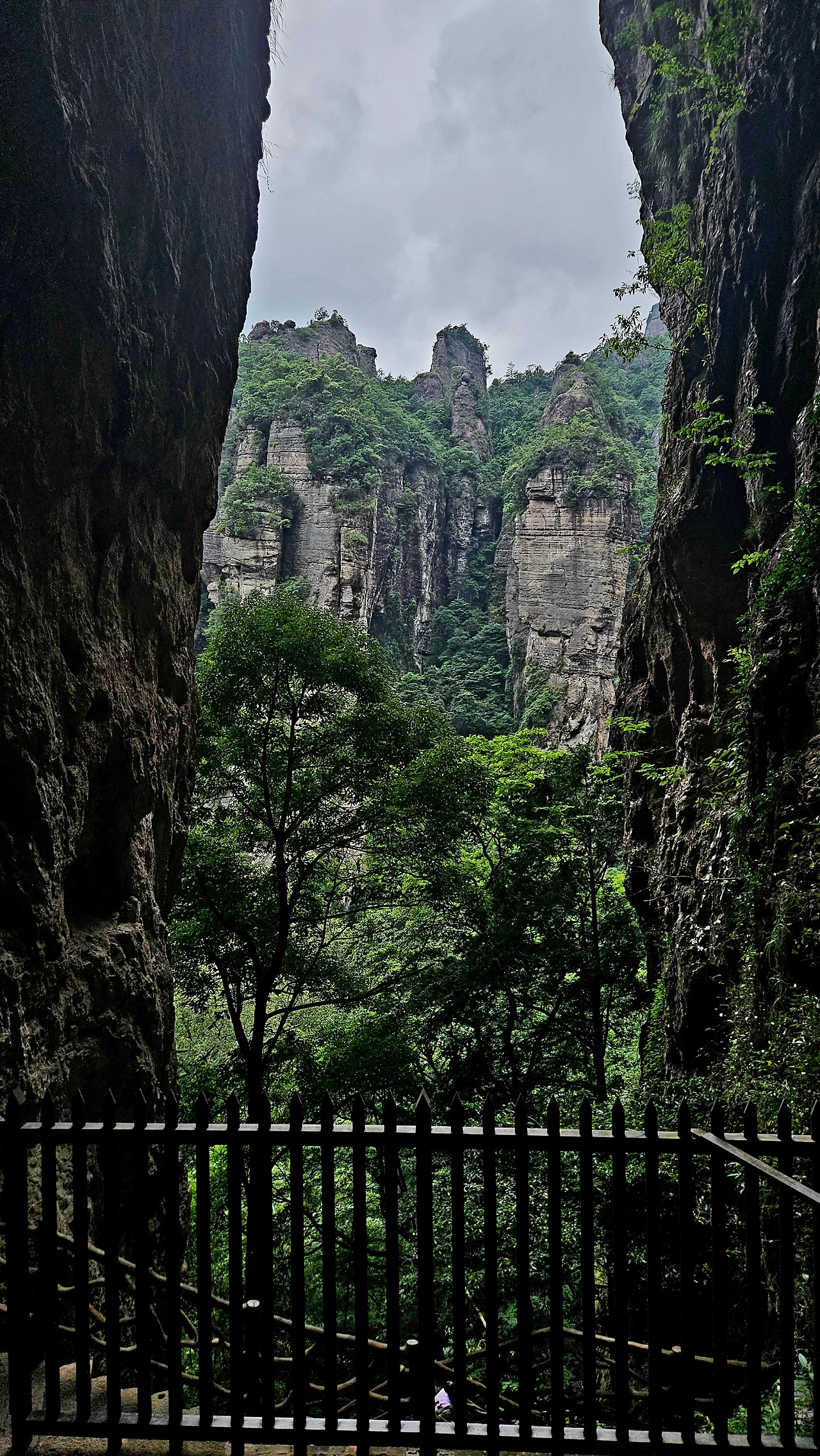 대형 버스에 탑승해서 병풍처럼 높이 솟은 기암 사이로 난 계곡 옆 도로를 따라 삼절폭포 입구를 지나고 링옌 징취(灵岩 景区) 입구에서 내렸다. 미니 버스로 환승하여 계곡 깊숙이 고도를 높여 가다가 좁은 터널도 지나며 따롱치우 징취(大龙湫 景区) 입구에 도착했다.
