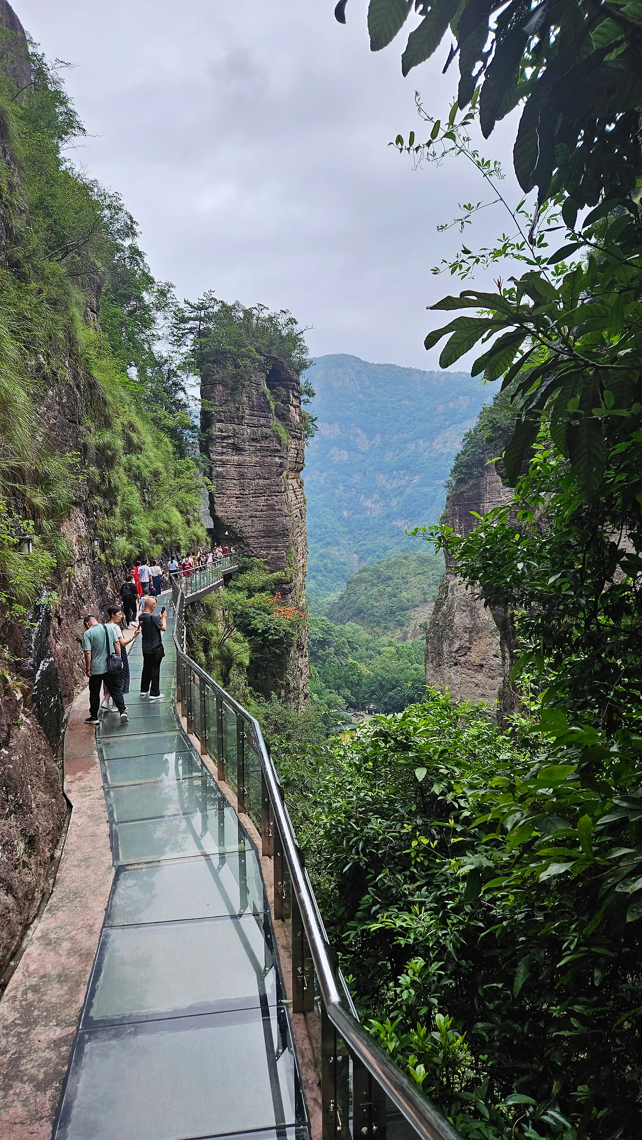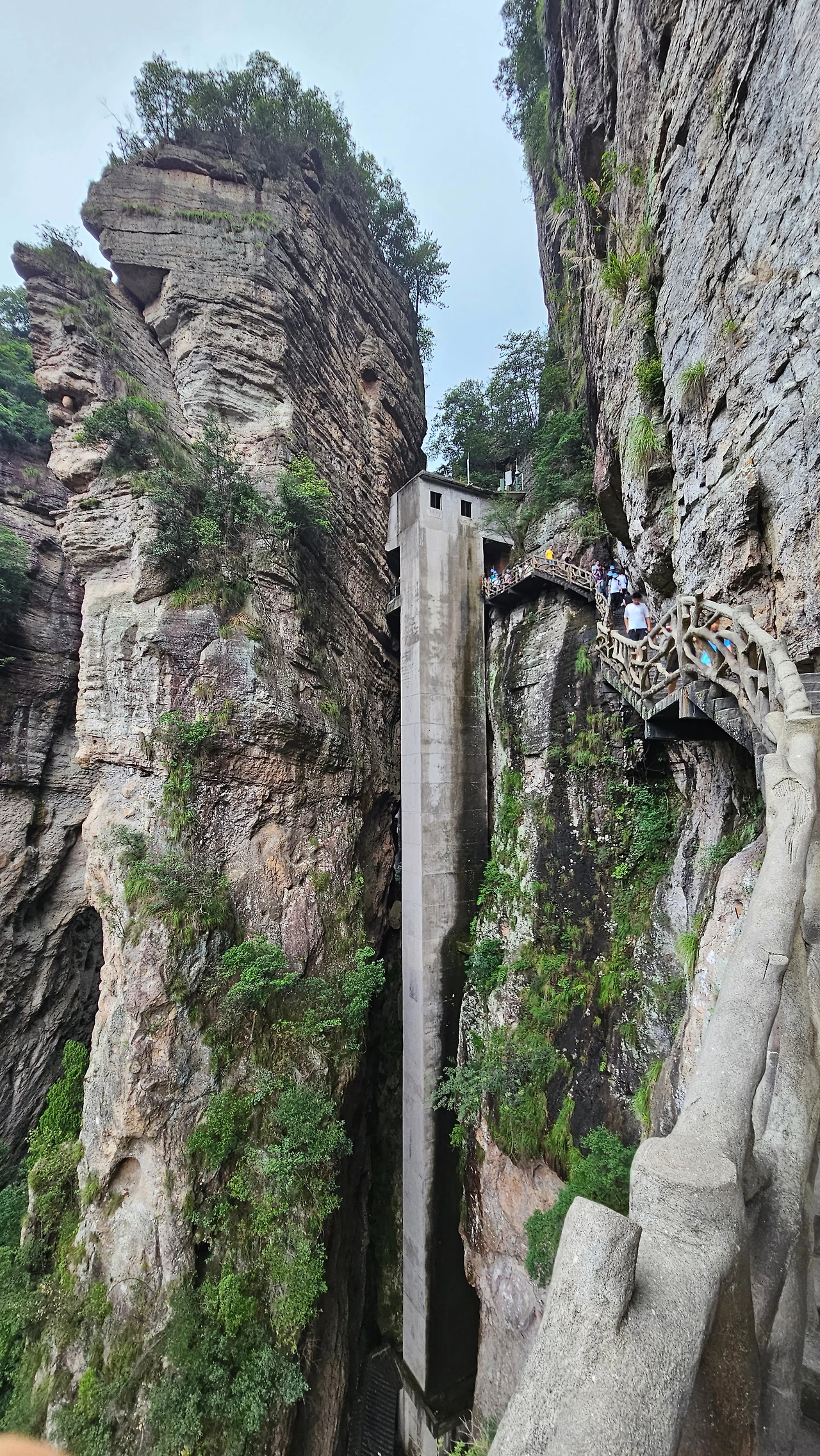 절벽에 난 잔도에서 아래를 내려다보니 정신이 아찔하다. 수직으로 깎아지른 암벽에 기대어 폭포 아래로 설치된 엘리베이터는 운행을 멈추었고, 그 뒤쪽으로 발밑이 훤히 내려다 보이는 와룡곡 유리 잔도가 기다리고 있다.