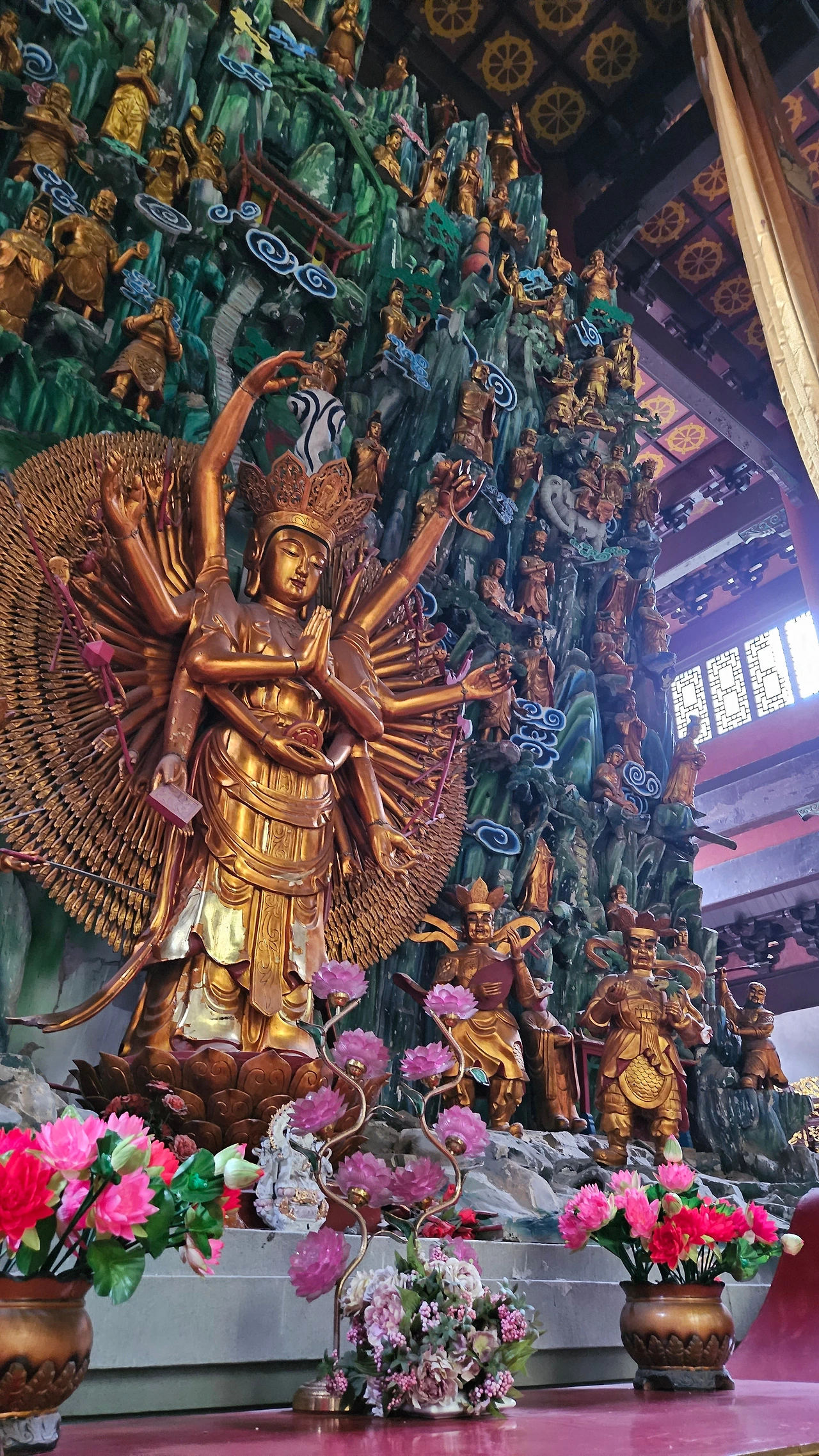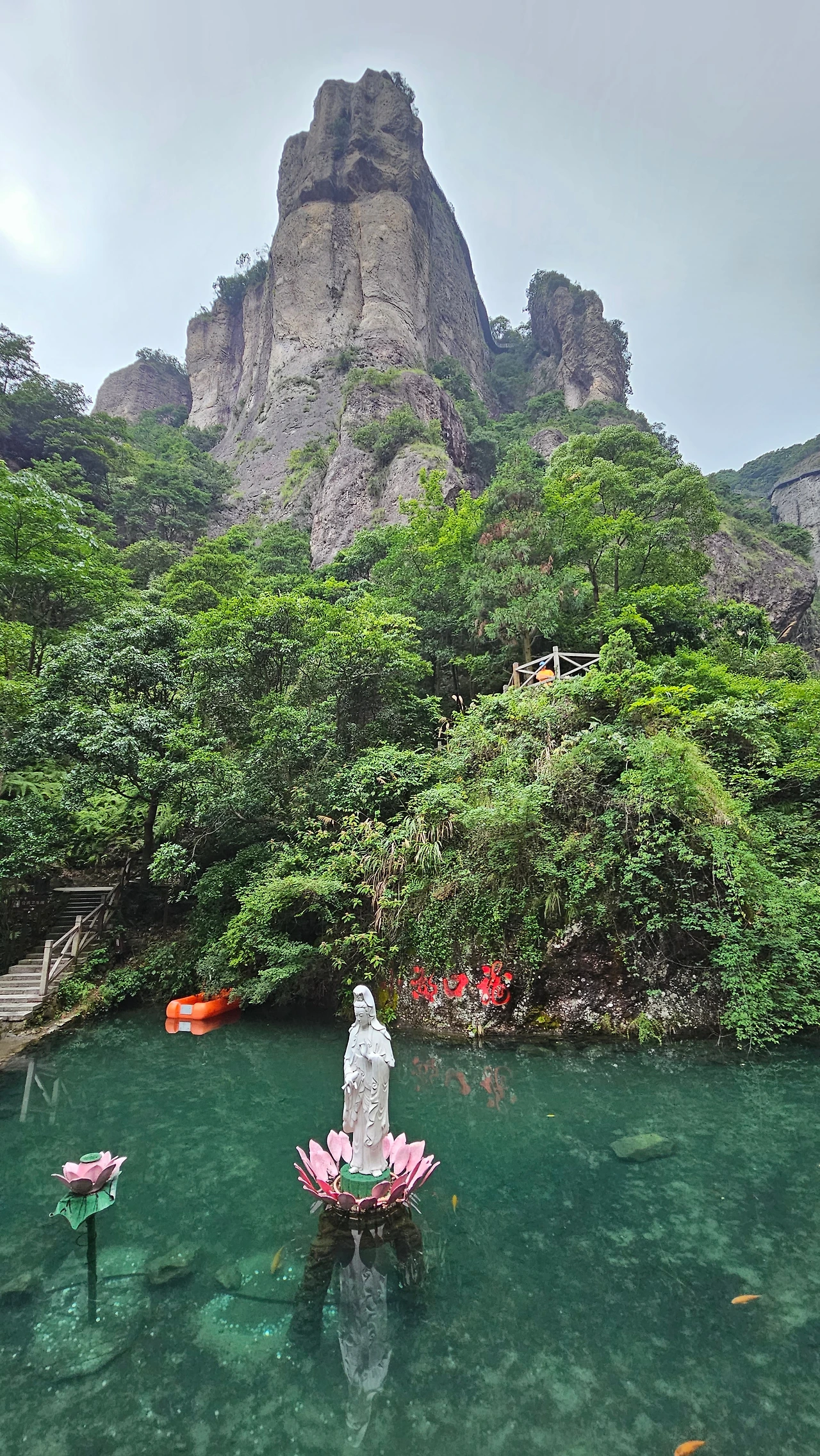 롱커우후 한가운데 수면 위에는 순백의 불상이 연화대 위에 자리하는데 그 모습이 신비롭다. 비단잉어들 유유히 노니는 초록빛 워롱탄의 물은 청량해 보이는 그 모습처럼 차갑고, 15여 미터 높이 폭포를 부챗살처럼 아래쪽으로 펼치며 한기가 도는 바람을 일으킨다.