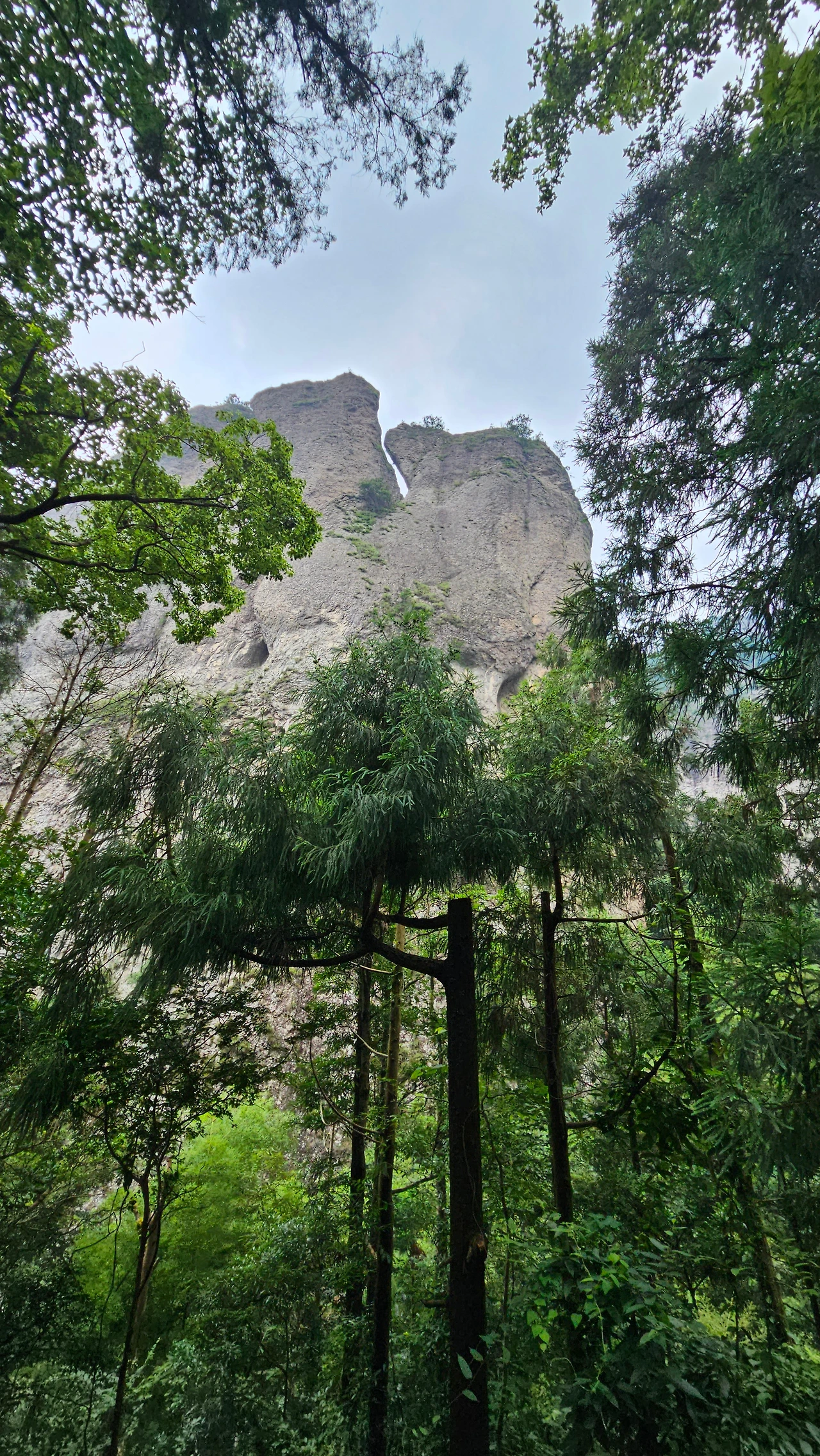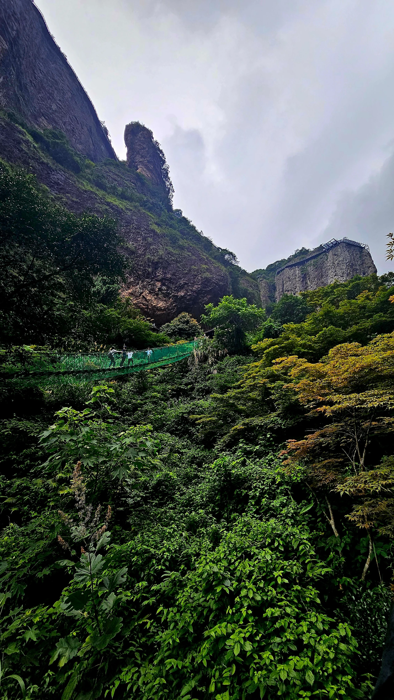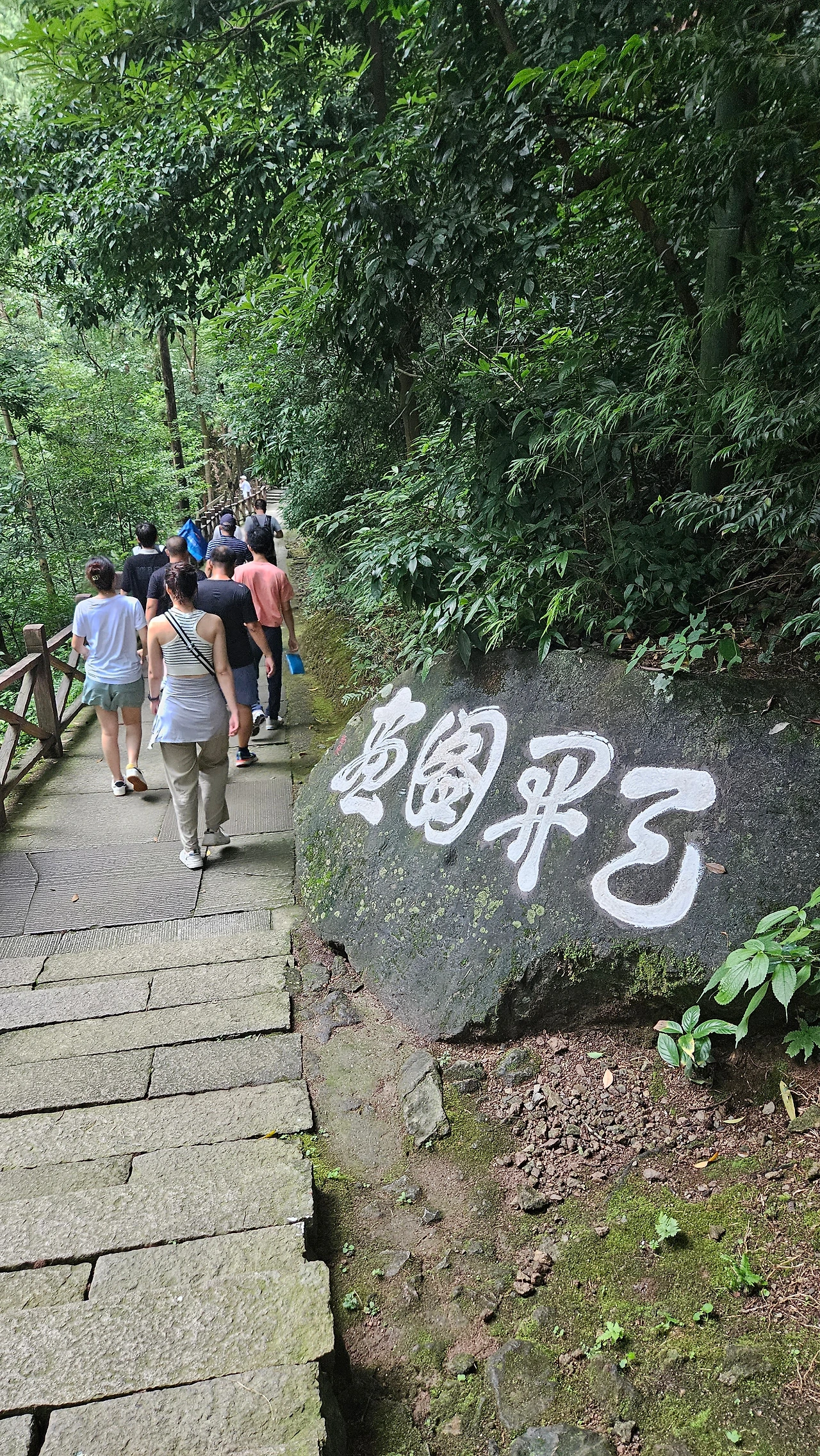사람들이 줄타기 묘기에 눈을 팔고 있는 동안 샤오롱치우(小龙湫)를 둘러보려고 바삐 발길을 계곡 위쪽으로 옮겼다. 일기 예보와는 달리 구름만 끼었을 뿐 비가 오지 않고 햇빛도 없는 숲 속 계곡길이라 공기가 서늘함이 느껴지지만 몸은 온통 땀범벅이다.