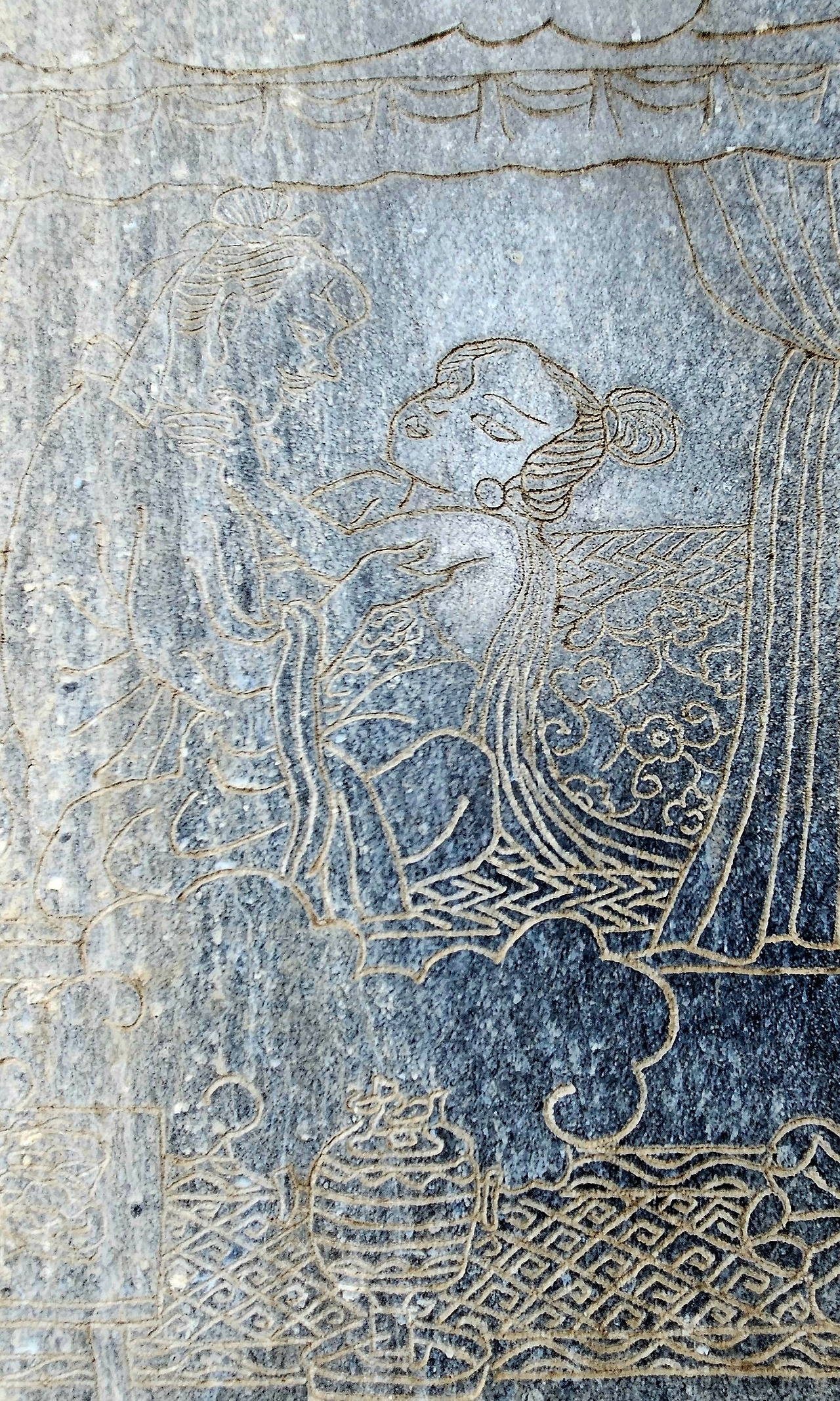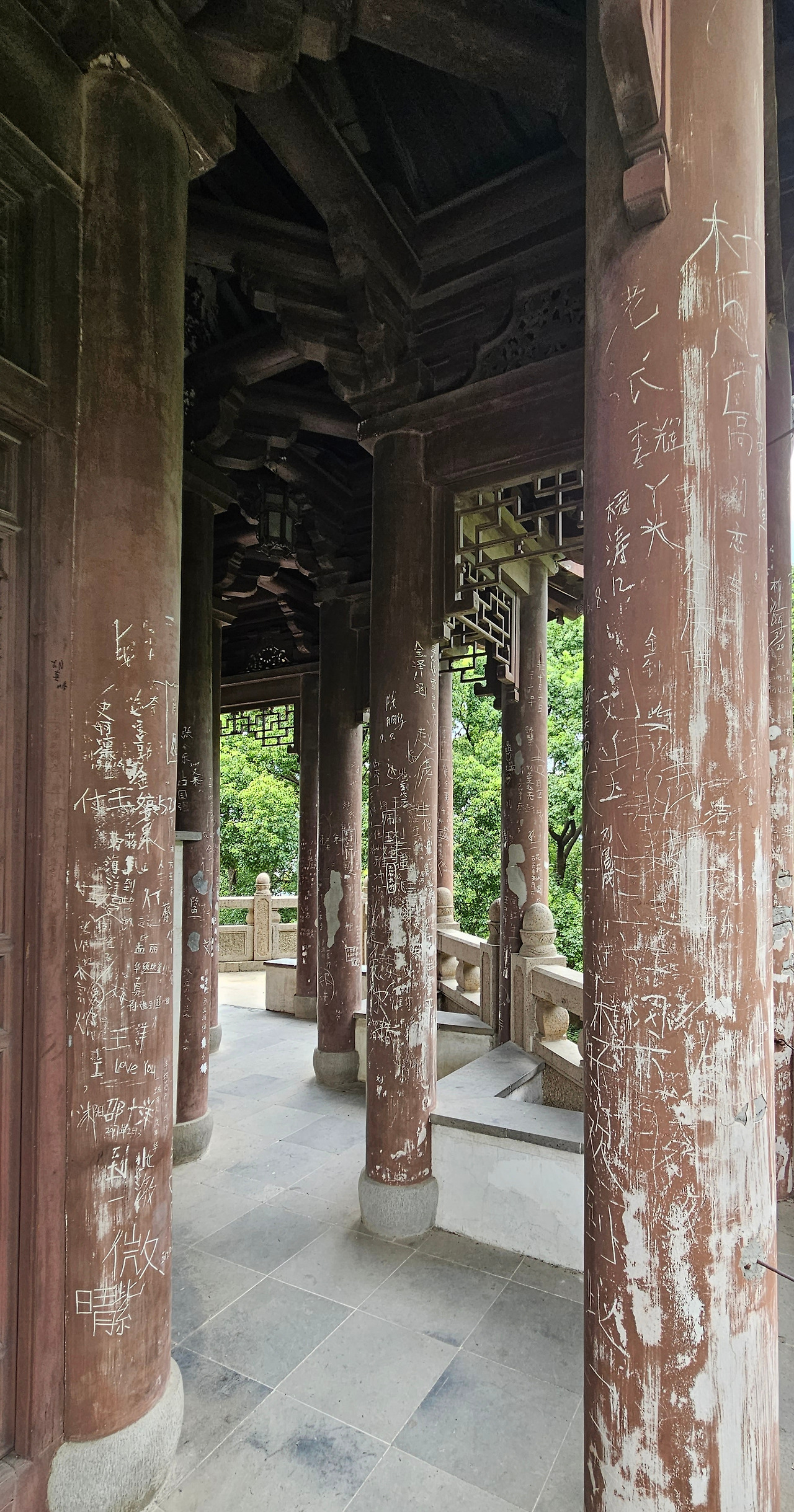 서시의 요청으로 부차는 링옌산 남쪽 향산(香山) 쪽으로 수로 '젠징허(箭泾河)'를 건설하는데, 월나라 구천은 이 수로를 따라 진격하여 오나라를 멸망시켰다고 한다. 당시 오나라 영역에 속했던 지금의 이곳 사람들은 오나라를 패망의 나락으로 떨어뜨린 무대가 된 이곳을 일부러 찾지 않고 누대 기둥에 저렇듯 조롱하듯 낙서를 남긴 것일까?