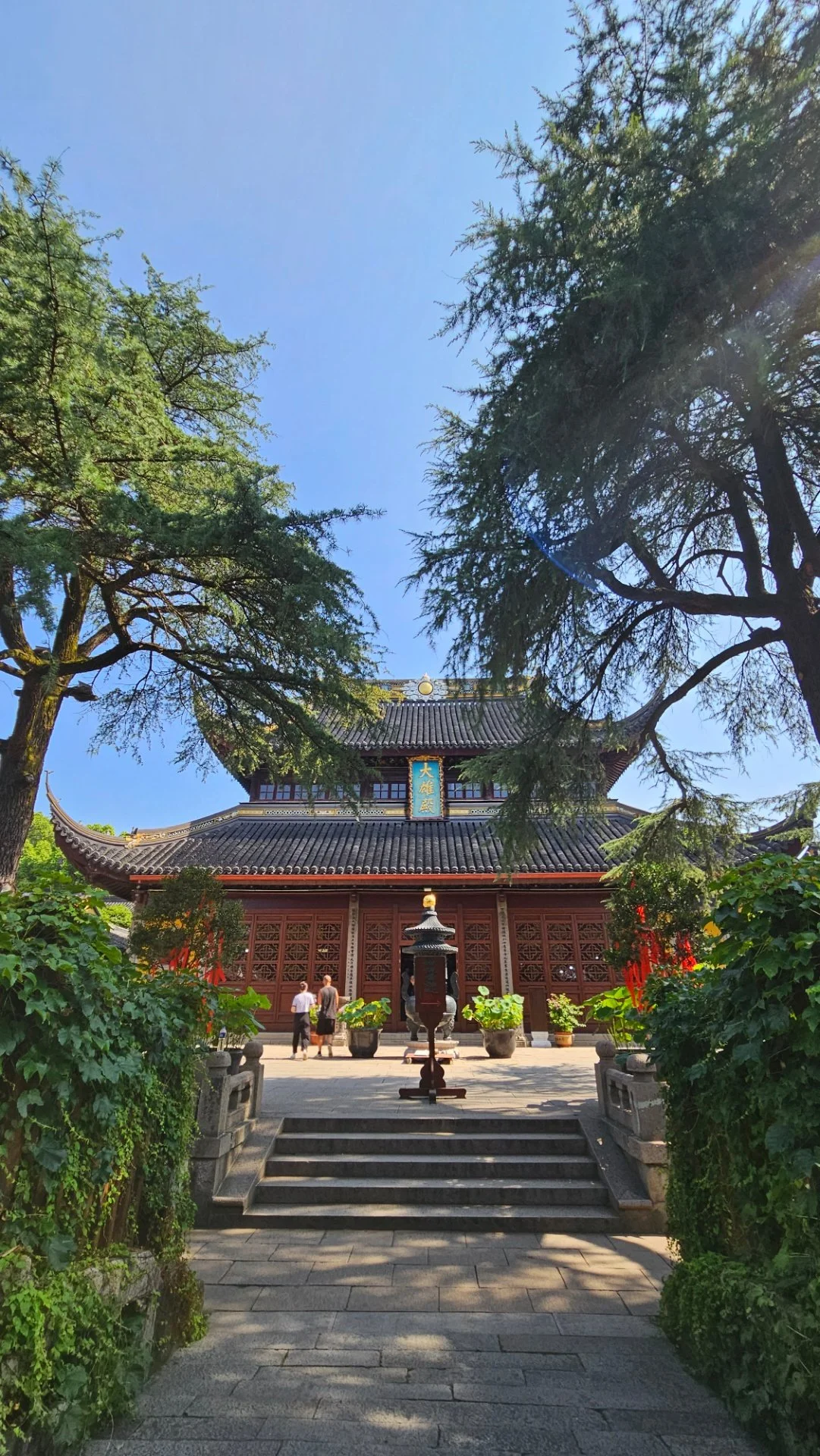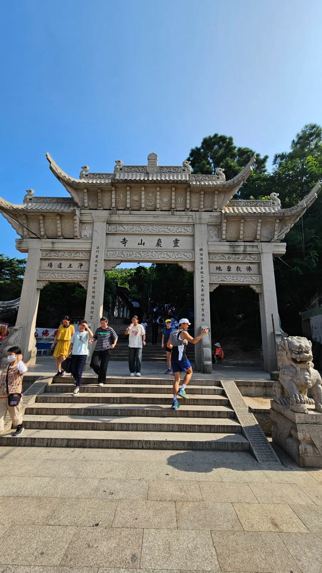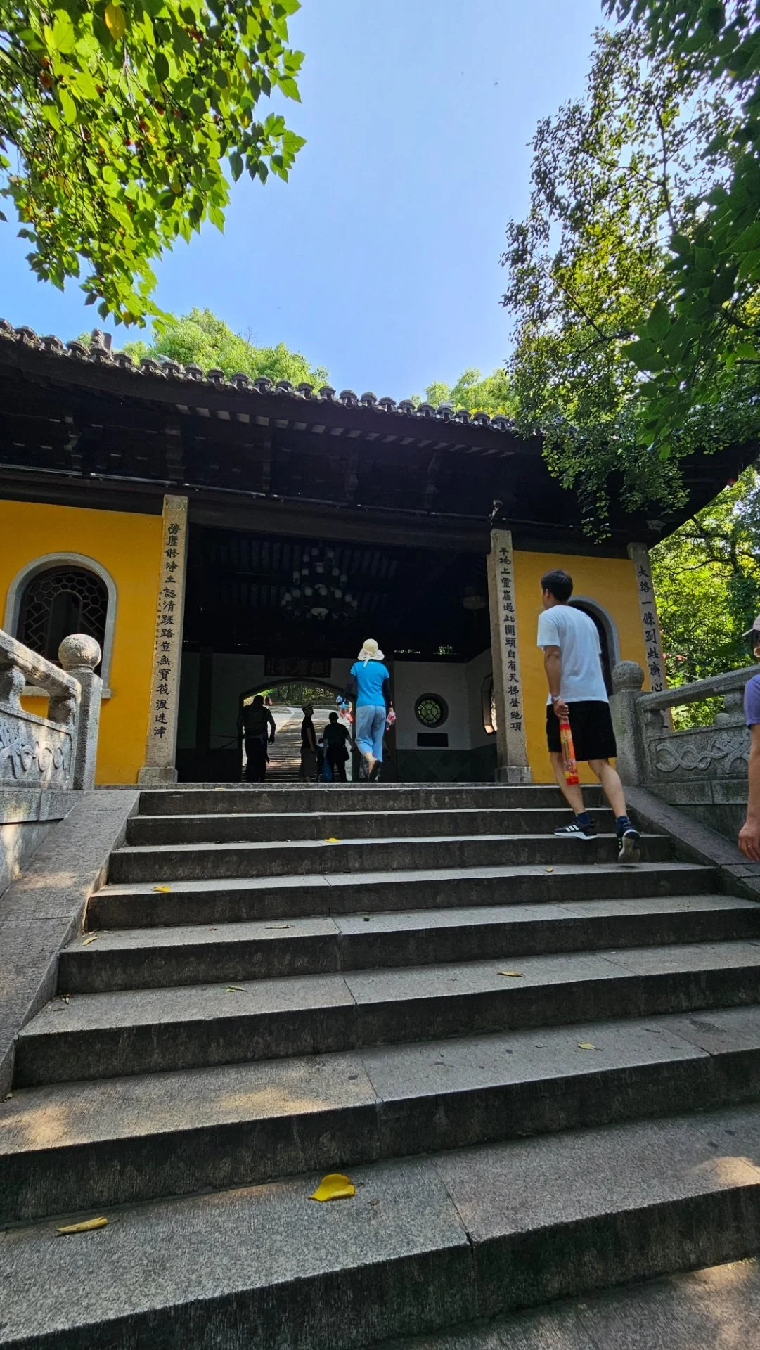 경사가 느슨한 능선마루로 올라서자 영암선사(灵岩禅寺)가 자리한다. 이 사찰은 동진 때 창건되고 당, 송, 명나라 때 이름이 바뀌었다가 청나라 때는 강희제와 건륭제가 남방 순시를 할 때 머물던 행궁으로 바뀌었다고 한다. 입장료 1위엔을 스마트 폰으로 결재하고 사천왕이 수호하는 천왕문을 지나서 경내로 들었다.