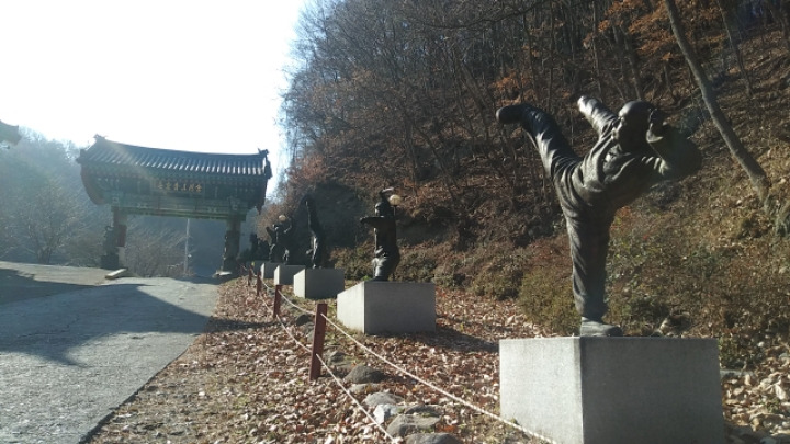 골굴사 입구 길옆에 서있는 다양한 선무도 자세를 취하고 있는 동상들