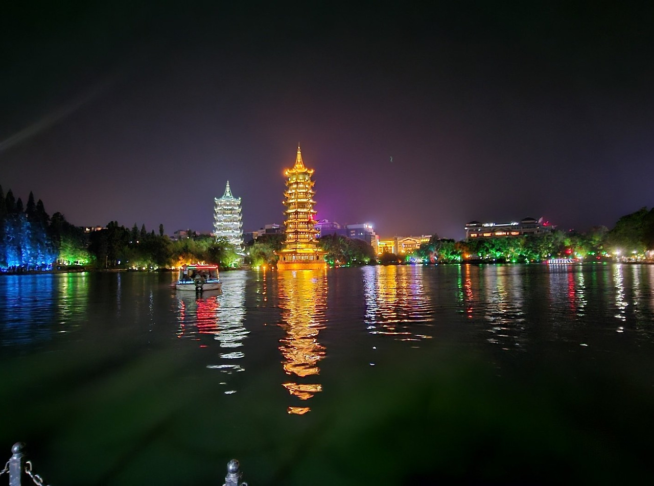 리강의 유람선 선착장을 출발해서 상류로 거슬러 올라가니 조명으로 치장한 강변의 산, 교량, 건물, 오가는 유람선 등이 강물 위에 화려한 유화처럼 저마다의 모습을 투영하고 있다. 푸른빛 붉은빛 등으로 수시로 조명 화장을 바꾸는 해방교(解放桥; 지에팡교) 밑에서는 남녀노소 많은 사람들이 더위를 피하며 더러는 수영을 하는 모습도 보인다.