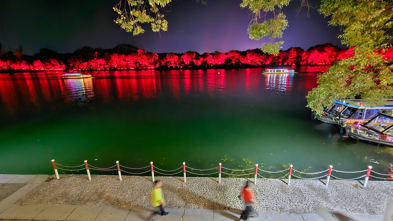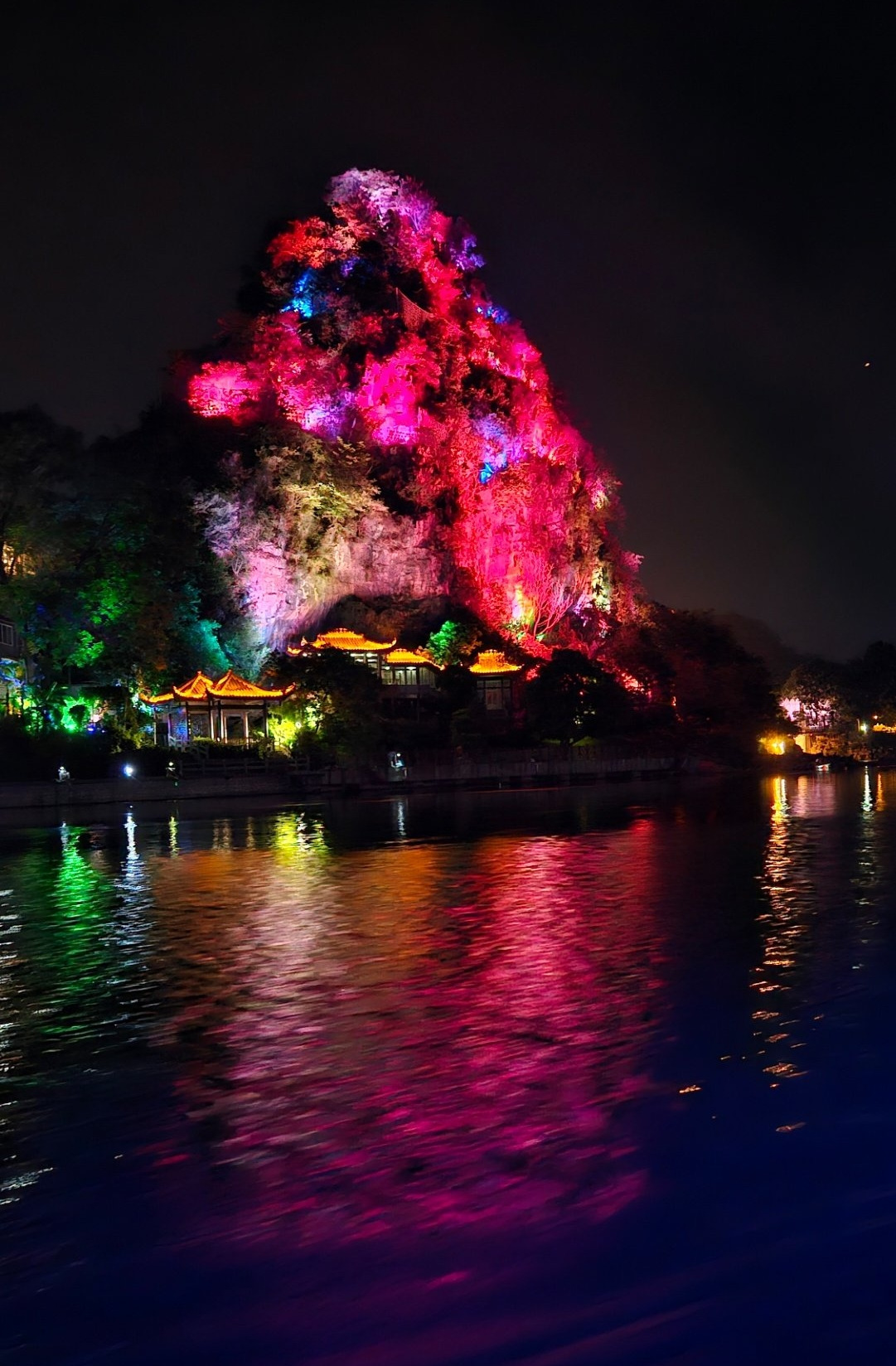 좌측으로 스쳐 지나는 작은 암산을 스크린 삼아 레이저 쇼 퍼포먼스가 펼쳐지고, 명월봉(明月峰; 밍위에펑)은 층층 조명 띠를 두른 크리스마스트리를 보는 듯 아열대 바닷속 다채로운 원색의 산호초를 보는 듯 신비롭다. 유람선은 그 앞에서 한참 동안 꼼짝 않고 머물며 황홀경에 푹 빠져들게 한다.