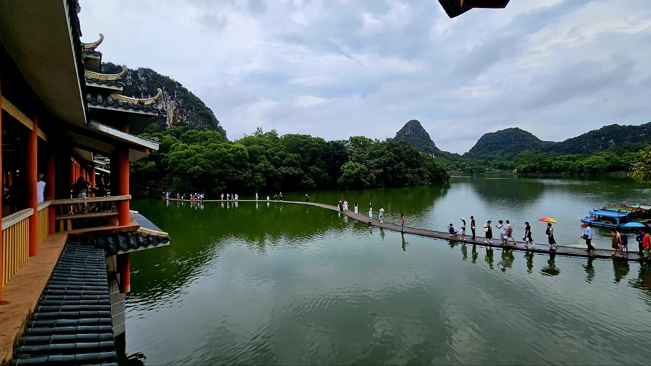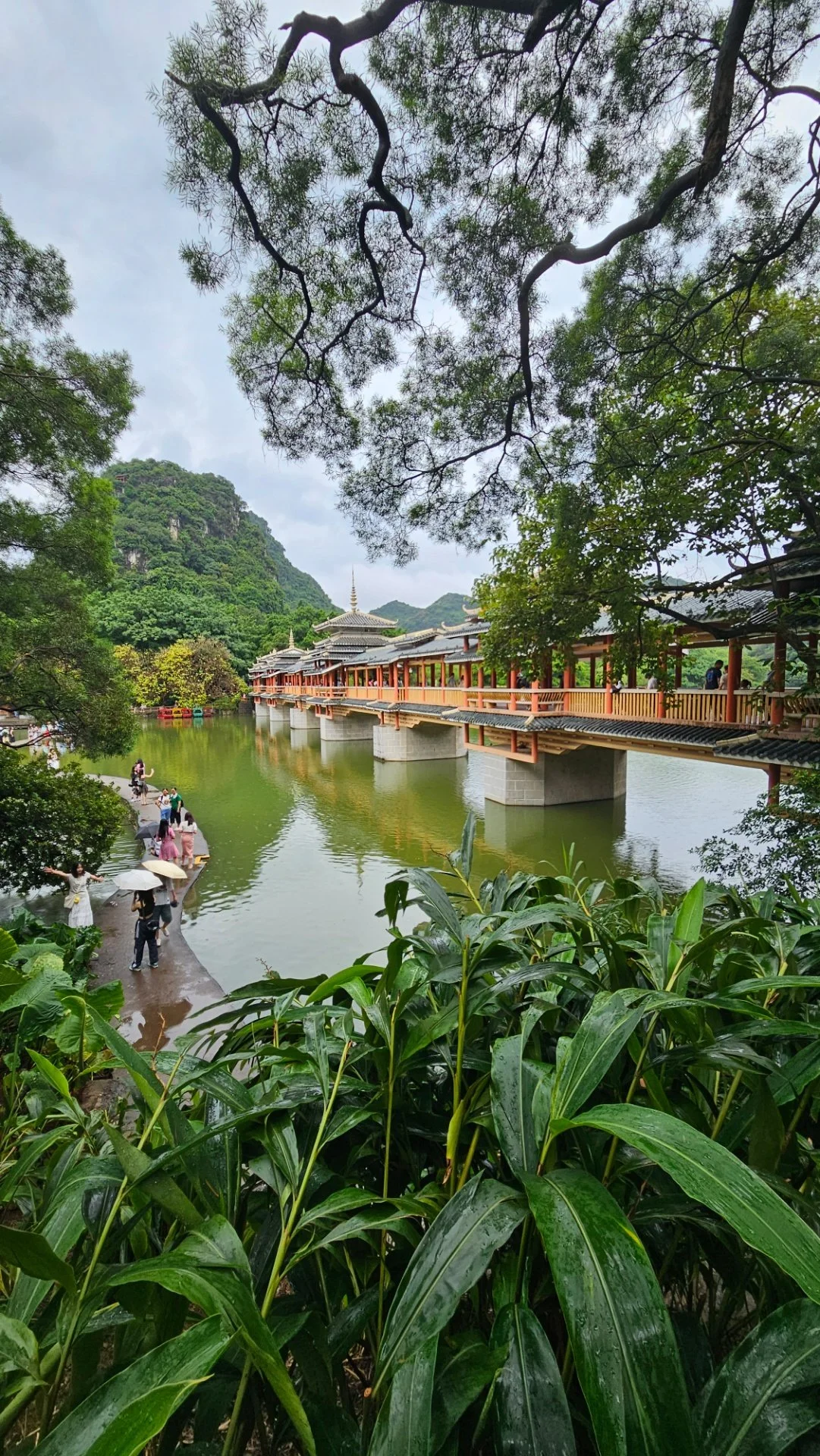 분황사탑 모형을 닮은 구층 지붕의 목조 건물은 동족의 고루(侗寨鼓楼)를 재현해 놓은 것이다. 곧게 솟은 야자수와 비스듬히 누운 활엽수 숲을 지나자 연못 위에 4층 기와 누대 다섯 개와 회랑처럼 지붕이 덮인 풍우교(风雨桥)가 자태를 드러낸다.