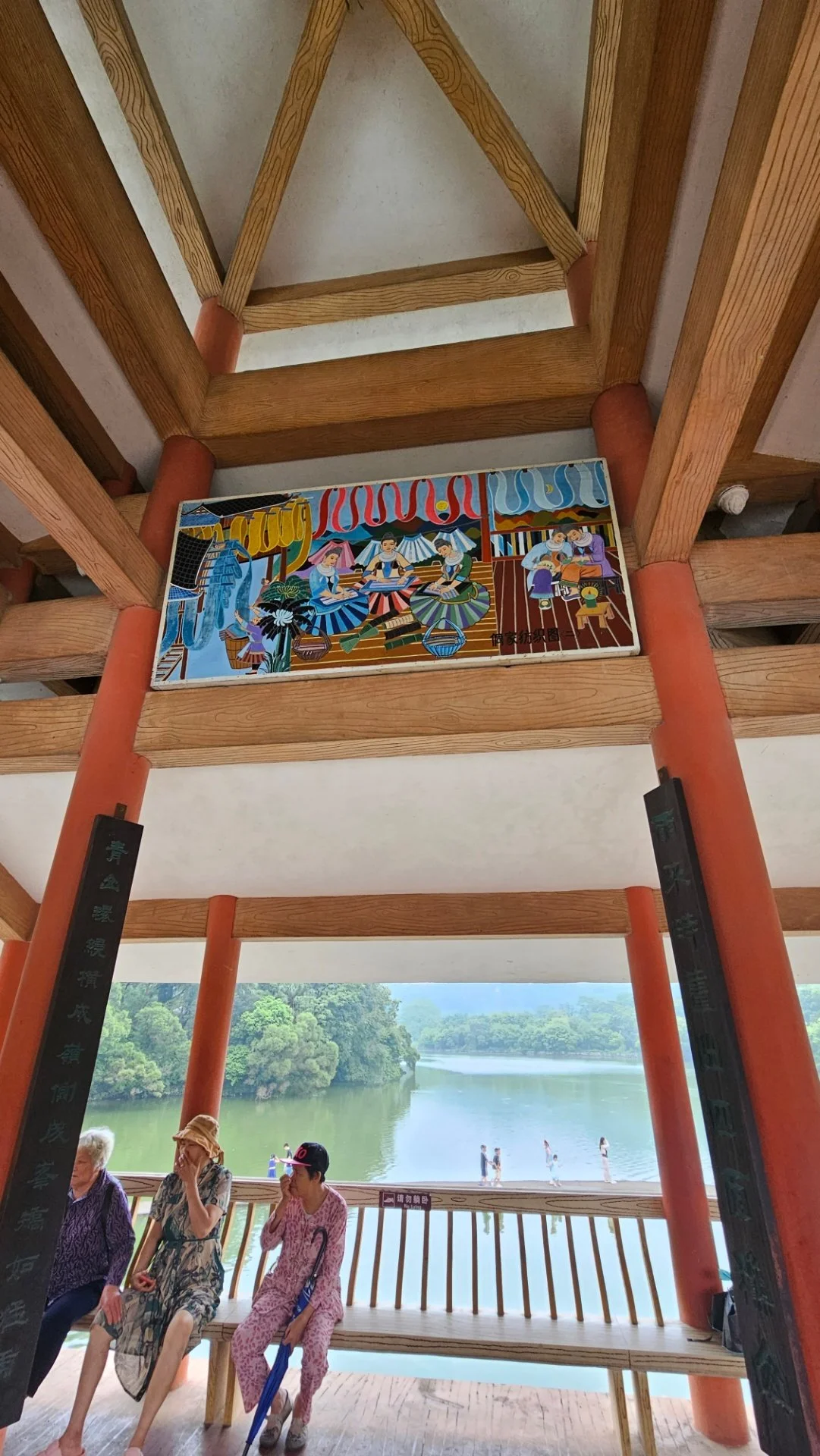 댐처럼 다리 아래 윗 물을 가두고 있는 좁은 보도를 따라 호수를 둘러싼 수려한 봉우리들과 어우러진 발치의 풍우교를 찬찬히 올려다보며 건너편으로 가르 지르며 걸었다. 화교(花桥)또는 복교(福桥)로도 불리는 풍우교는 중국 남방 일부 지역에서 유행하던 다리, 탑, 정자로 구성된 독특한 형태의 건축물이다. 다리 표면에 판자를 깔고 양쪽에 난간과 벤치를 설치하고 기와를 덮은 긴 복도식 목재 구조물이다.