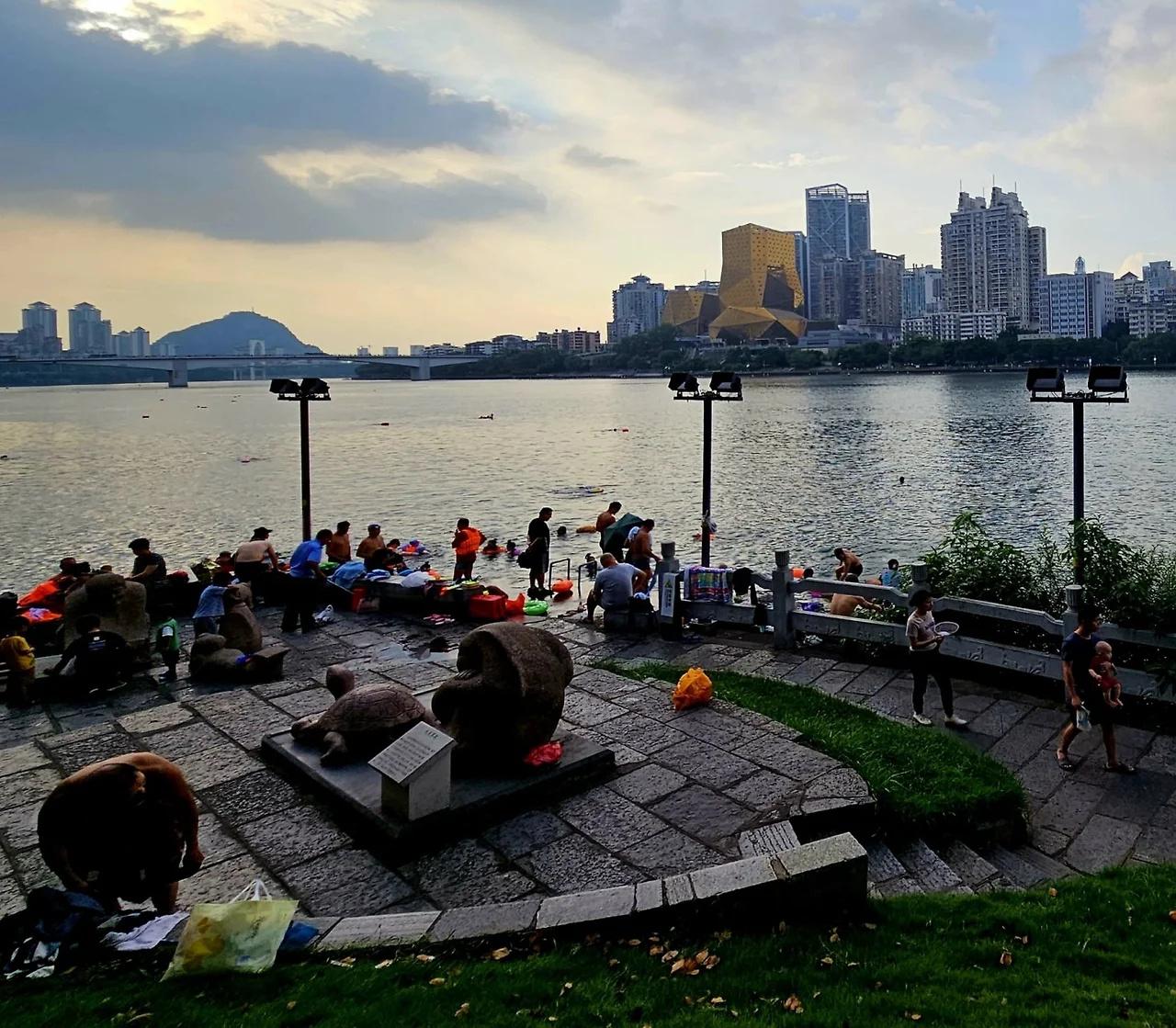 강변 산책로를 따라 쟝빈공원(江滨公园)으로 접어들어 호텔 쪽으로 향한다. 원후이교 부근 강물 속에서 어른과 아이들이 어울려 수영을 즐기고 있다. 그 아래쪽에는 더 많은 사람들이 수영을 하고 있는데 수영장이나 다름없어 보인다. 부럽고 한 번 물속에 뛰어들고픈 마음을 억지로 다독였다. 다음에 류저우에 올 기회가 있고 그때가 여름이라면 반드시 수영복을 챙겨 와서 저들처럼 류강에 몸을 담가 볼 것이다.