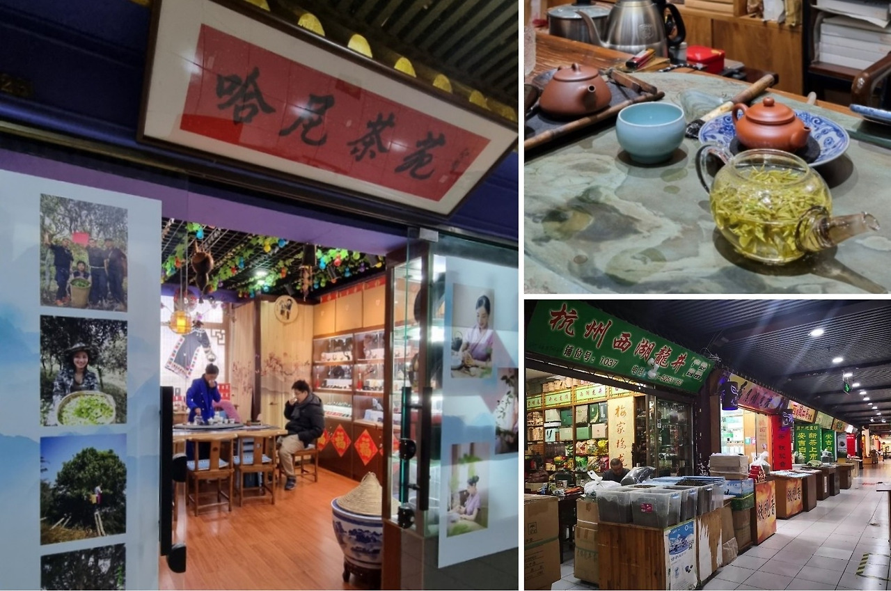 푸젠, 광저우, 타이완, 윈난, 안후이 등 중국 내 유명 차(茶) 산지의 이름을 내건 가게들은 우롱차, 대홍포(大红袍), 철관음(铁观音), 보이(普洱), 루안 과피엔(六安瓜片) 등 중국 각 지역별로 이름난 차 제품들을 채반에 널어놓거나, 크고 작은 통에 담거나, 캔 봉지 등 소매용으로 포장해서 진열하고 있다.