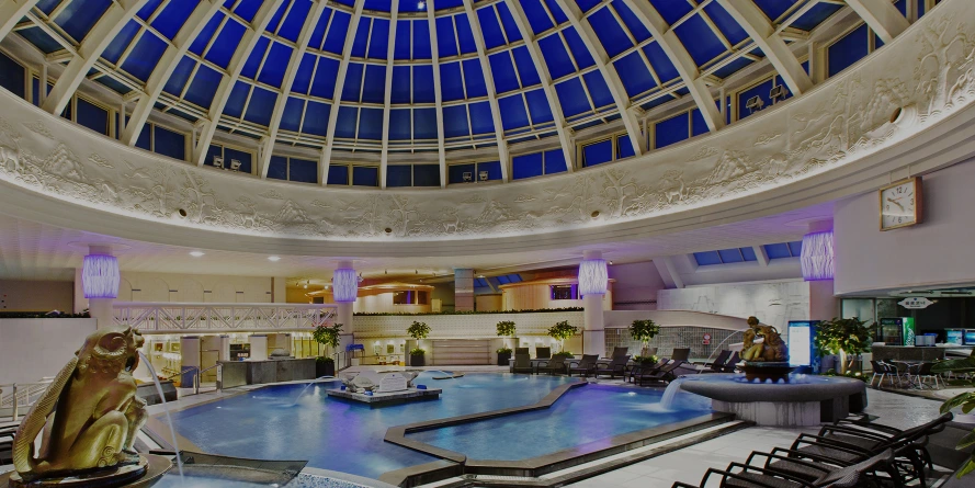 '대온천탕'으로 들어서면 거대한 입욕 탕과 그 위로 대형 유리천장 돔에 또 한 번 압도된다. 돔 기단 가장자리는 거북 구름 사슴 바위 구름 등 십장생이 양각된 장식을 둘렀다.
