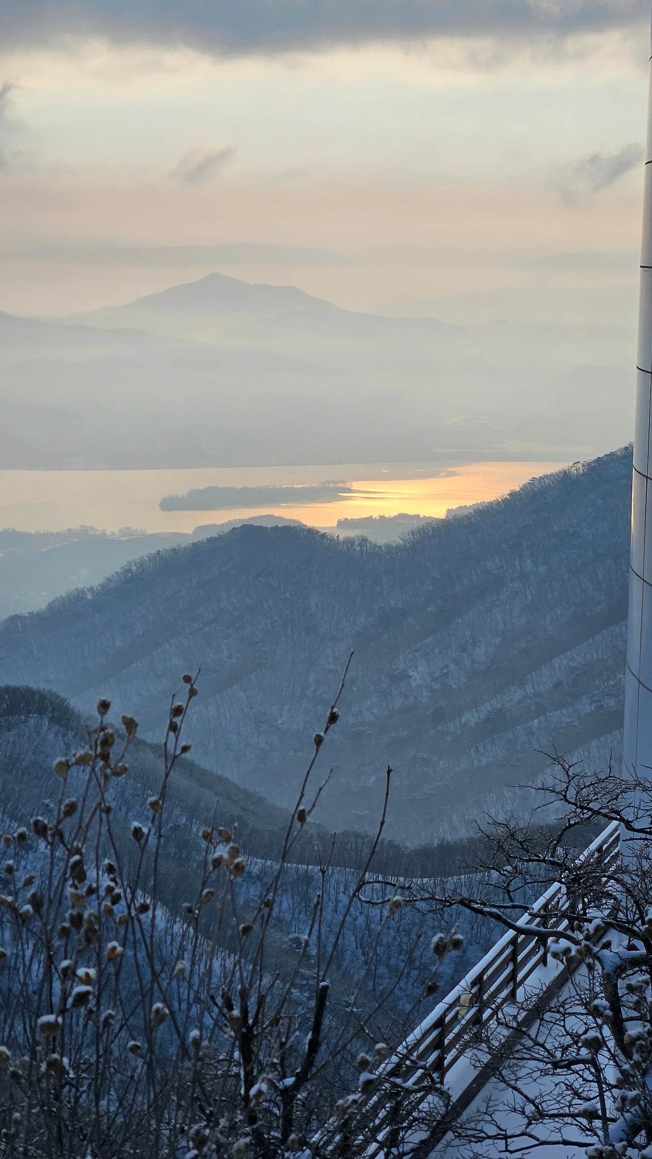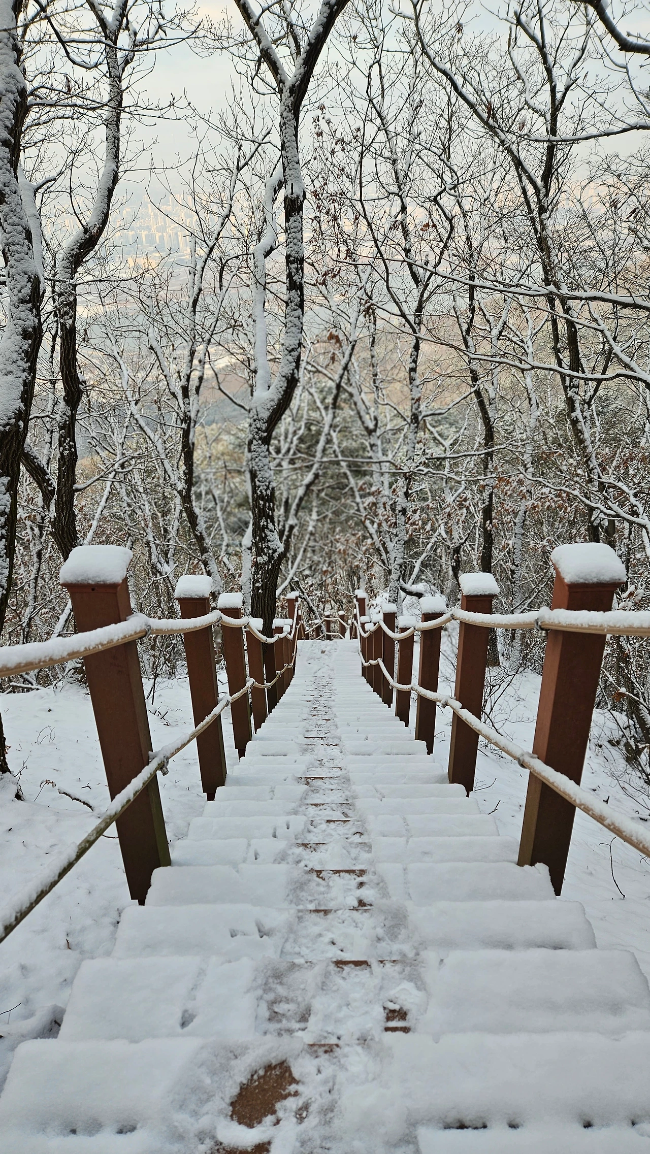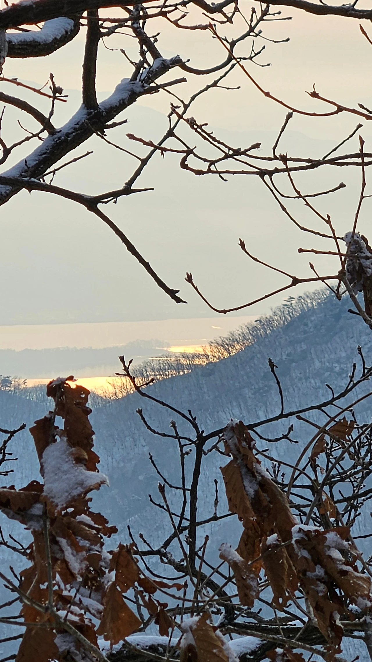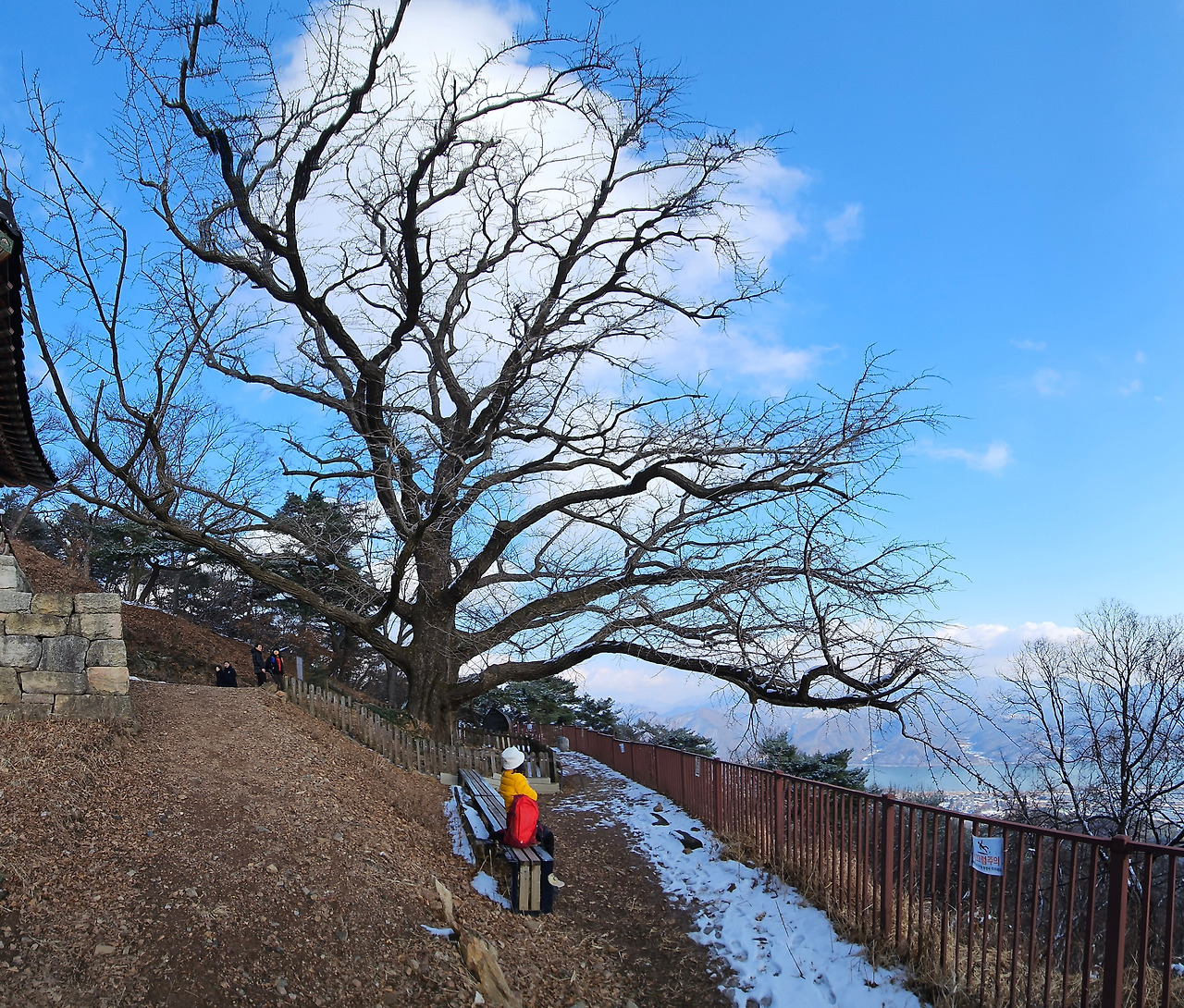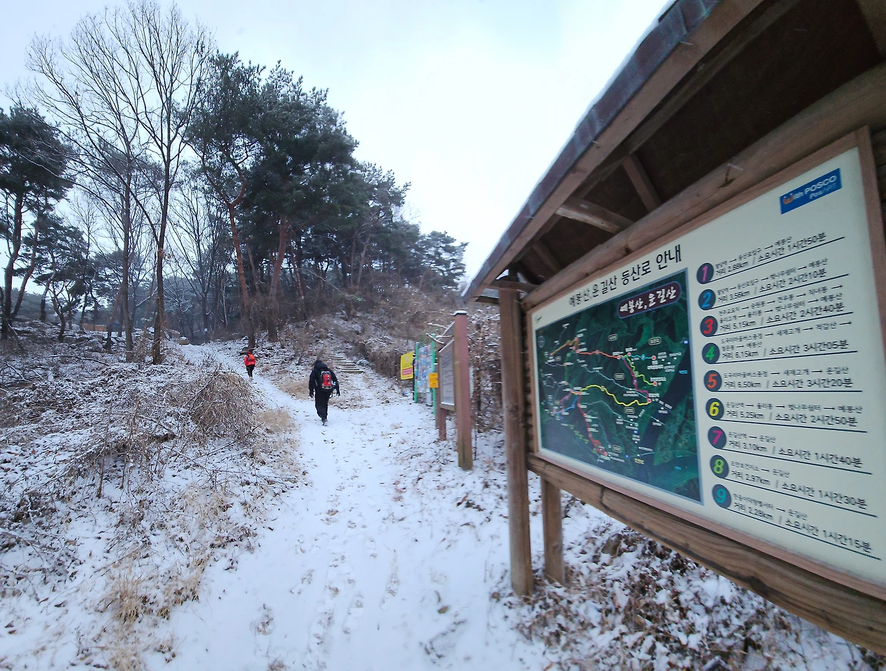 눈길을 오를 때는 발을 얹어 놓듯 지그시 누르면서 천천히 걸어야지, 내던지듯 급하게 걸으면 미끄러져 넘어지는 낭패를 보기 십상이다. 산정 턱밑에서 비박을 하고 내려온다는 남성 한 분과 인사를 나눴다. 큰 배낭을 벤치에 올려 두고 틈틈이 말을 나누며 휴대폰을 들여다보는 그, 비박의 감흥을 기록하며 되뇌고 있는 것인지도 모른다. 강설 예보에 들뜬 마음으로 무게가 16kg쯤 된다는 배낭을 챙겨 들고 하루 전 산정으로 올랐을 것이다.
