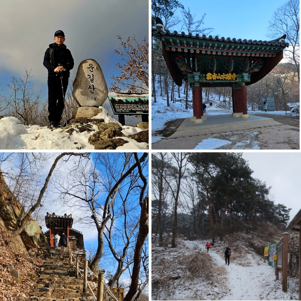 눈을 이고 있는 나무들은 흰 껍질이 고귀해 보이는 박달나무처럼 보인다. 비탈길로 작은 능선에 올라서자 고사한 노송 두 그루가 서있다. 새하얀 눈이 쌓인 산비탈에 앙상한 가지에 껍질까지 벗겨진 모습이 처연해 보이지만, 두 그루가 친구처럼 사이좋게 나란히 서있어 다행이다. 두어 번 작은 봉우리를 오르고 내리자, 깊이 주저앉은 능선 저 멀리 우뚝 서있는 운길산 정상 봉우리가 눈에 들어온다. 산정으로 오르는 나무 계단길 주변 나무 위에서 까마귀들이 우악스럽게 짖어 댄다.