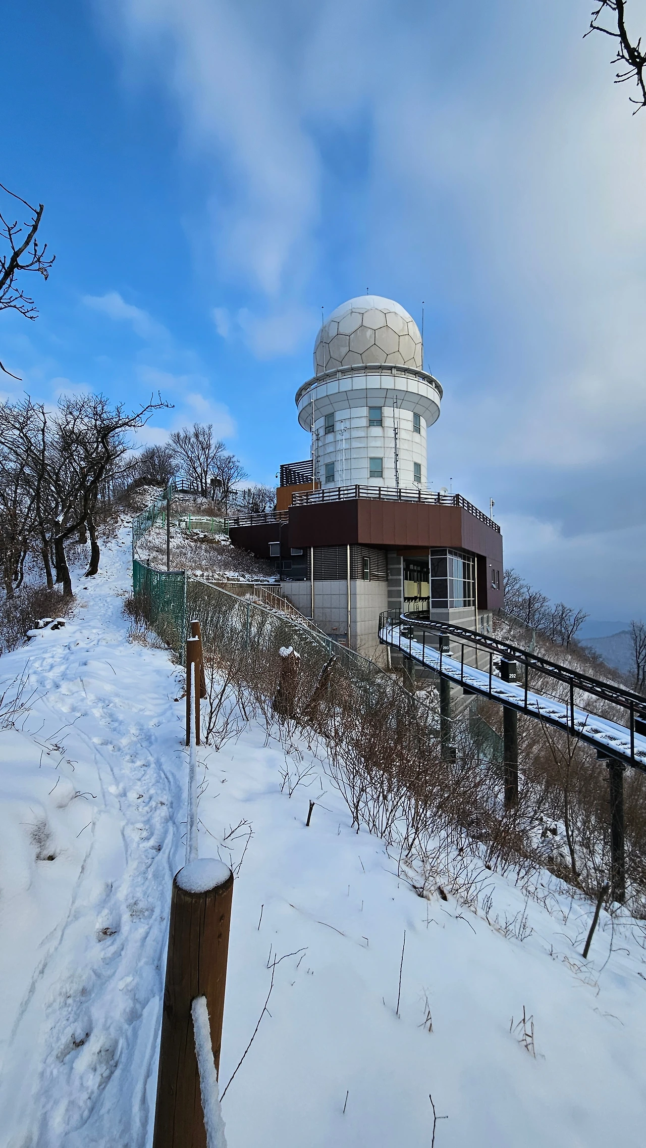 율리봉 쪽으로 향하는 그분을 뒤쫓아 계곡 옆길을 따라 오르니, 관측소 베이스 건물이 나온다. 눈을 쓸고 있던 또 다른 관측소 근무자의 율리봉 코스는 가팔라서 오르기 힘들다는 말에 따라, 예전에 들머리로 삼던 코스로 회귀해서 산행을 시작했다.