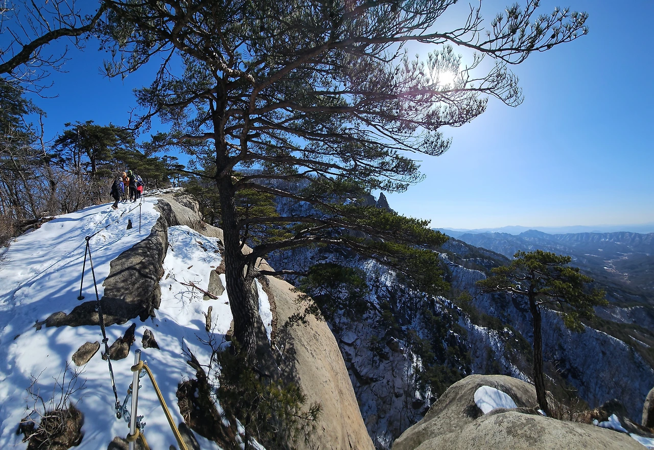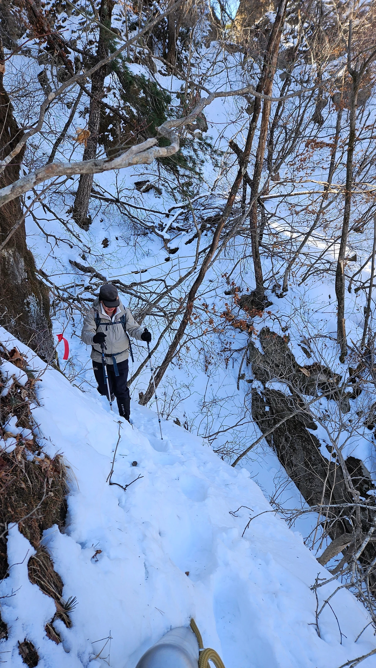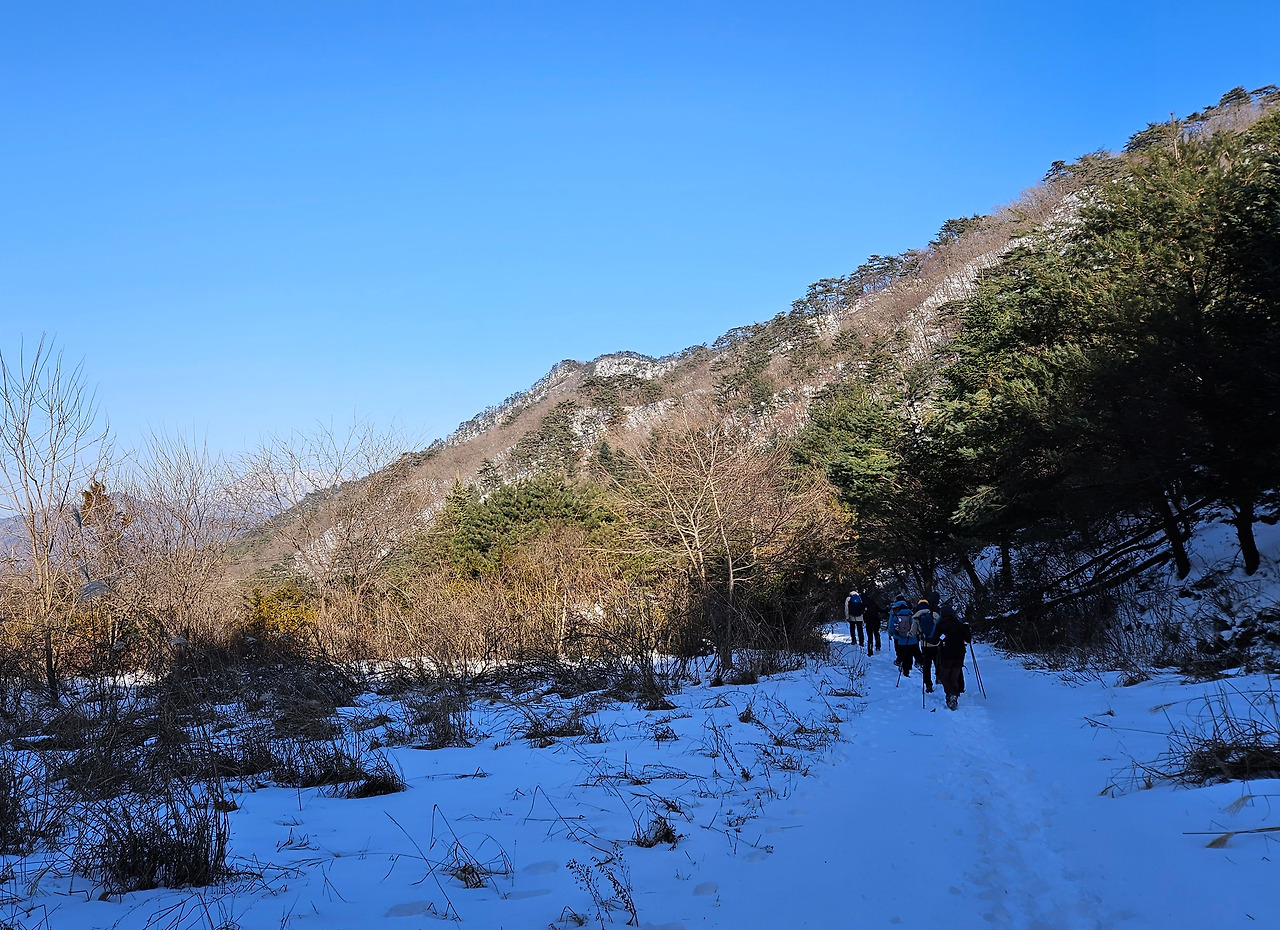많은 눈과 거센 바람에 꺾이고 넘어져 길을 막아선 나무 둥치를 넘거나 몸을 수그려 통과하고 비탈에서 엎어지고 넘어지기를 수없이 반복했다. 앞서서 간 산객의 눈 속으로 깊게 파인 발자국을 징검다리 건너듯 따라 밟으며 진행했지만 두어 번 길을 잘못 들어 고행이 배가되기도 했다. 뒤따라 오던 젊은 산우 2명에게 길을 비켜 주며 앞서거니 뒤서거니 했다.