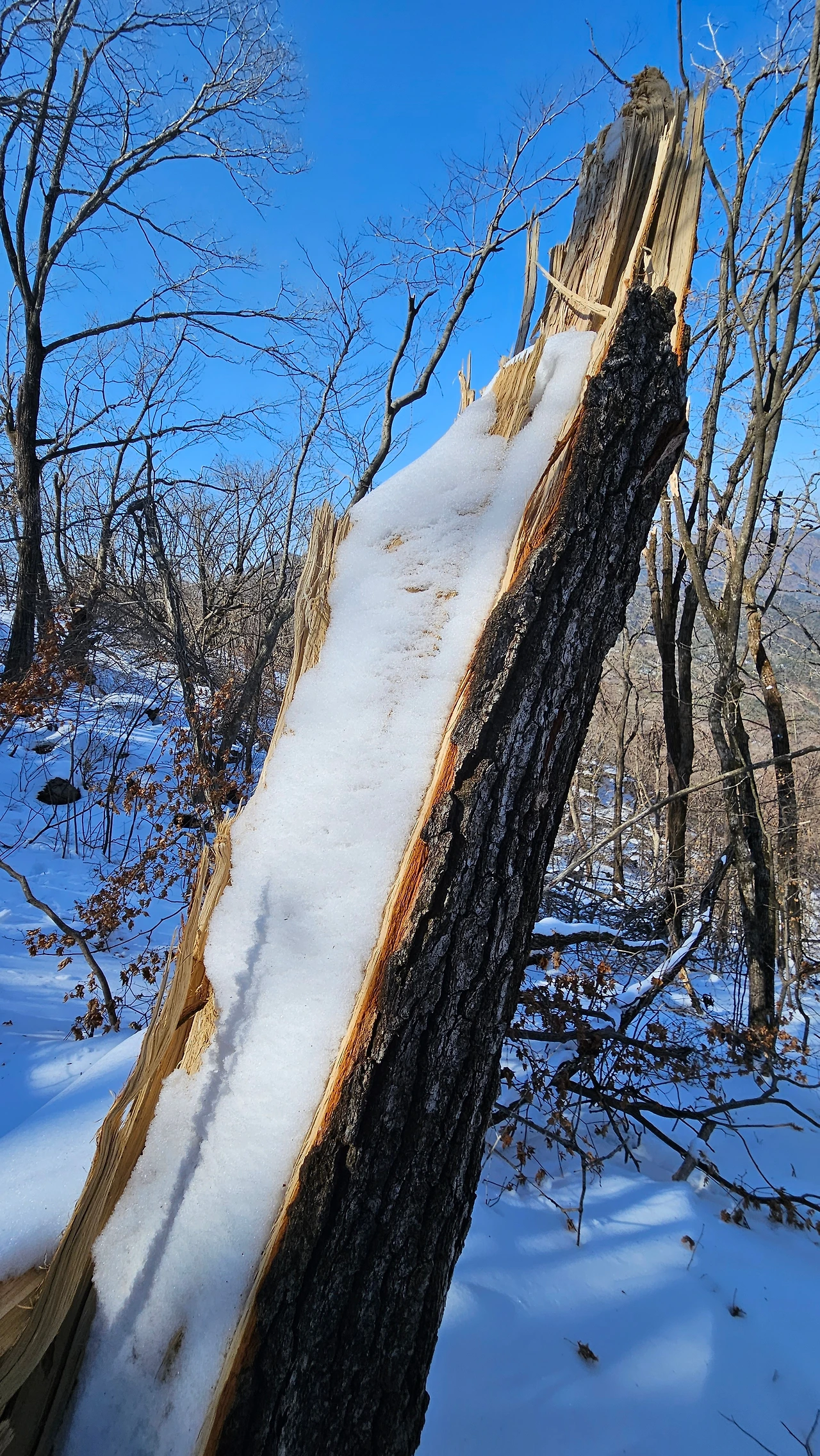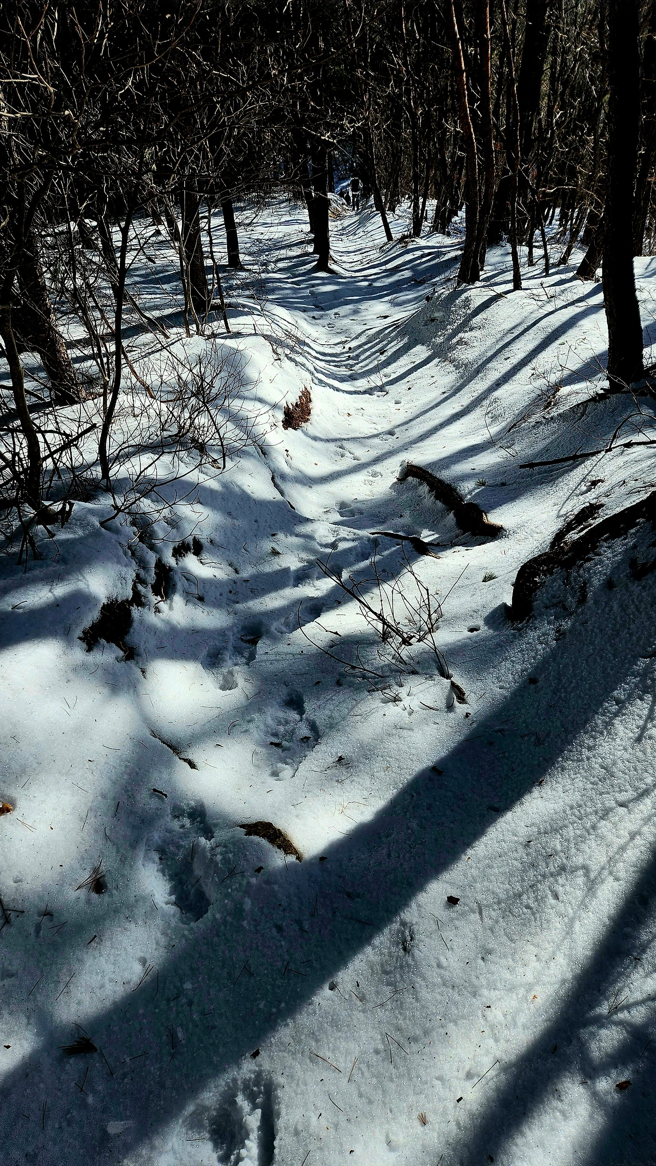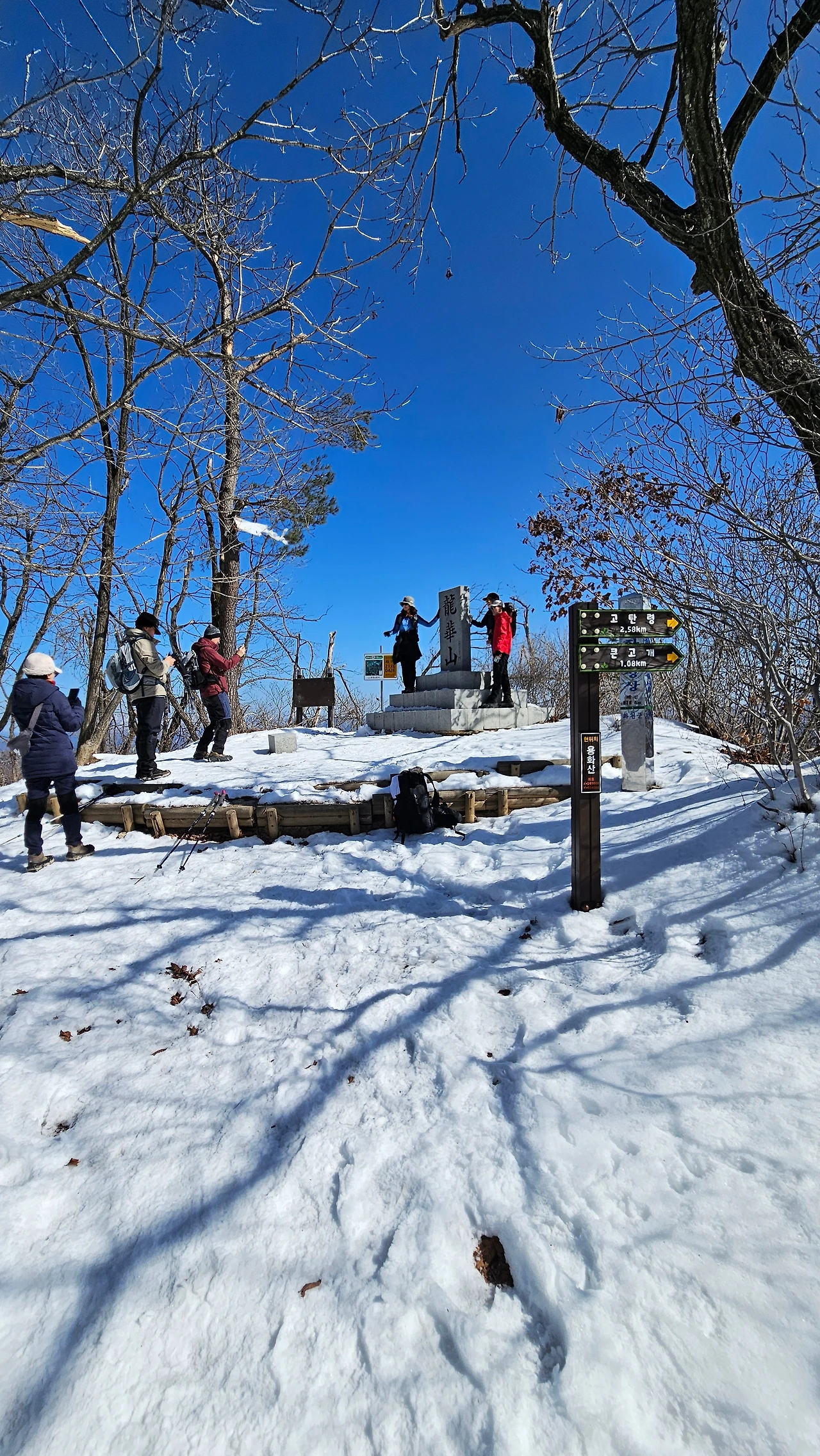 많은 눈과 거센 바람에 꺾이고 넘어져 길을 막아선 나무 둥치를 넘거나 몸을 수그려 통과하고 비탈에서 엎어지고 넘어지기를 수없이 반복했다. 앞서서 간 산객의 눈 속으로 깊게 파인 발자국을 징검다리 건너듯 따라 밟으며 진행했지만 두어 번 길을 잘못 들어 고행이 배가되기도 했다. 뒤따라 오던 젊은 산우 2명에게 길을 비켜 주며 앞서거니 뒤서거니 했다.