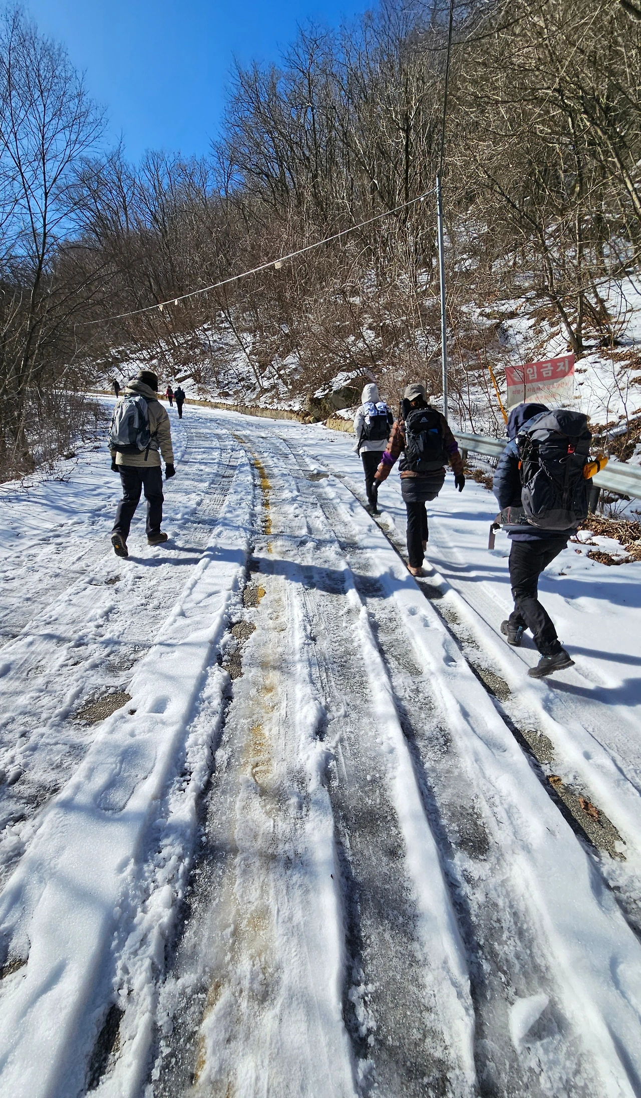 버스가 예정되었던 시각보다 50여 분 늦은 09:50 경 당초 계획상 들머리였던 큰고개에 1.8km 못 미친 아래쪽에 일행을 내려놓았다. 길이 얼어서 큰고개까지 접근이 어렵다는 것이다.