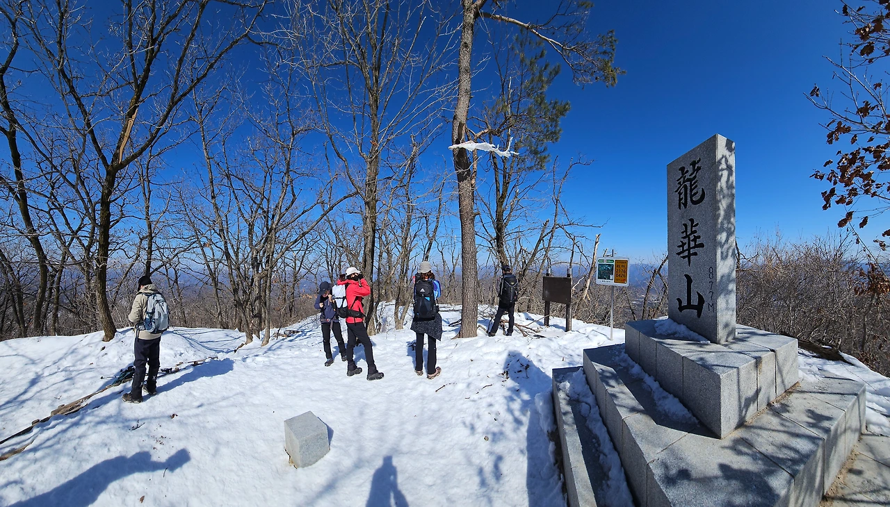 산행 버스에서 내린 지 약 두 시간 만에 사각의 화강석 삼단 기단 위에 어깨 높이의 정상 표지석이 자리한 해발 878미터 용화산 꼭대기로 올라섰다.
