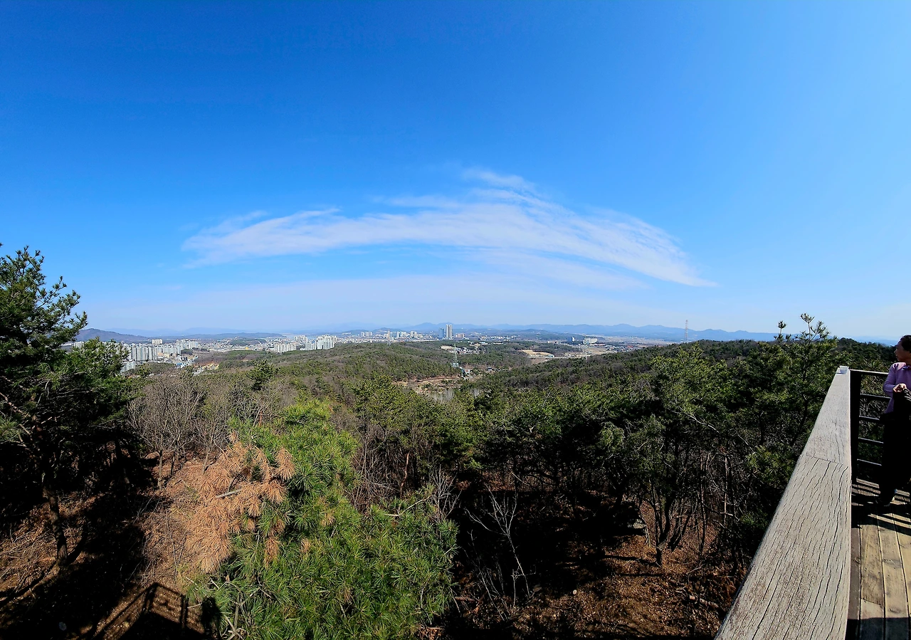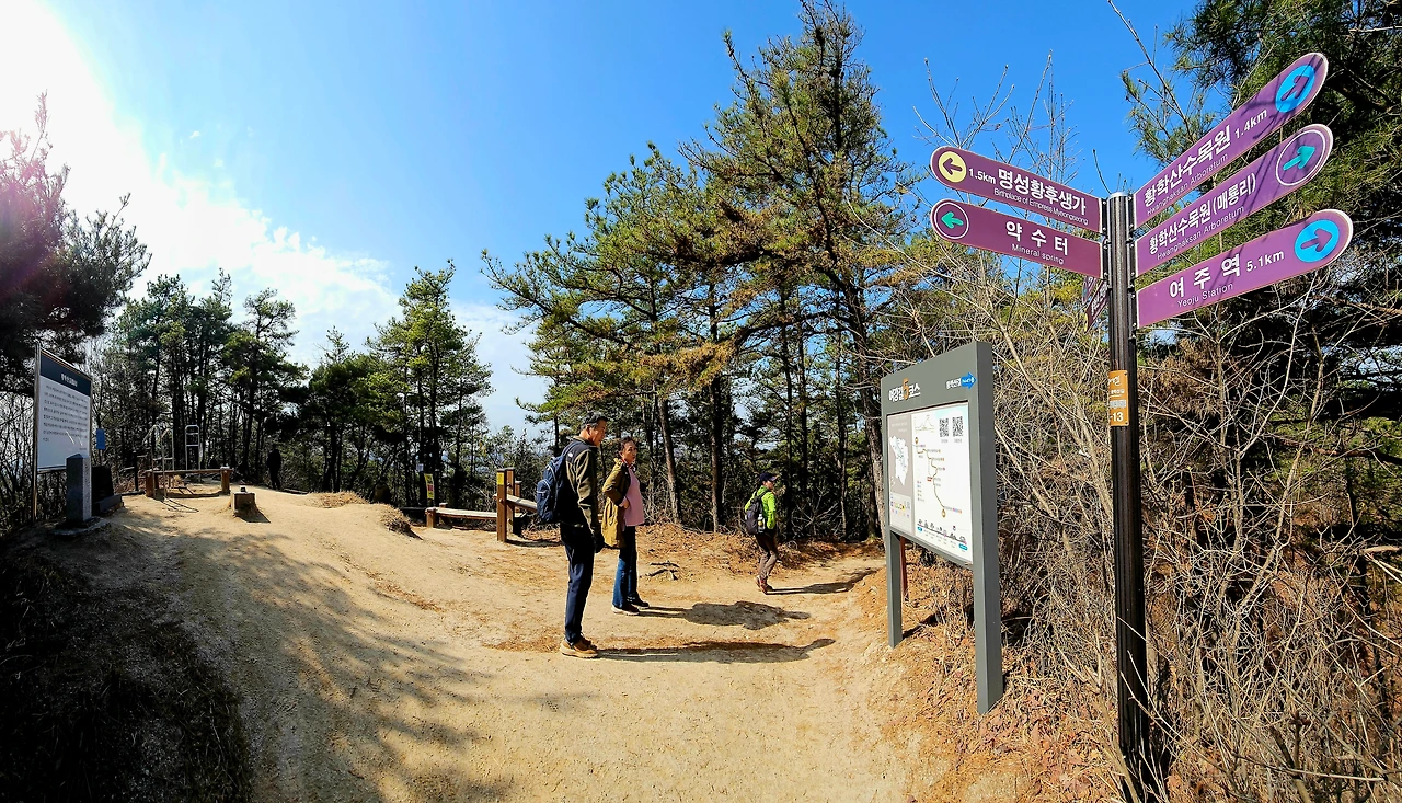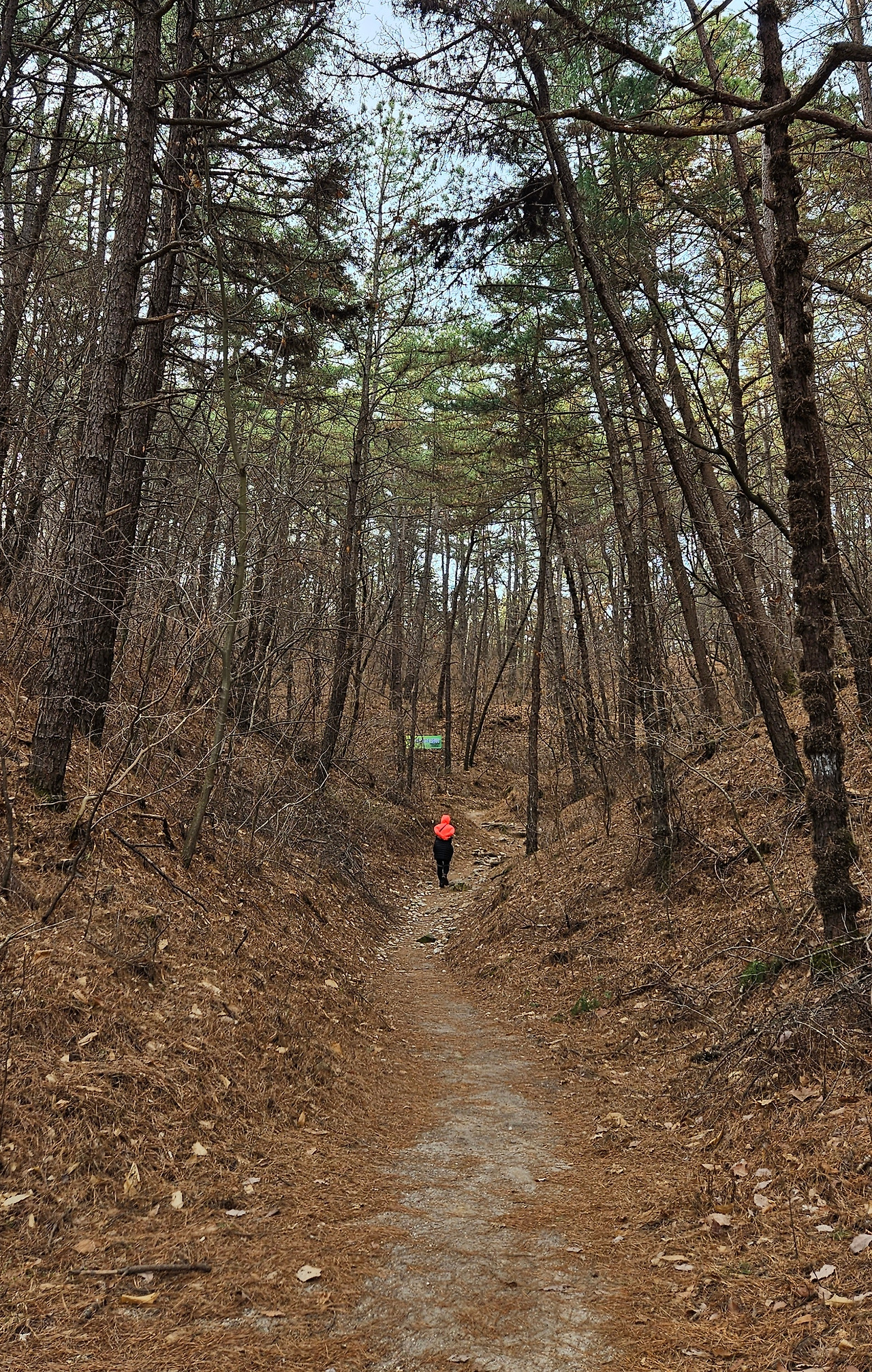 산림욕장으로 들어서서 느슨하고 아늑한 얕은 경사길을 100미터 남짓 오르니 제각기 다른 모양새의 소나무들이 어우러진 숲 사이로 난 능선길이 동편으로 길게 늘어져 있다. 선홍색 점퍼 차림에 선글라스를 낀 여성 한 분을 앞질러 가고 마주 오는 등짐 진 어르신 한 분과 스쳐 지났다. 능선마루 곳곳에는 여러 갈래 산책길이 나있어 서너 번 '여강길 앱'에 의지해서 잘못 든 길을 바른 길로 고쳐 잡았다.