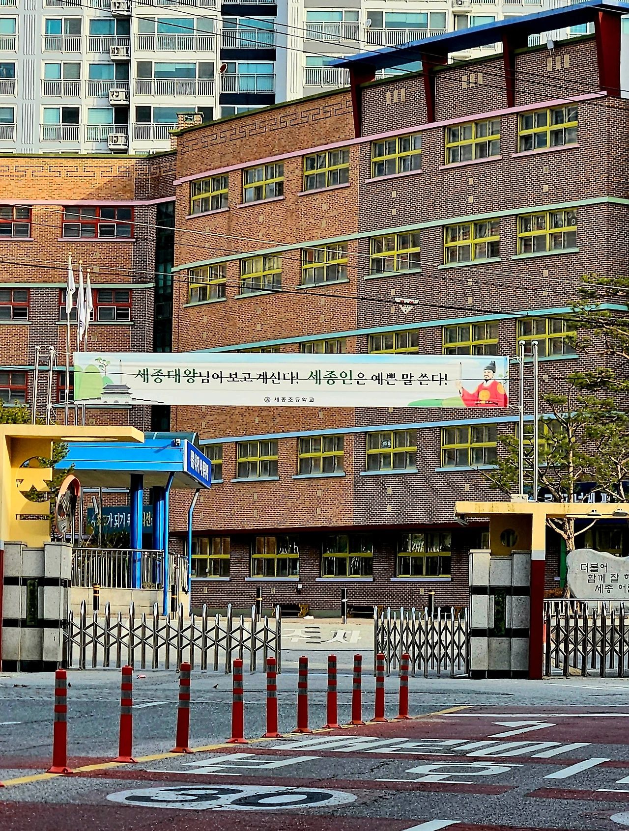 여강길 앱을 켜고 제5코스 노선을 따라 세종초교 쪽으로 발을 옮긴다. 휴일이라 학교는 인적 없이 텅 비었고 교문 위에 걸린 "세종대왕님이 보고 계신다! 세종인은 예쁜 말 쓴다."라는 플래카드 글귀가 눈에 띈다.