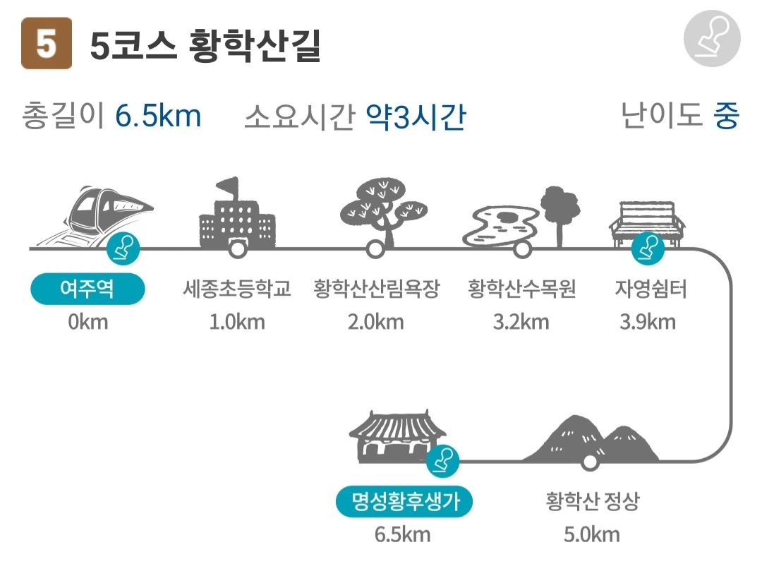 여강길은 총 118.8km 11개 코스로 이루어졌는데, 제5코스 '황학산길'은 여주역에서 출발하여 세종초교, 황학산산림욕장, 황학산수목원, 황학산정상을 지나 명성황후 생가까지 이어지는 6.5km로 다른 코스에 비해 짧은 편이다.