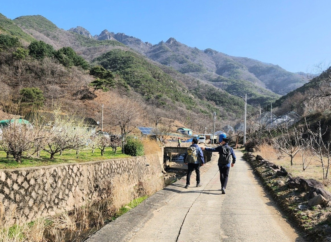 마을 뒤쪽으로 내려앉은 산줄기들이 만든 계곡에서 내려오는 물길은 스무여 가옥이 자리 잡은 마을 앞을 동서로 흐르는 적암천으로 흘러든다. 개천 옆길을 따라 적암리 마을 뒤쪽 산행 들머리로 향했다. 산행 들머리 입구에서 입산통제소에서 비치한 입산 기록대장에 인적사항을 기재한 후 본격적인 산행을 시작한다.