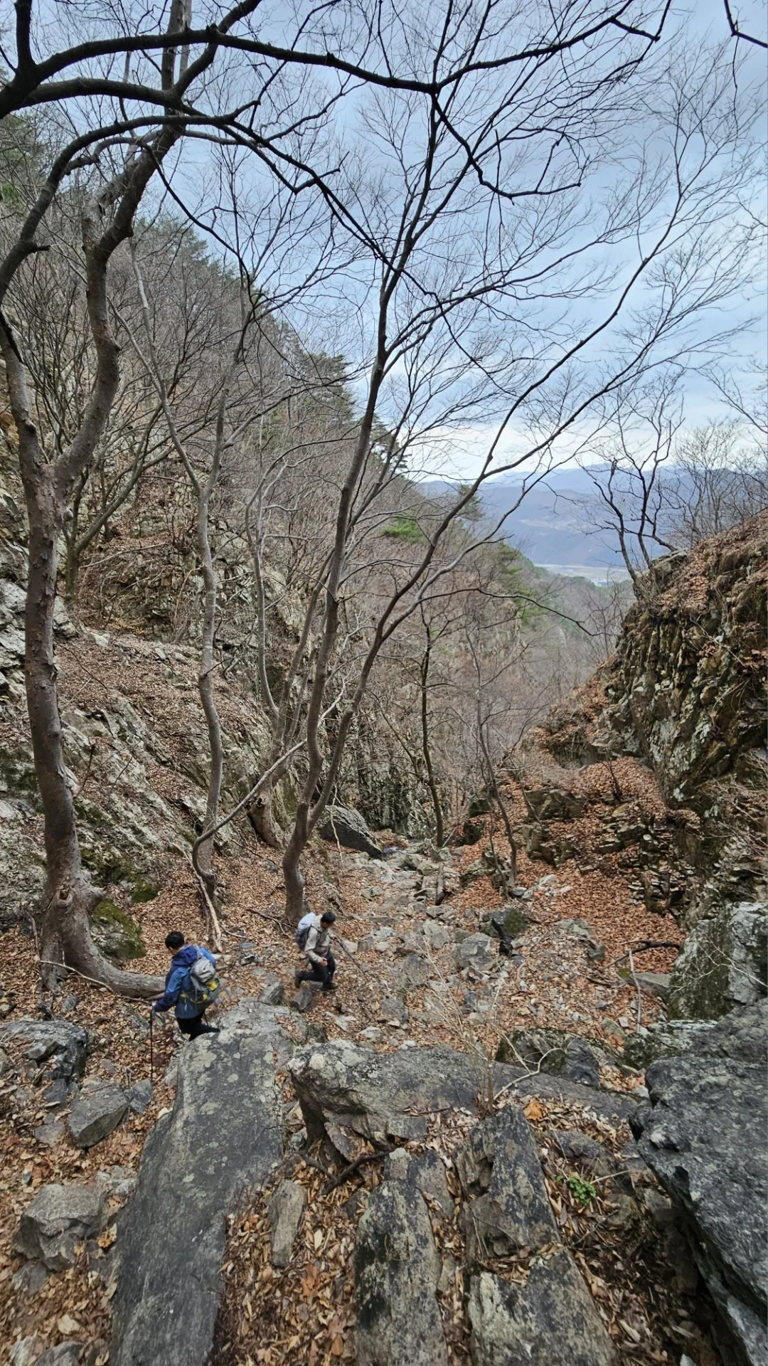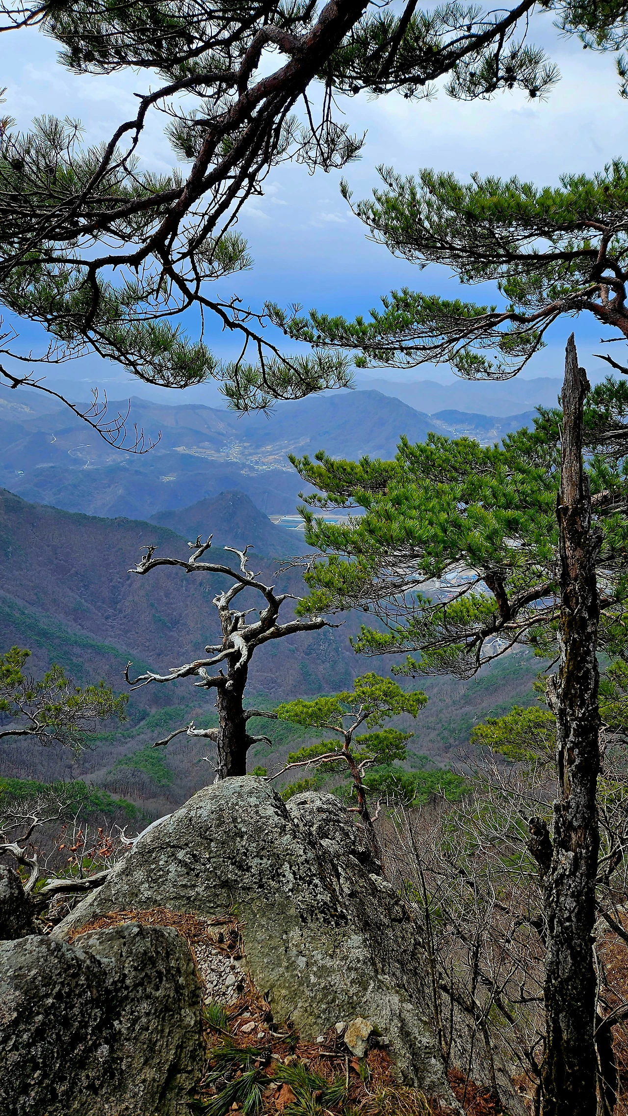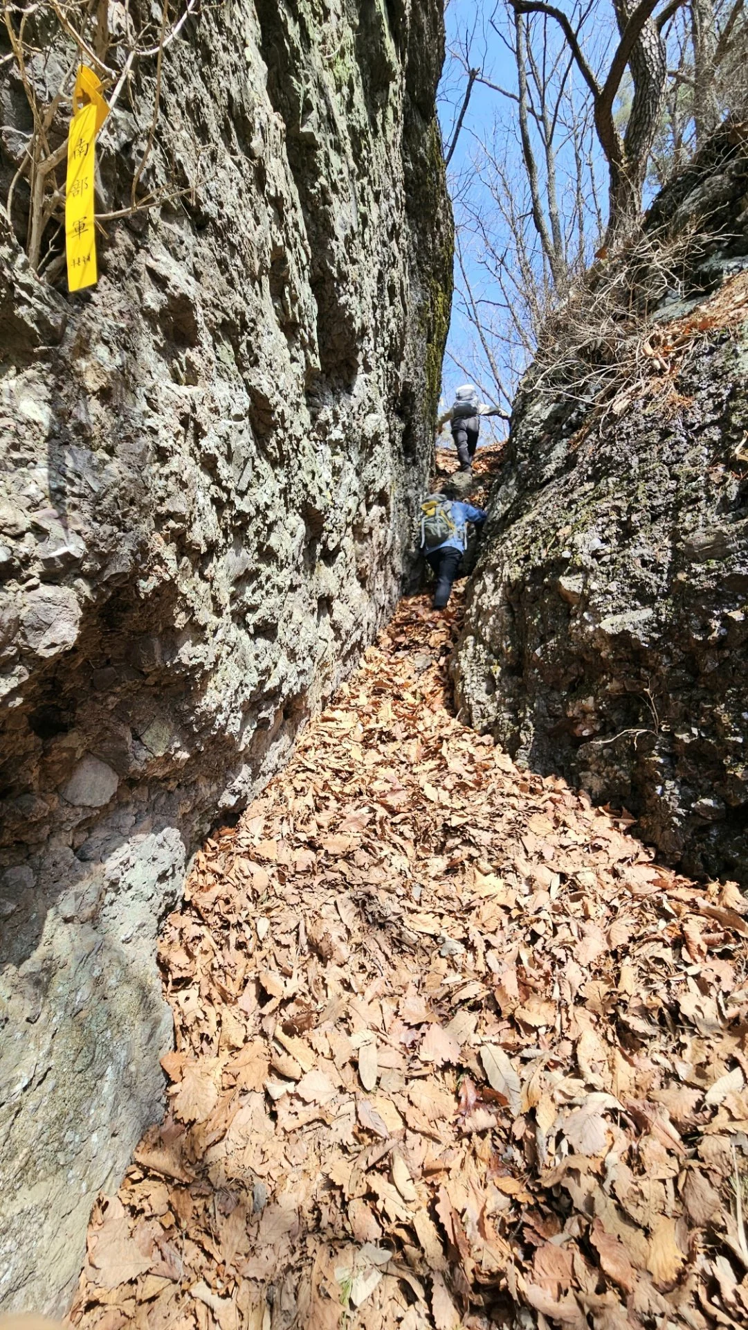 참나무 낙엽이 융단처럼 깔린 가파른 경사를 치고 올랐다. 흙길이 다하는 곳에 나타난 작은 암벽을 밧줄에 의지해서 기어올랐다. 바위에 뿌리를 내리고 서있는 소나무 몇 그루는 산객에게 잔뜩 구부러지고 뒤틀린 줄기로 온갖 풍상의 세월을 견뎌왔다고 소곤댄다.