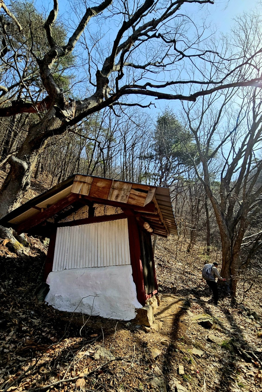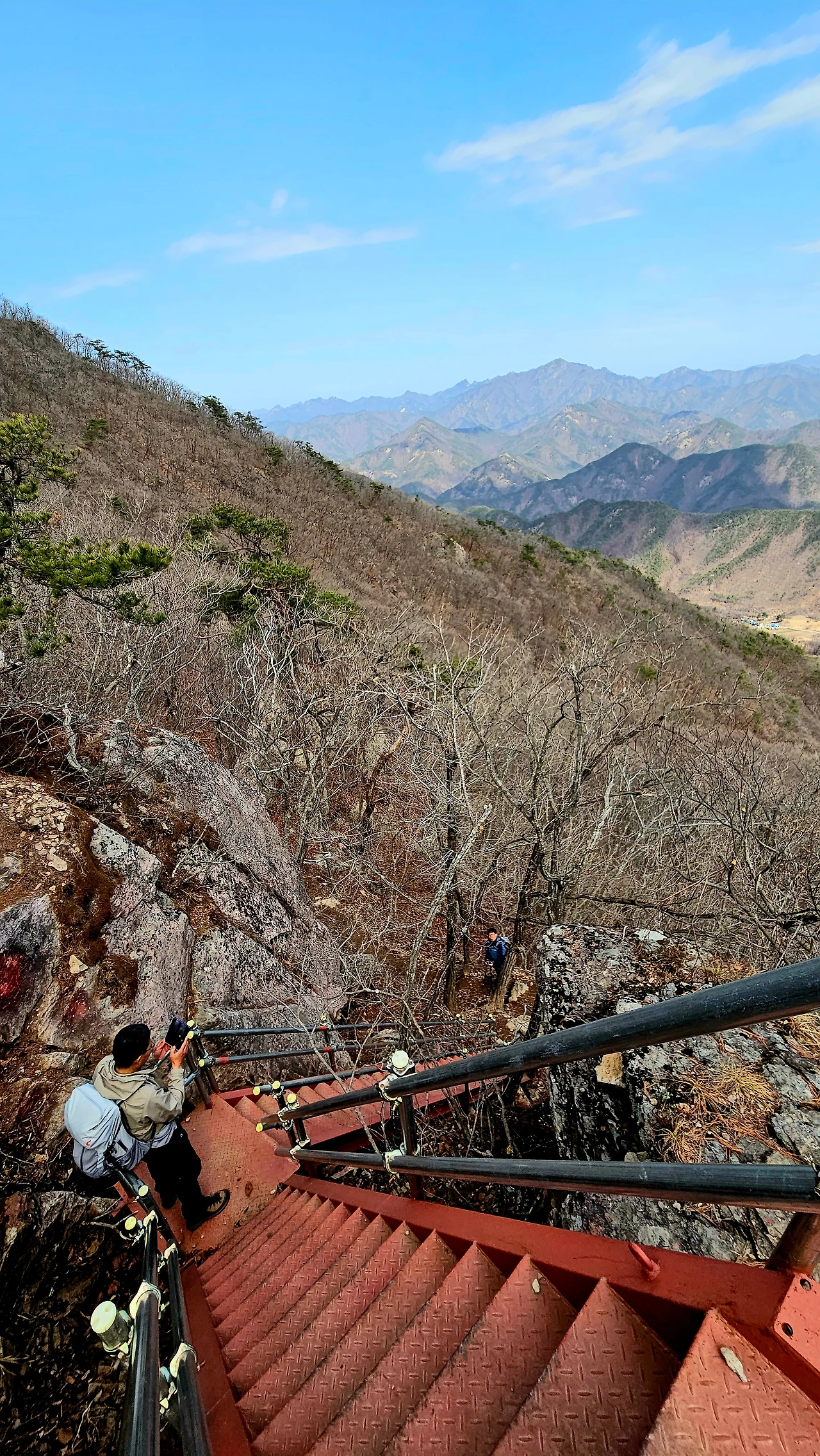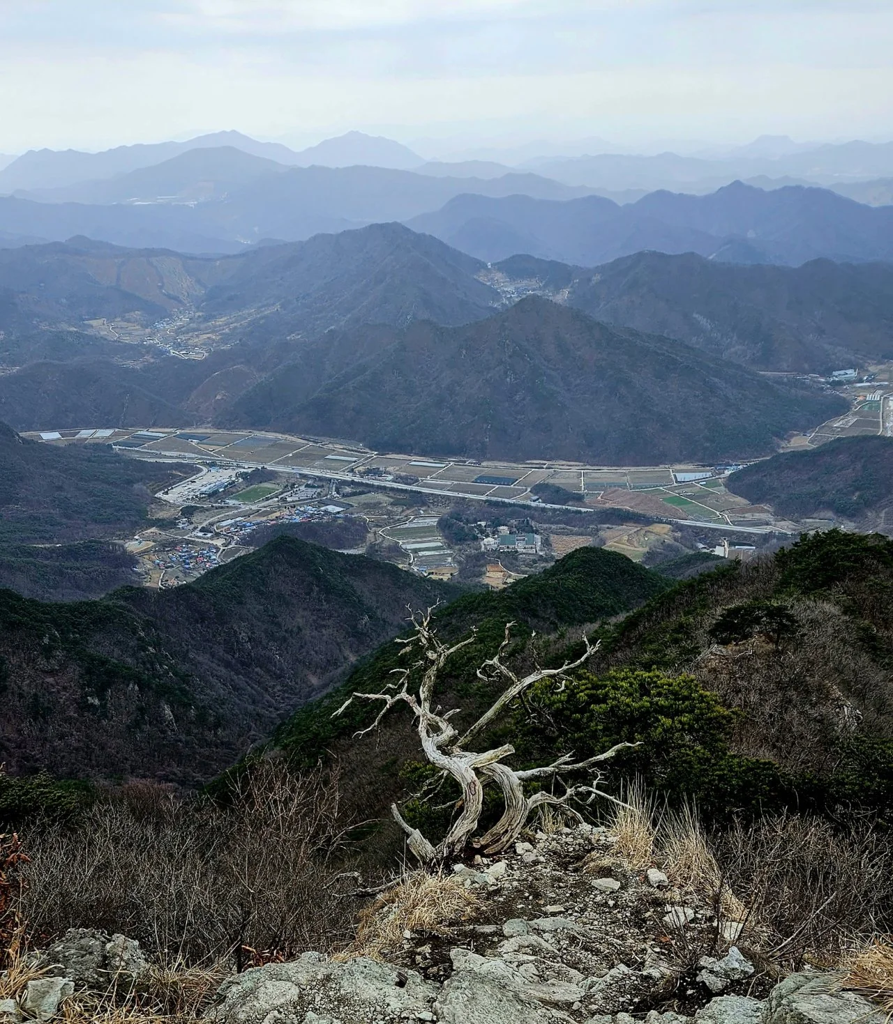 참나무 낙엽이 융단처럼 깔린 가파른 경사를 치고 올랐다. 흙길이 다하는 곳에 나타난 작은 암벽을 밧줄에 의지해서 기어올랐다. 바위에 뿌리를 내리고 서있는 소나무 몇 그루는 산객에게 잔뜩 구부러지고 뒤틀린 줄기로 온갖 풍상의 세월을 견뎌왔다고 소곤댄다.
