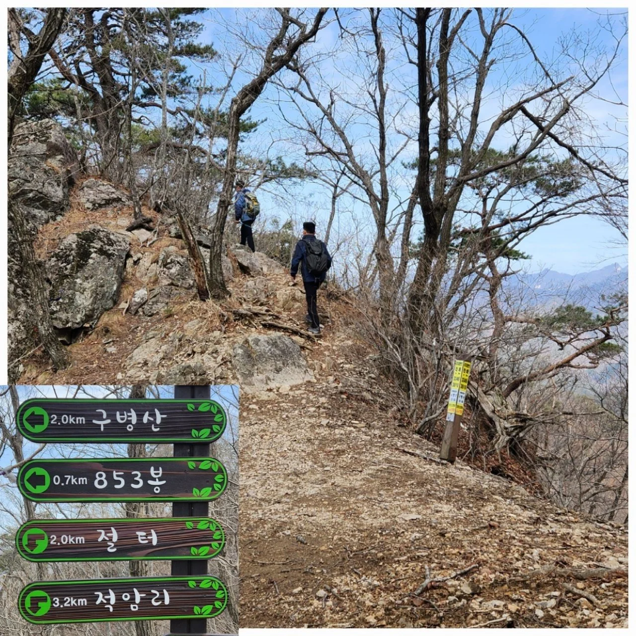 앞을 가로막고 출입금지 플래카드를 우회하여 853봉에 올랐다. 능선 앞쪽으로 백운대와 구병산 정상의 모습이 한눈에 들어오니 오늘 산행도 막바지에 다다랐다. 사계절 변함없이 푸른 소나무들은 능선과 암봉들 주변을 지키고 섰고 우측 산기슭은 머지않아 연초록의 물결로 일렁이며 봄의 향연을 펼칠 떡갈나무 등 앙상한 가지를 드러낸 활엽수가 숲을 이루었다.