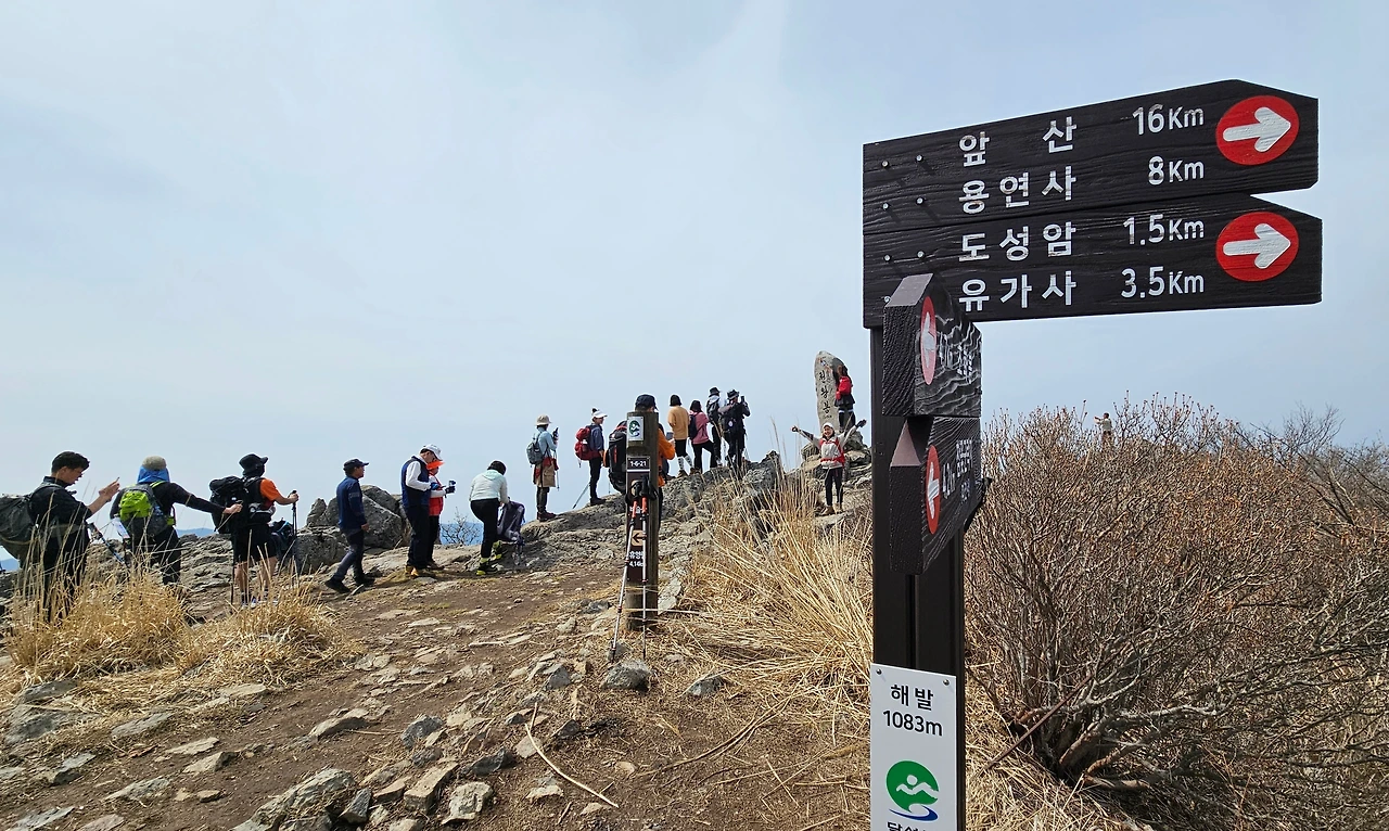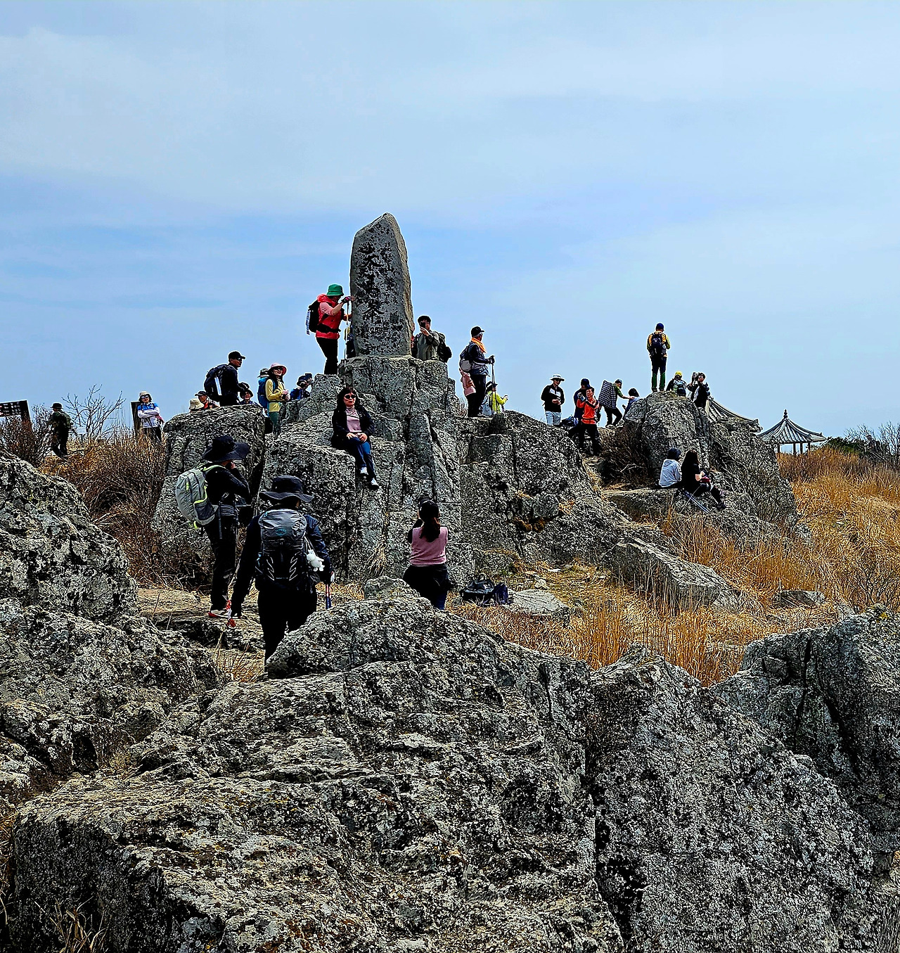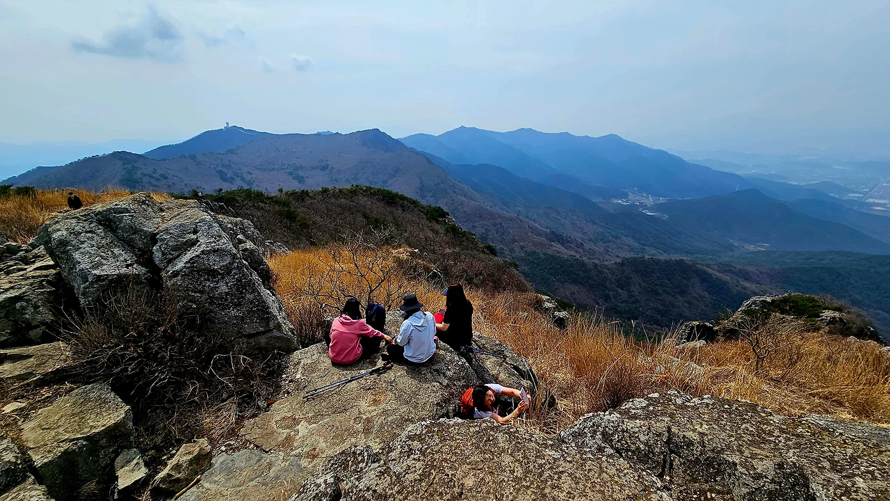 김포에서 왔다는 여성 산객 세 분은 멀리 남쪽까지 진달래를 영접하러 왔다가 실망이 크다고 했다. 오가며 여러 번 마주친 청주에서 단체 산행을 온 산객들은 진달래야 피었던 말았든 상관없다는 듯 여기저기서 인증 사진을 남기며 즐거워하는 모습이다. 딸과 함께 산행을 온 한 부부, 아내가 진달래꽃 옆에 얼굴을 대고 "누가 더 예뻐"라고 아양을 떨자 "말해 놓고도 민망하제"라고 답하는 남편, 그 모습에 입가로 터져 나오려는 웃음을 참으며 '어찌 저리 무뚝뚝할까! 영락없는 경상도 대구 사람이네'라는 생각을 했다.