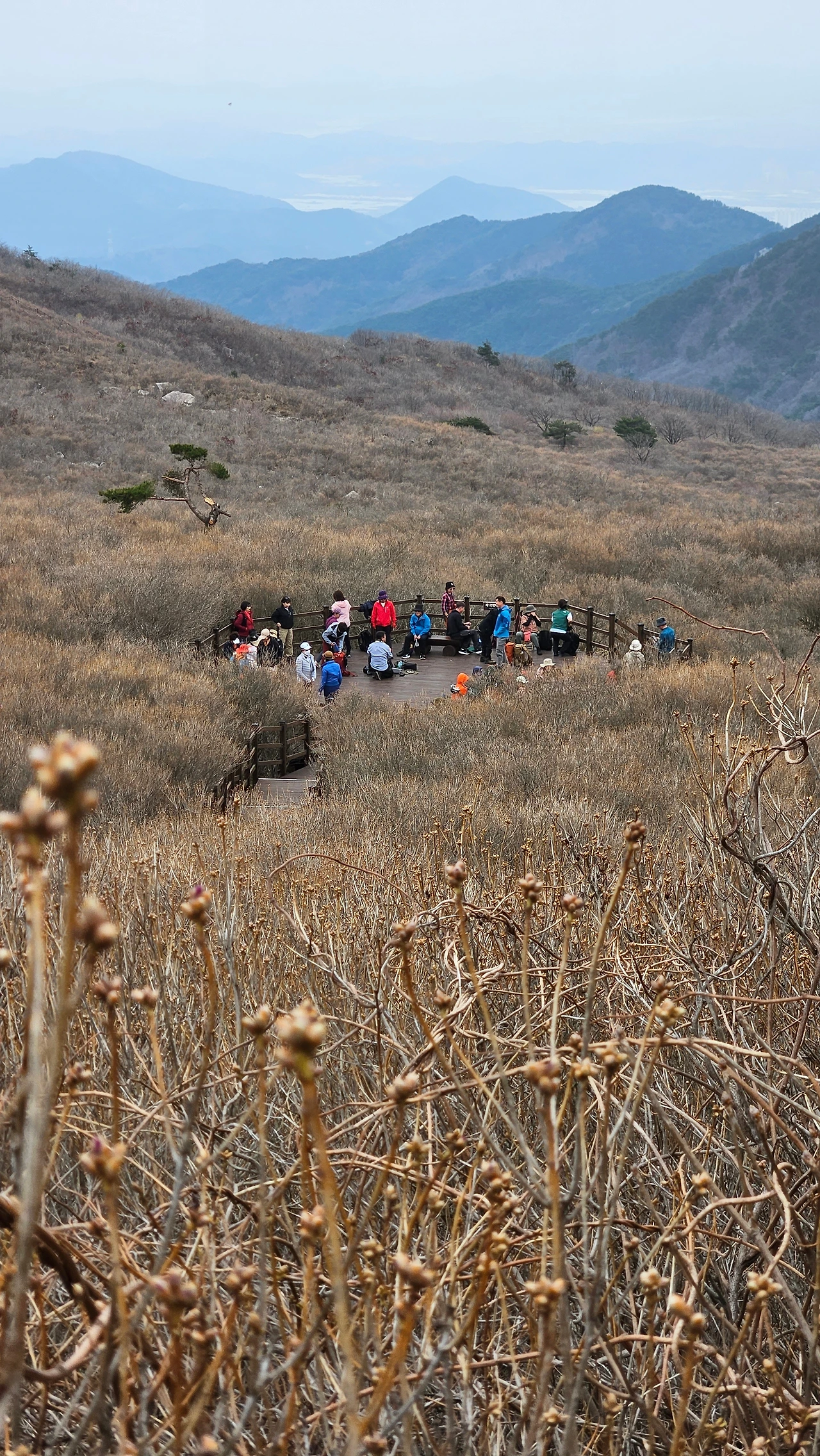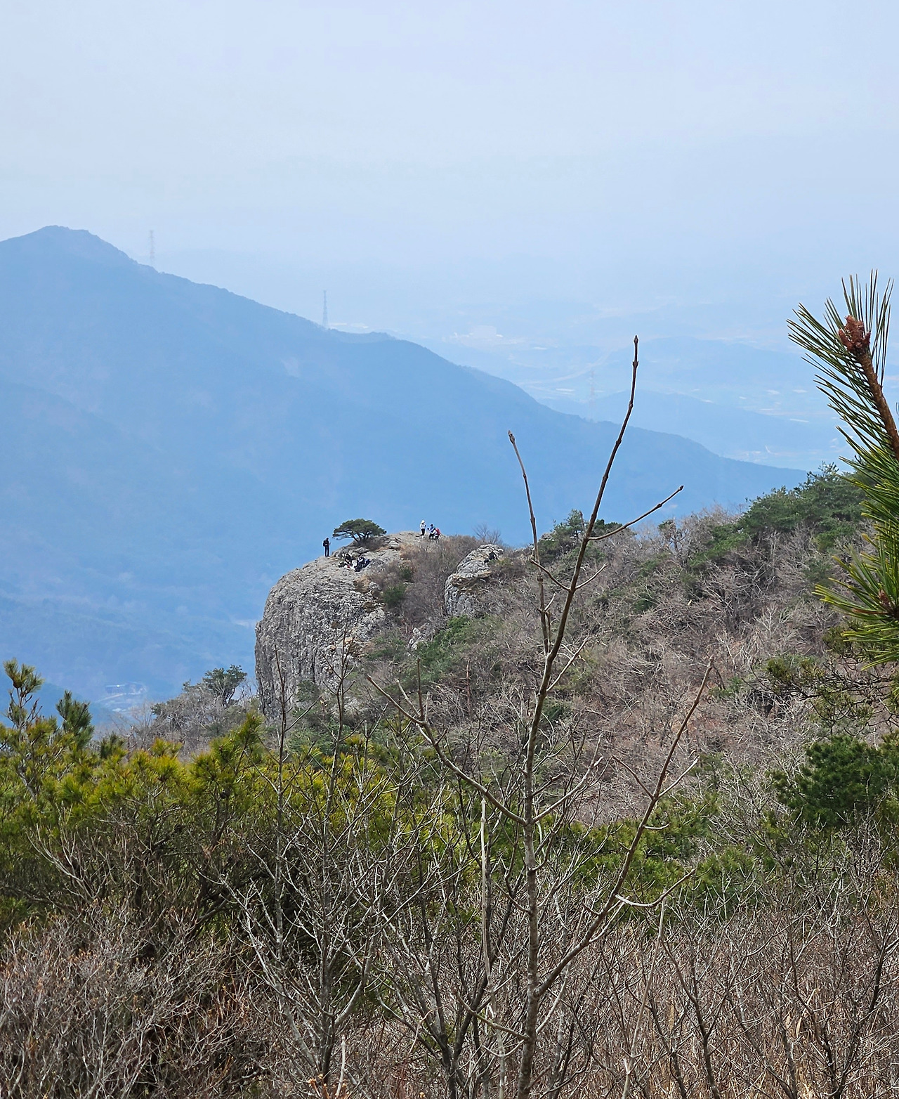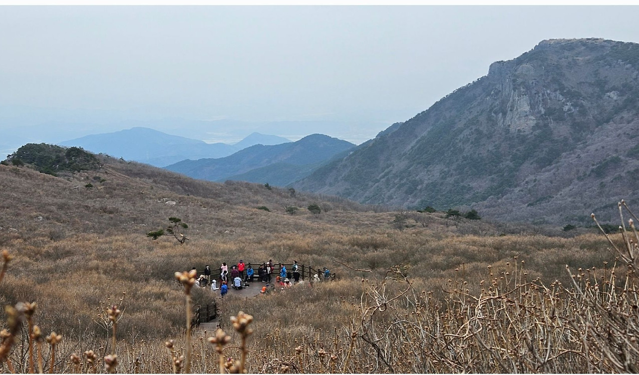 김포에서 왔다는 여성 산객 세 분은 멀리 남쪽까지 진달래를 영접하러 왔다가 실망이 크다고 했다. 오가며 여러 번 마주친 청주에서 단체 산행을 온 산객들은 진달래야 피었던 말았든 상관없다는 듯 여기저기서 인증 사진을 남기며 즐거워하는 모습이다. 딸과 함께 산행을 온 한 부부, 아내가 진달래꽃 옆에 얼굴을 대고 "누가 더 예뻐"라고 아양을 떨자 "말해 놓고도 민망하제"라고 답하는 남편, 그 모습에 입가로 터져 나오려는 웃음을 참으며 '어찌 저리 무뚝뚝할까! 영락없는 경상도 대구 사람이네'라는 생각을 했다.
