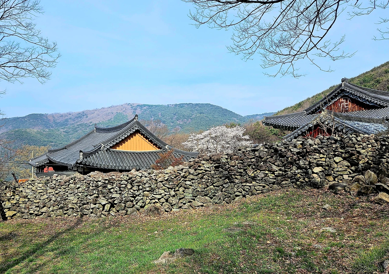 계단 올라 수도암 경내로 들어서니 너른 잔디 마당 저편의 극락전 지붕이 멀리 비슬산 봉우리를 머리에 이고 있다. 가지마다 벚꽃을 팝콘처럼 새하얗게 만개한 채 경내 한편에 서있는 아름드리 벚나무는 한복차림의 단아한 규수집 여인네를 닮았다.