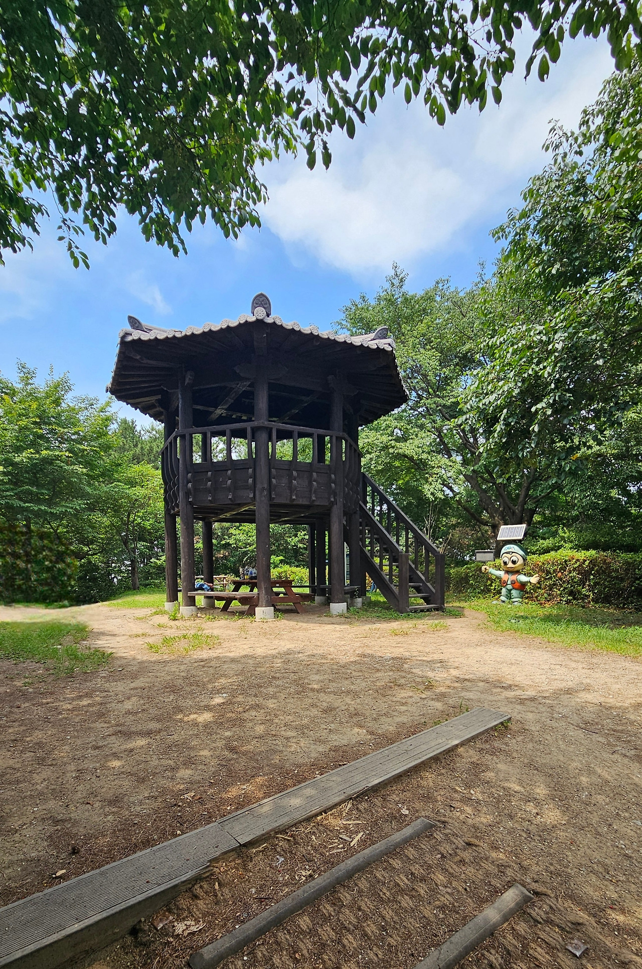 숲길은 갈림길에서 양산봉으로 치고 오르는 비탈길을 내놓는다. 힐링객들이 스쳐 지나는 숲길 옆에 안동 권 공 묘소와 그 옆 묘소는 시절을 잊지 않은 개망초가 무성한 숲을 이루었고 숲 너머 멀리 동탄 벌은 고층 빌딩이 밀림을 이루고 있다. 점심때가 지난 한시 반경 이층 팔각 정자라 자리한 해발 179.3미터 양산봉 정상에 올라섰다. 숲이 사방을 가려 조망이 없는 정자 위로 오르니 솔솔 부는 바람이 시원하게 땀을 씻겨 준다.