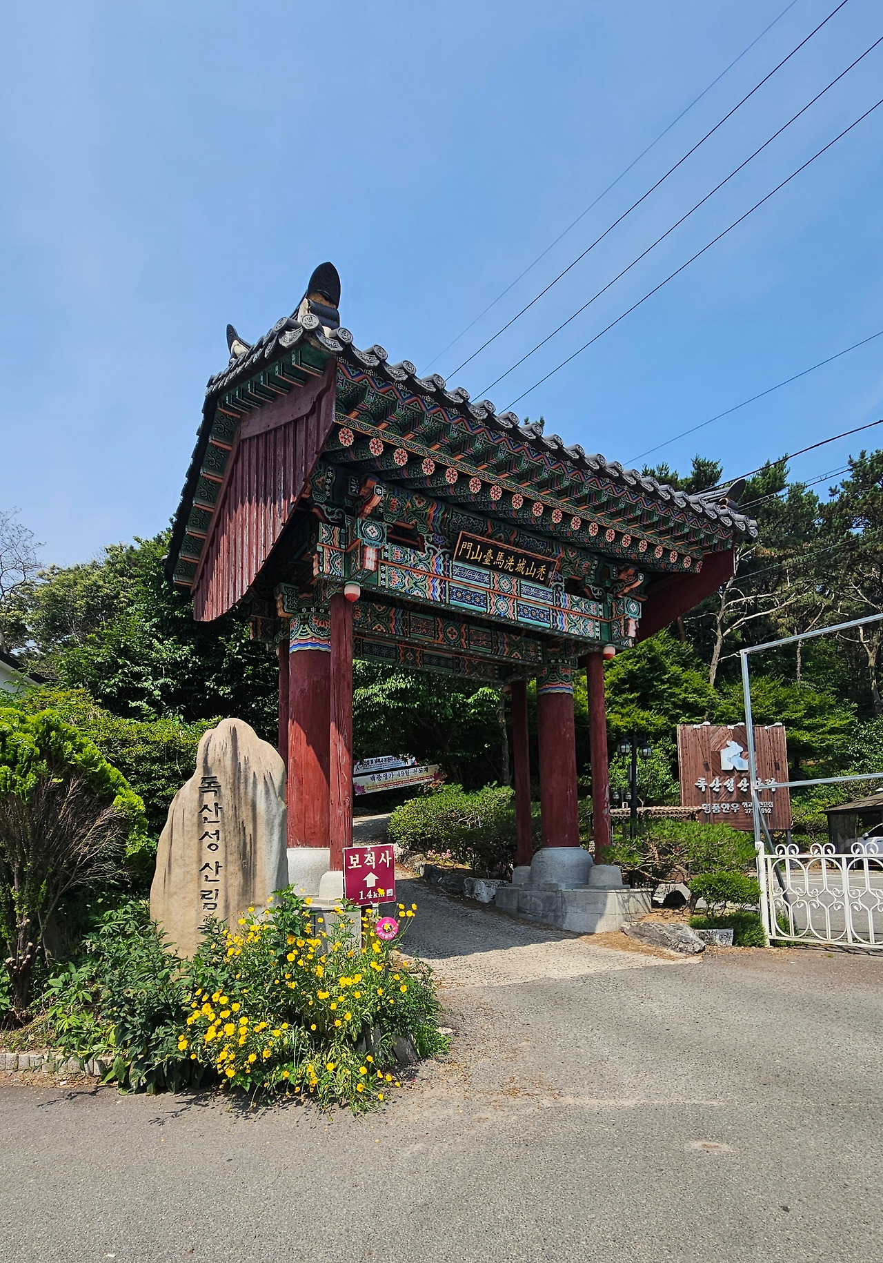 평일 아침나절이라 그런지 산성으로 오르는 길에 마주치는 사람은 몇몇 뿐이고 간간이 차량이 포장도로를 스쳐 지난다. 입구에서 500여 미터쯤 오르자 독산성과 양산봉 갈림길 이정표가 산성 남문까지 390미터라고 알린다. 좌우 양측으로 비탈과 간이 주차장을 낀 나무데크 길이 산성 위로 인도한다.