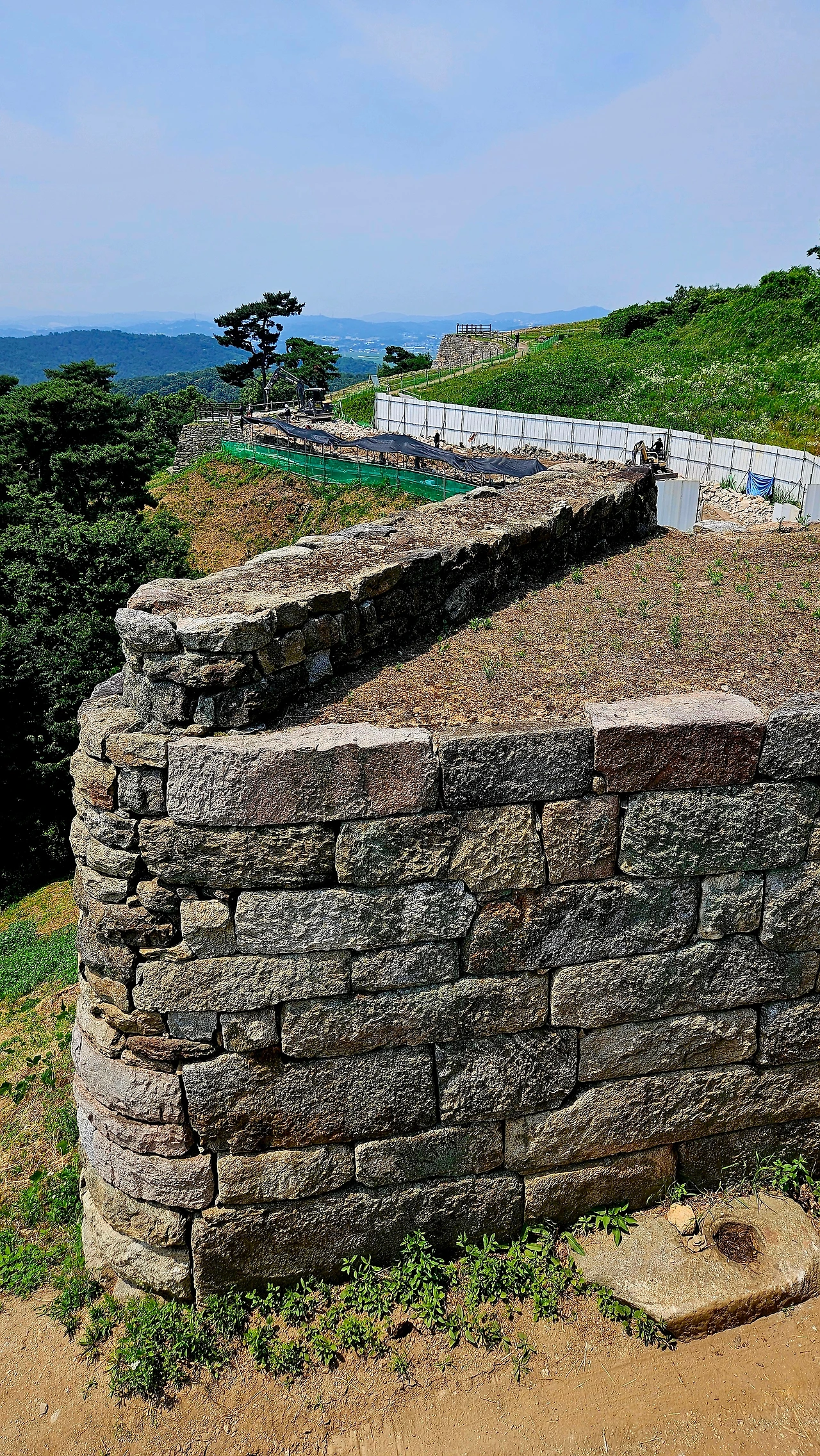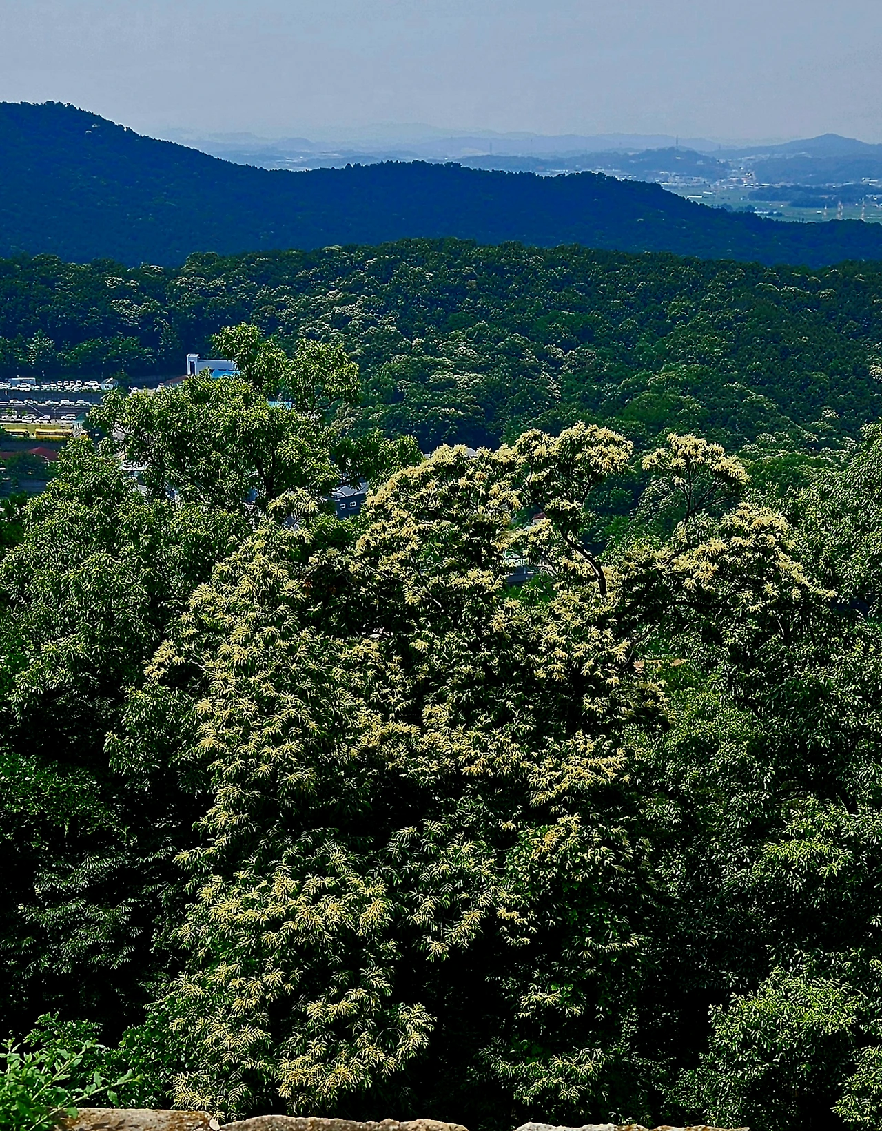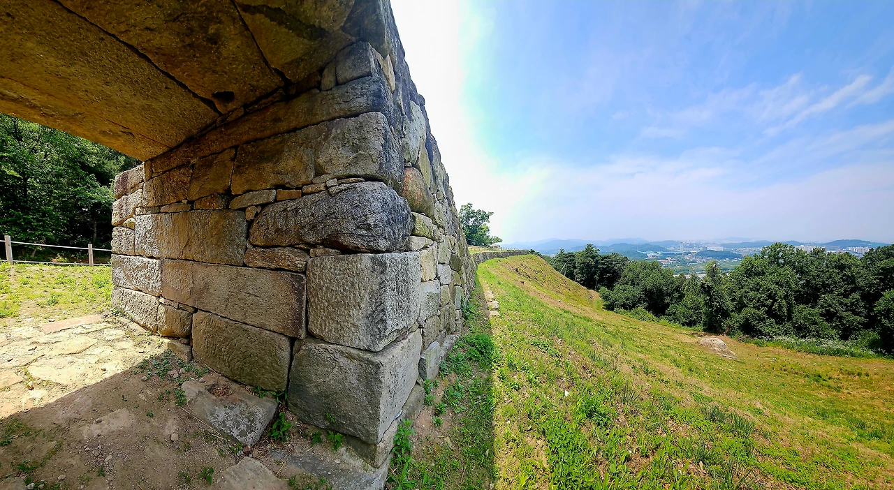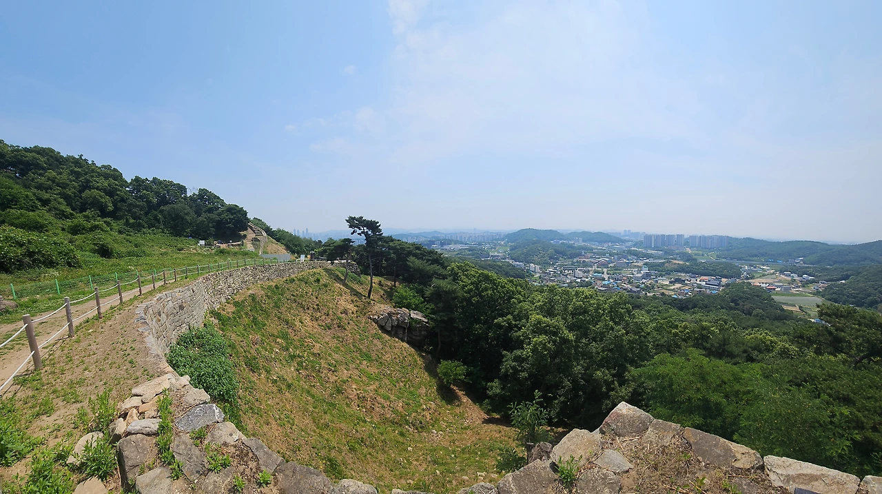 좌우 산록의 무성한 초목은 여백 하나 없이 공간을 녹음으로 빽빽게 채우고 있다. 기욤나무와 앙증맞은 잎사귀가 무성한 산뽕나무는 꽃받이와 검은 열매를 바닥에 수북이 떨구어 놓았다. 산성 언저리 등로 옆에는 봉분과 수목장 등 묘지도 눈에 띄는데 그중에는 2022년 3월에 조성된 것도 있다. 1964년 국가 사적으로 지정된 유적지 부근에 개인의 장지들이 산재하고 있는 것이 의아하다.