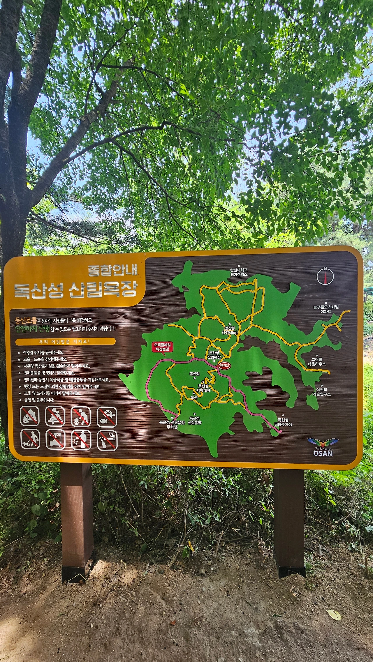 보적사에서 독산성 동문으로 빠져나와 독산성 산림욕장의 양산봉(陽山峰) 쪽 숲길로 방향을 잡았다. 느린 내리막 비탈의 숲길 주위로 그물다리, 외줄 타기, 장애물 언덕, 벤치, 평상, 철봉 등 놀이와 휴식 시설들이 곳곳에 설치되어 있다. 독산성과 그 주변 양산봉 등 산림 20만 7,000m²에 오산시가 조성하여 1999년 12월 중순에 개장했다는 이 산림욕장은 시민들에게는 더할 나위 없이 좋은 휴식처가 될 듯싶다.