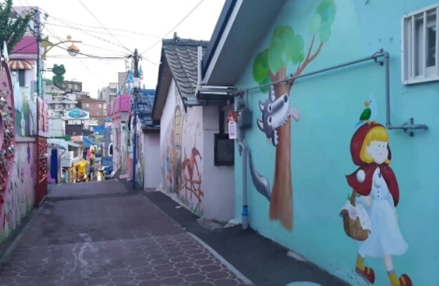 세상의 모든 동화 캐릭터들을 모두 모아 놓은 듯 동화마을은 좁은 골목마다 담벼락이 비좁아 보인다. 평일 저녁이라 그런지 친구끼리 또는 연인끼리 두세 명씩 짝지어 온 젊은이들이 드문드문 눈에 띌 뿐 한산하다. 간간이 모녀나 노부부들도 눈에 띈다.