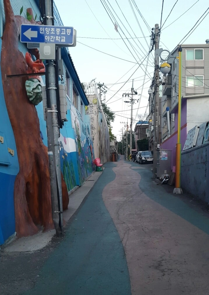 담벼락에 그려져 있는 도깨비가 튀어나올 것 같이 희미한 가로등 불빛의 을씨년스러운 골목길을 지나서 동화마을 초입 자유공원 가장자리로 되돌아왔다.