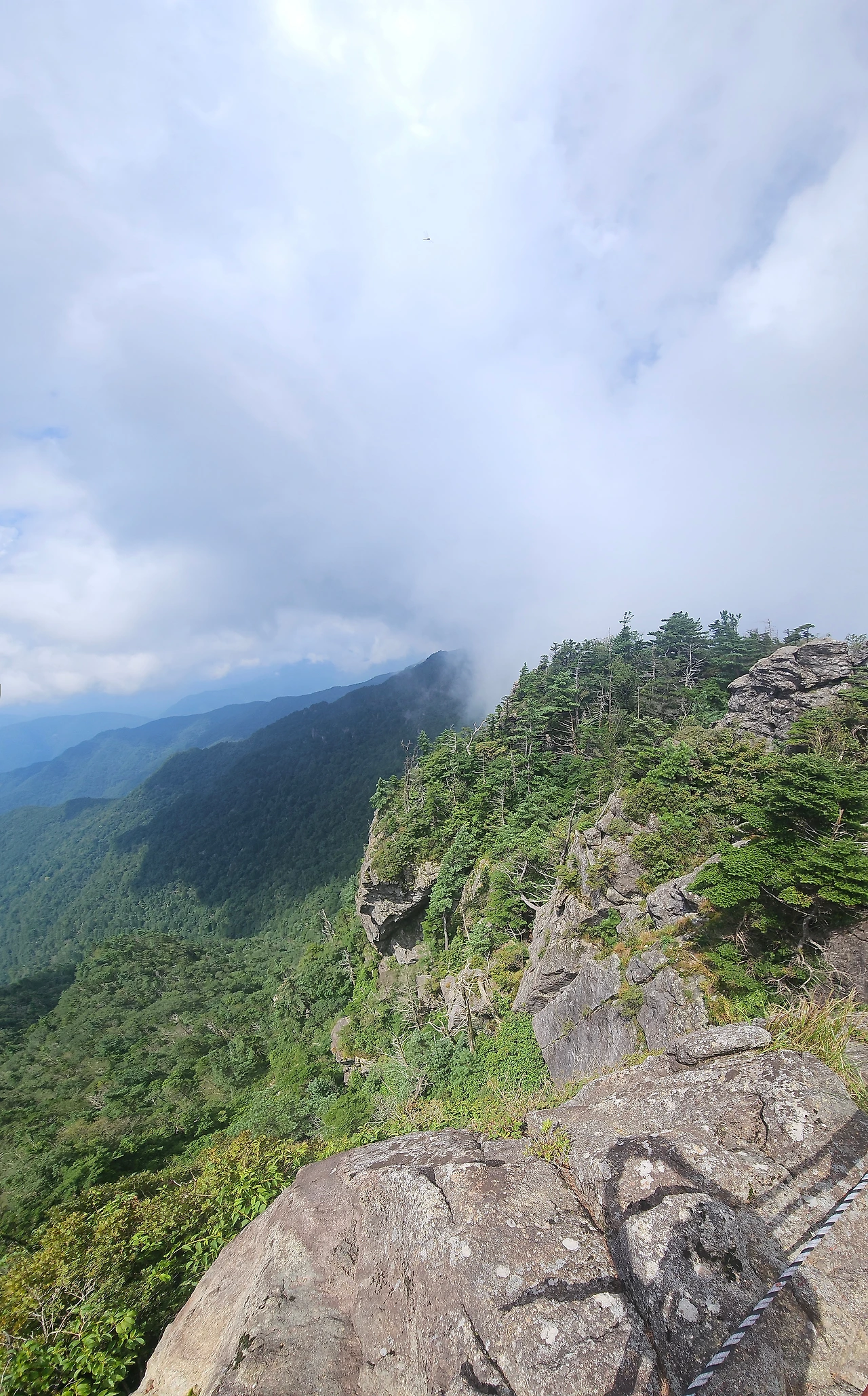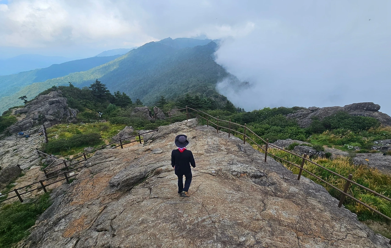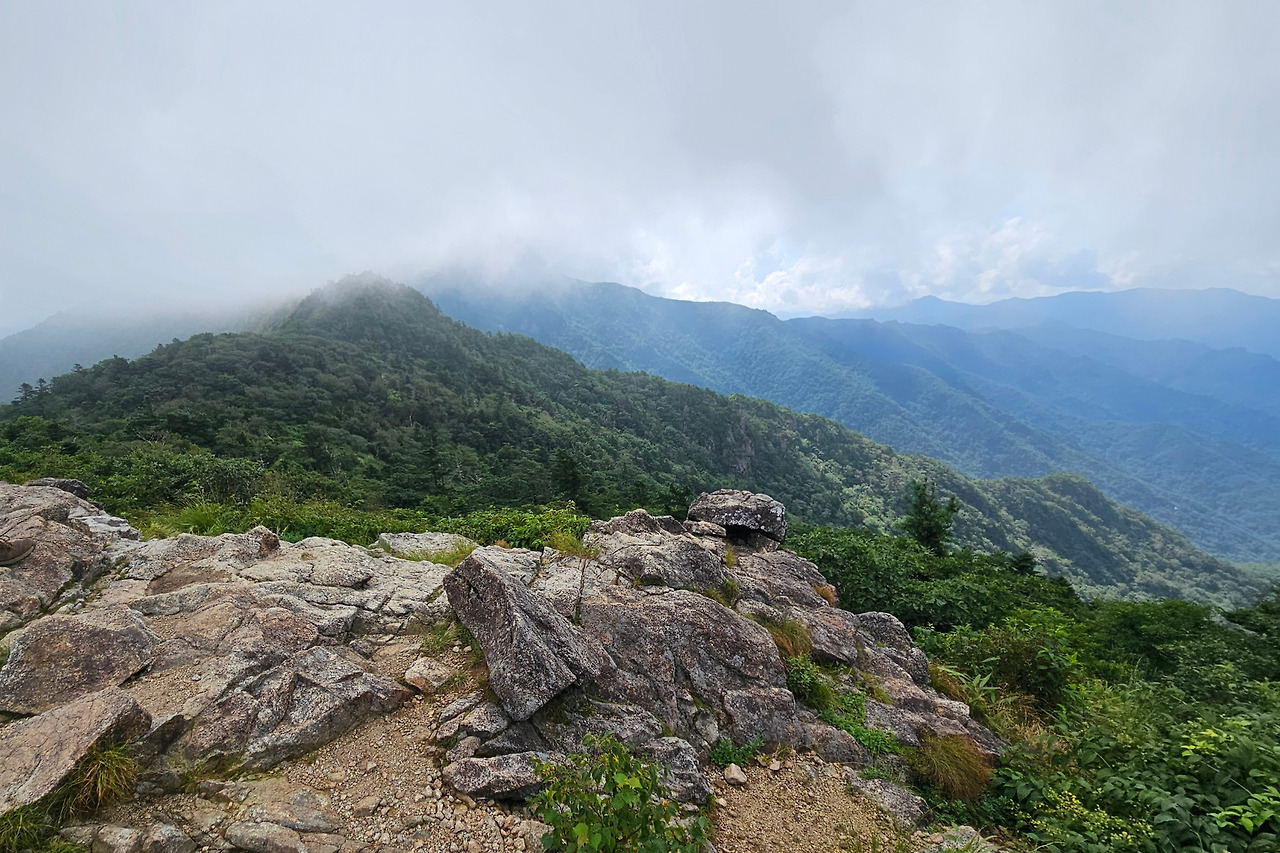 나무계단 길을 통해 뿔처럼 생긴 암봉을 휘돌아 거대한 바위들이 우뚝 우뚝 어우러져 여러 봉우리를 이루고 있는 정상부로 올라섰다. 멀리 지나온 능선에는 안개구름이 산줄기를 타고 넘으며 뭉게구름을 하늘로 피워 올리고 있고, 앞쪽 능선은 호시탐탐 넘보는 구름을 막아서서 서로 힘겨루기를 하고 있다.