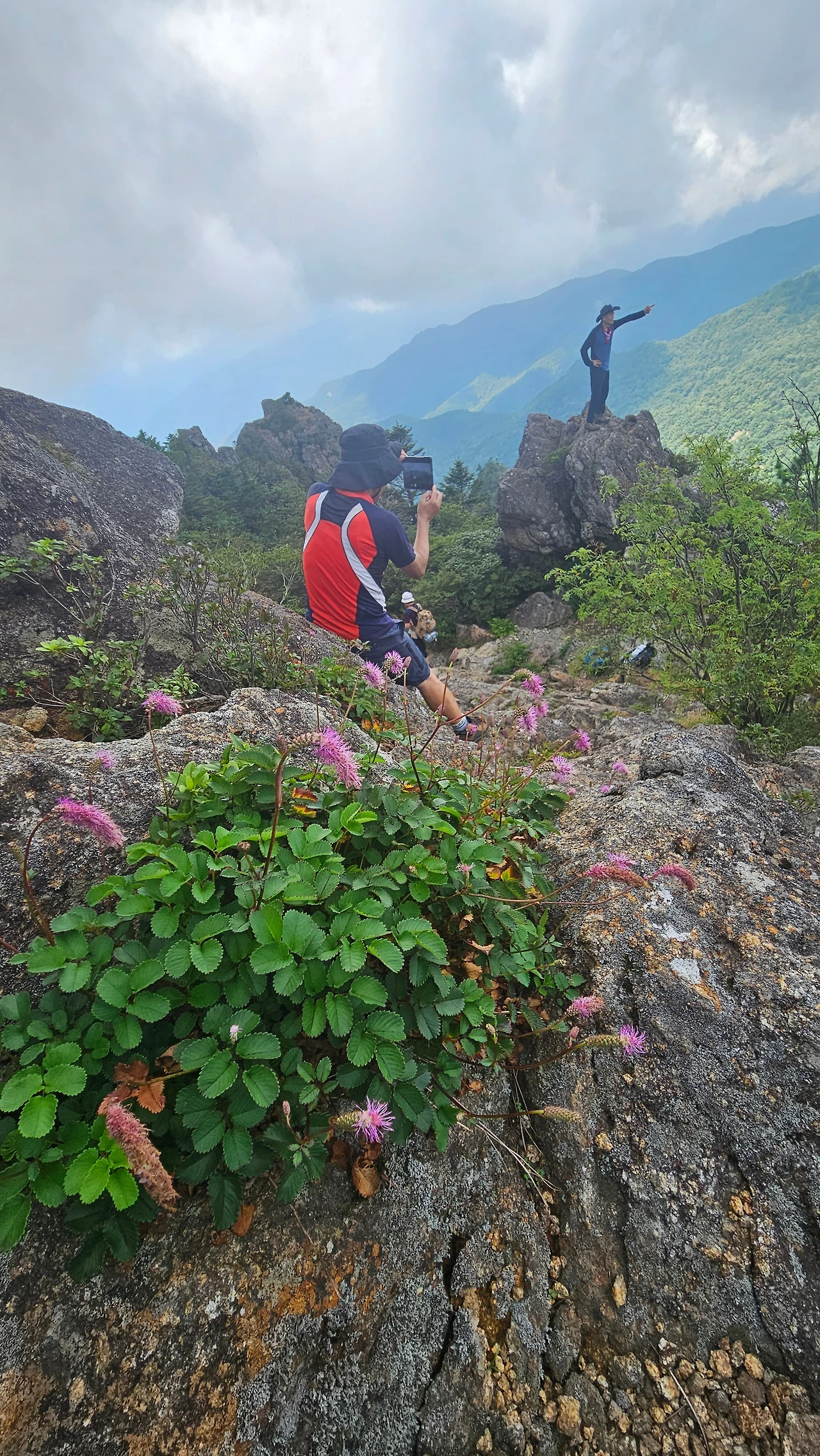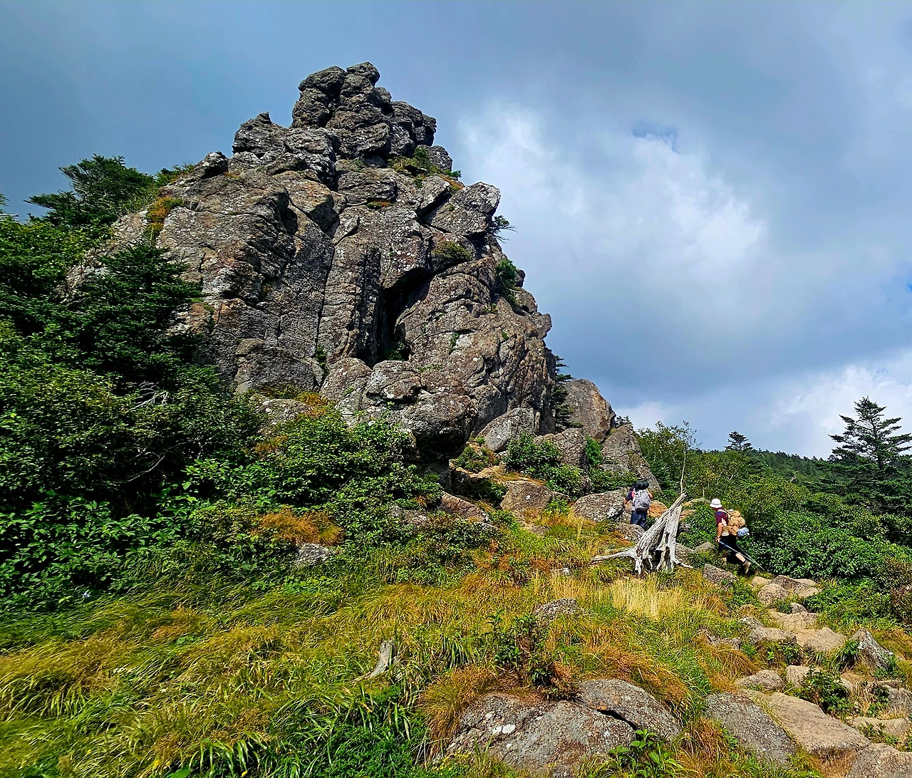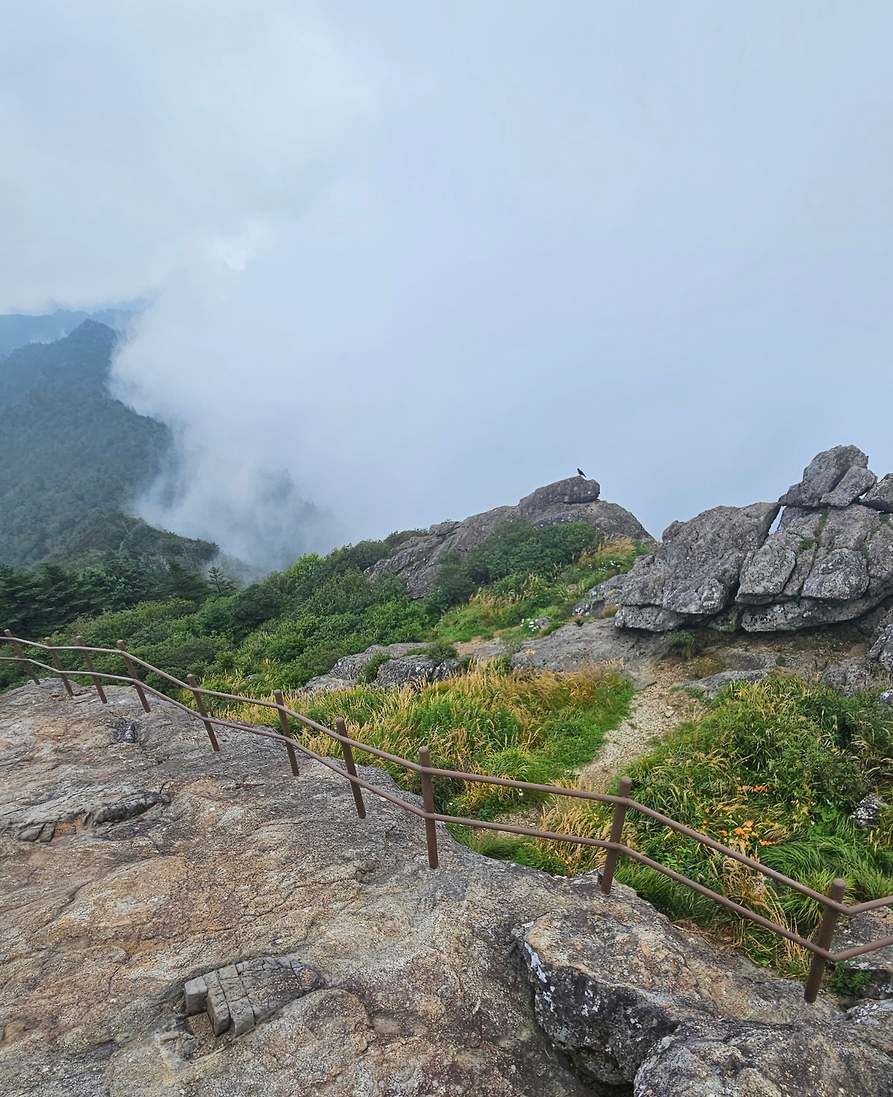 나무계단 길을 통해 뿔처럼 생긴 암봉을 휘돌아 거대한 바위들이 우뚝 우뚝 어우러져 여러 봉우리를 이루고 있는 정상부로 올라섰다. 멀리 지나온 능선에는 안개구름이 산줄기를 타고 넘으며 뭉게구름을 하늘로 피워 올리고 있고, 앞쪽 능선은 호시탐탐 넘보는 구름을 막아서서 서로 힘겨루기를 하고 있다.