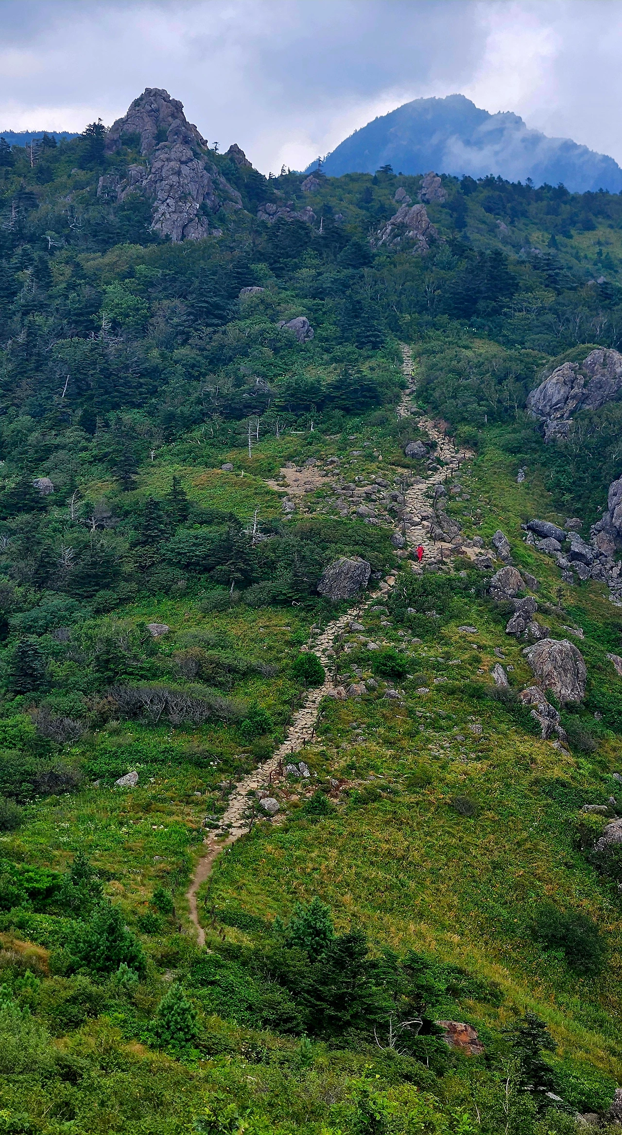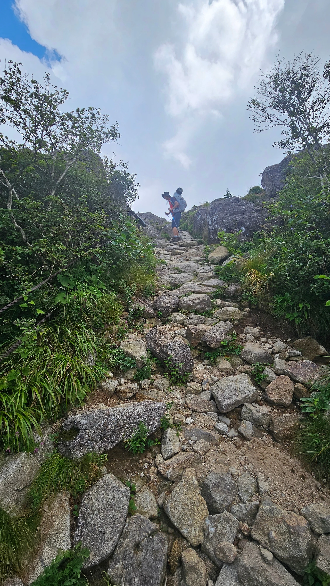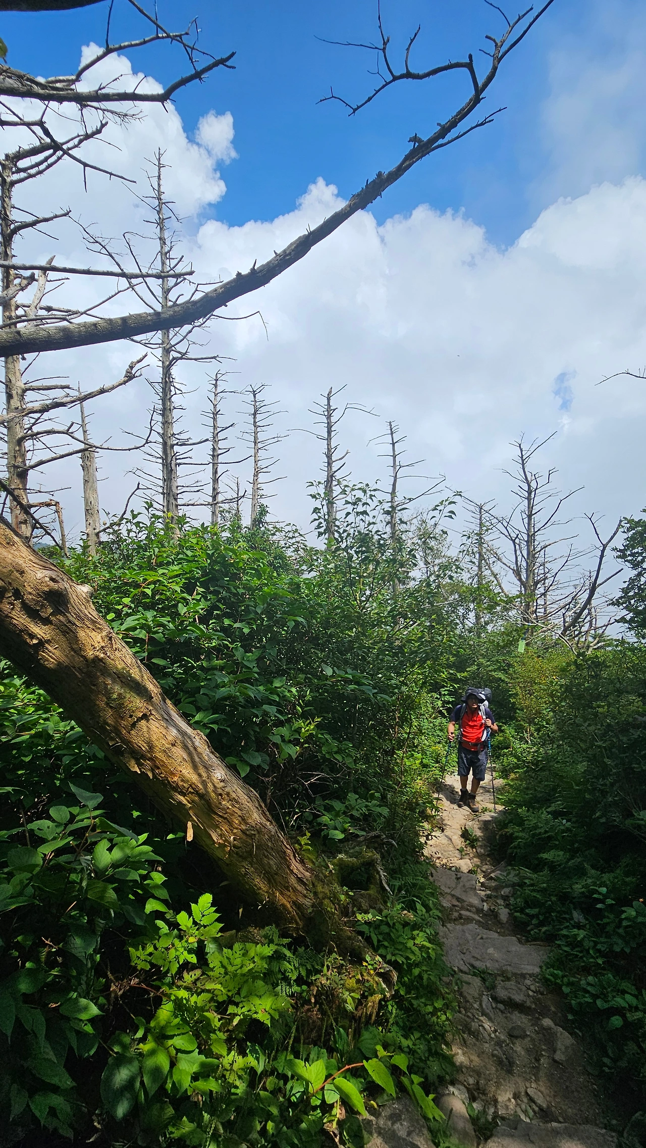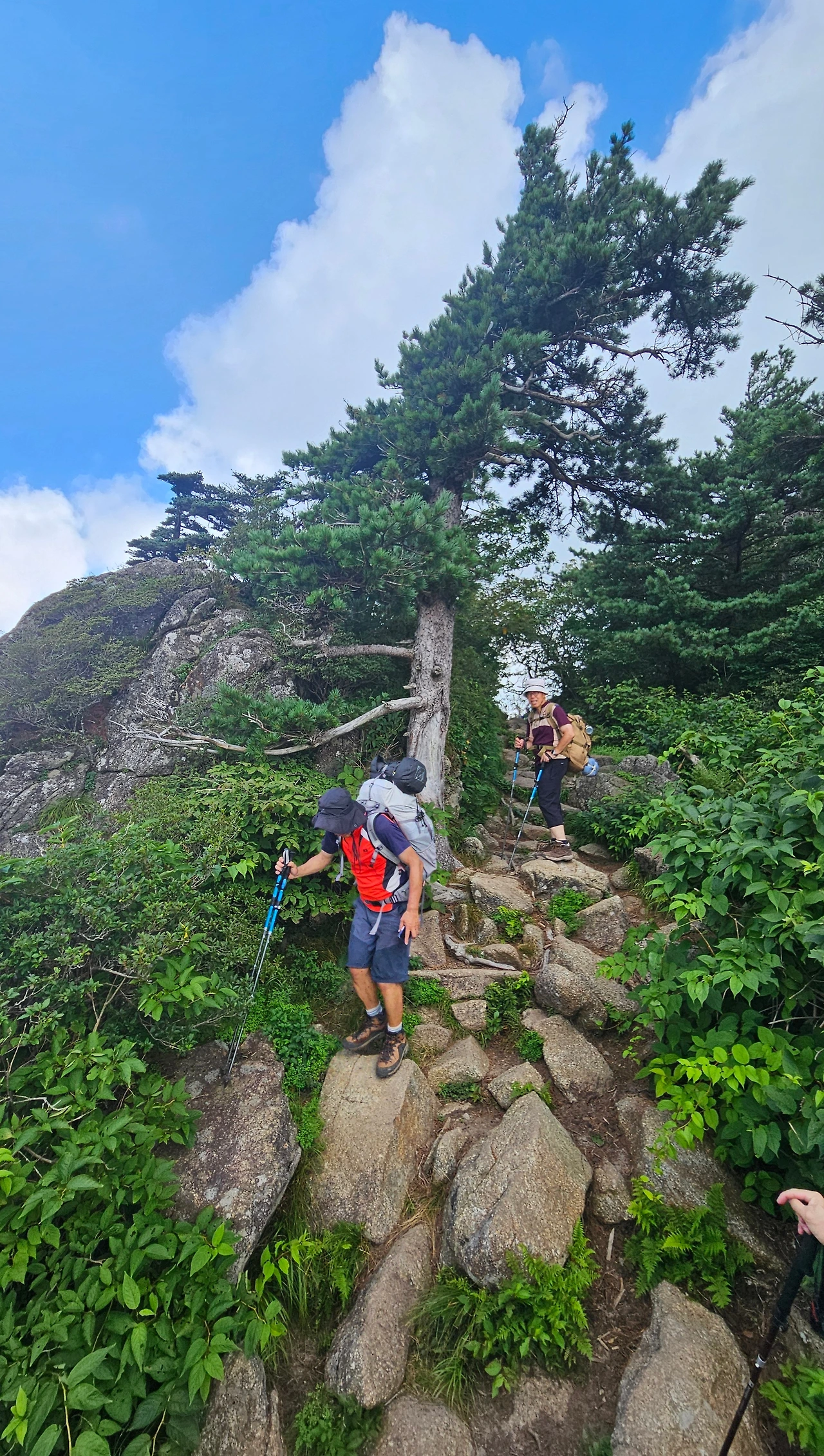 출발한 지 얼마지 않아 뒤쪽에서 빠른 걸음으로 호기롭게 다가오는 젊은 산객 일행 세 분에게 길을 비켜주고 오버 페이스하지 않으며 진행한다. 금세 땀이 온몸을 적시는데, B처럼 어제 입고 물에 헹구어 놓아 여전히 축축한 셔츠를 다시 입고 온 것이 잘한 일이라는 생각이 든다.