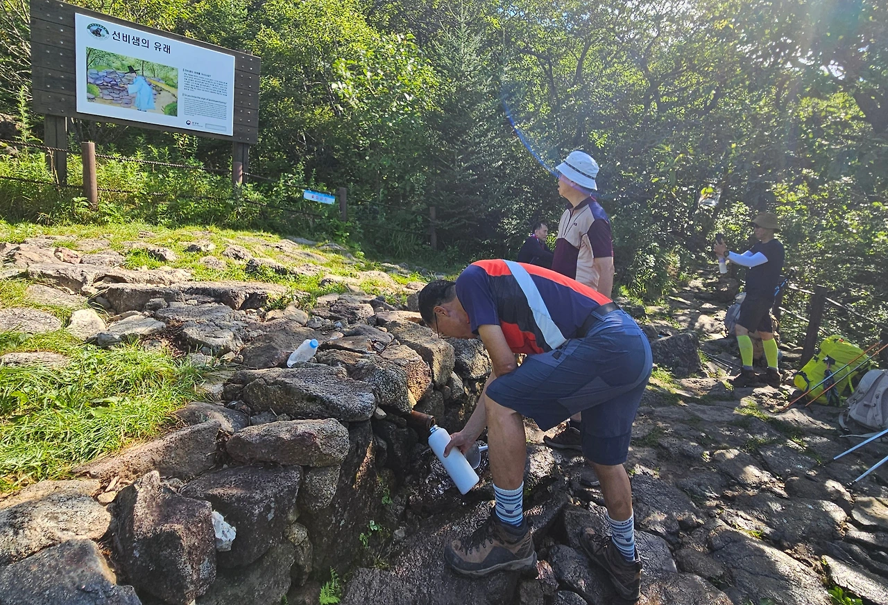 벽소령대피소에서 출발한 지 1시간 만에 해발 1,478m 덕평봉을 지나고, 08:50경 봉우리 아래 호젓하게 자리한 선비샘에 도착하여 앞서 도착하여 기다리고 있던 H와 합류했다. 넓적한 바윗돌로 단정하게 단을 쌓고 대나무 파이프로 샘물이 흘러내리게 한 샘은 그 이름처럼 단정하고 물맛도 청량하기 그지없다. 이 샘에는 그 이름에 대한 재미있는 유래가 아래와 같이 전한다.