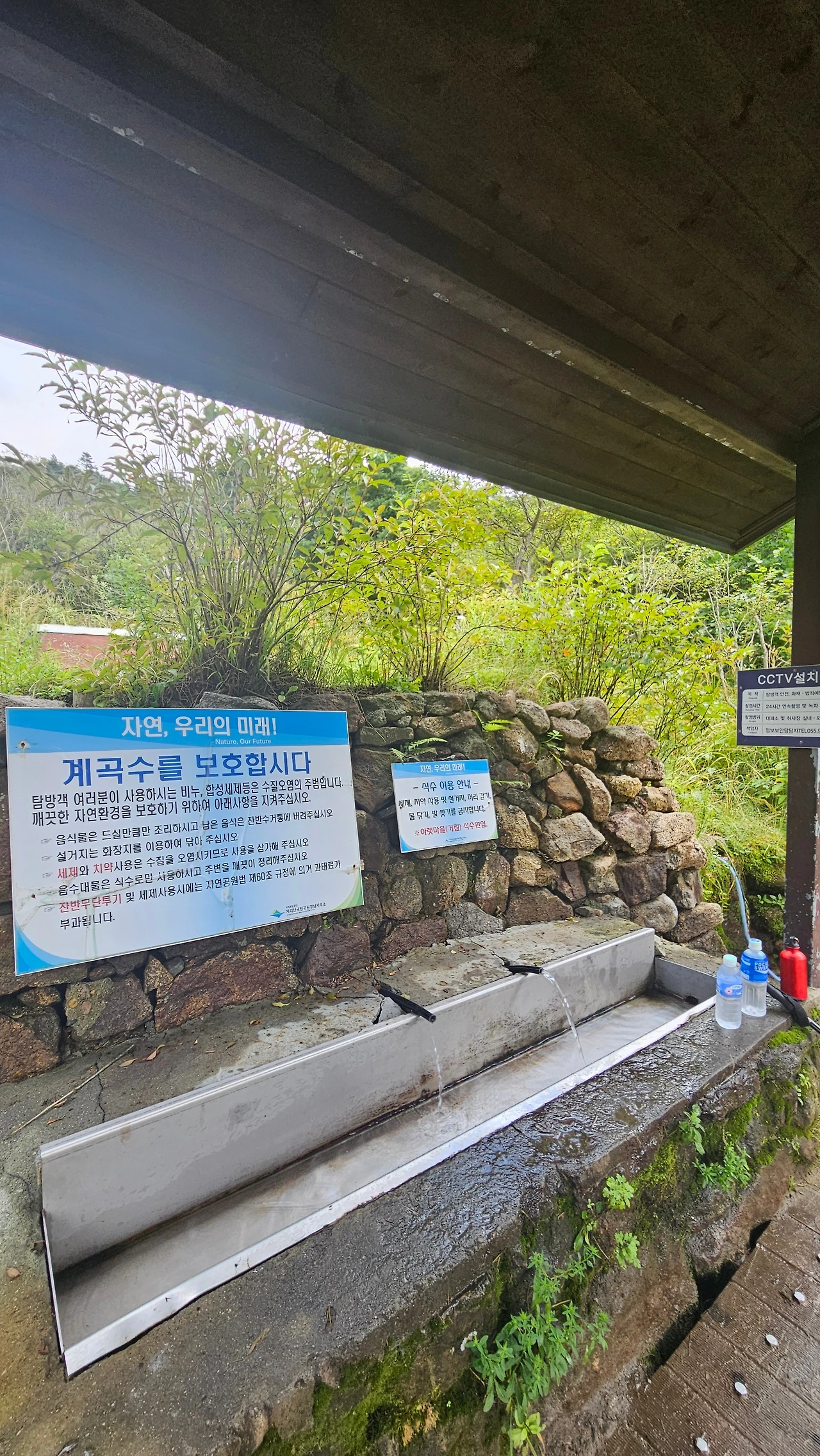 정오쯤에 세석대피소에 도착하여 점심을 들고 페트병에 물을 보충했다. 세석대피소의 샘터 샘물은 선비샘보다 수량이 풍부하고 물맛도 그만이다. 샘터로 내려가는 입구의 이정표가 샘터 쪽 6km와 10km 지점에 각각 거림마을과 청학동이 있다고 알린다.