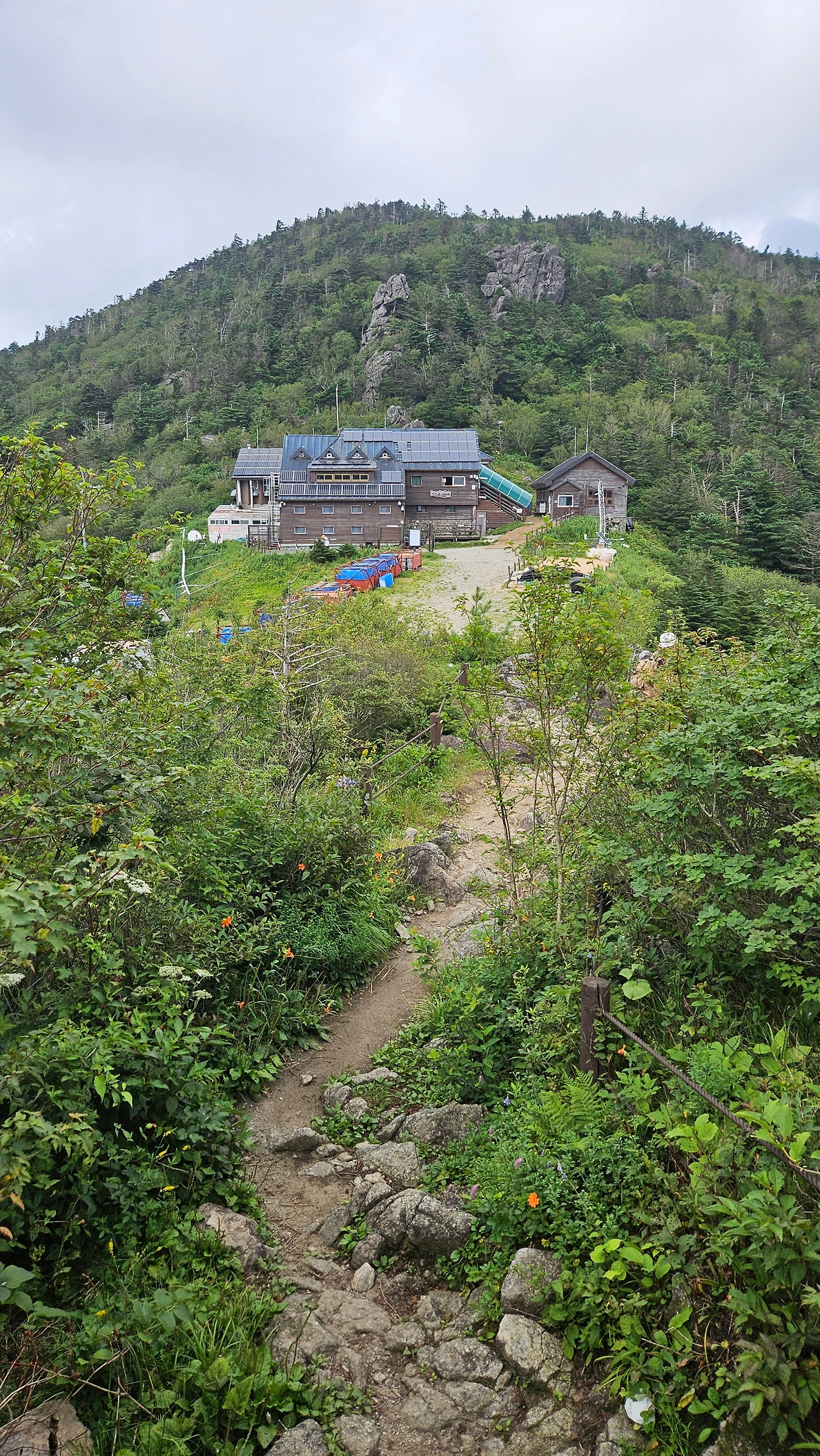 대피소 쪽에서 한참 동안 뒤따라오는 M의 목소리를 들으며 촛대봉으로 걸음을 옮겼다. 세석평전은 과거 산불로 훼손된 후 구상나무와 같은 침엽수림 아래 자라던 여러해살이풀인 호오리새가 여러 종류의 들꽃, 키 작은 나무, 교목 등과 섞여서 가장 넓게 분포하고 있다고 한다. 등로 옆에 씨앗 포집용 망태기를 쓰고 있는 야초들이 눈길을 끈다. 온몸이 햇빛에 드러나는 등로를 따라 걷자니 서늘했던 고원에서 한여름으로 다시 돌아온 느낌이다.