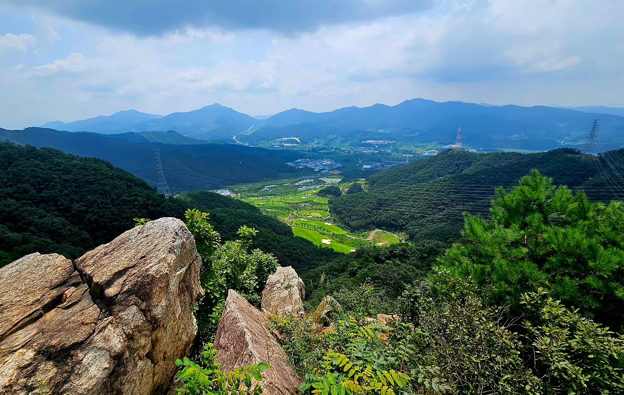 잠시 휴식을 한 후에 옥녀봉에서 안부로 내려와서 등로를 뒤덮고 있는 칡넝쿨 덤불을 헤치며 지났다. 다시 가파른 비탈과 한참을 씨름하다 보니 오붓하게 솟은 능선에 삼 형제 바위가 나타나며 남쪽으로 트인 조망을 펼친다. 능선 아래쪽에는 새로이 골프장이 만들어지고 있고 중부내륙고속도로는 국망산과 매방채산 사이로 사라져 간다.