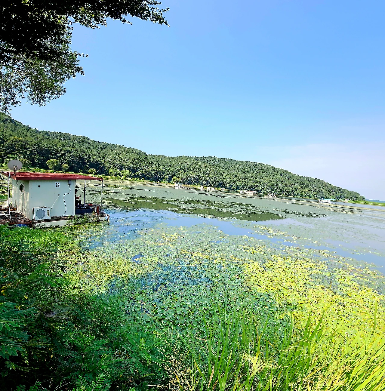 역사를 빠져나와 여주공영버스 929번을 타고 서너 정거장 거리의 여주시 점동면 관한 2리 관한교 부근에서 내렸다. 등산코스 지도 등을 참고하여 관한 2리 마을회관 앞을 지나고 원부저수지 가장자리를 따라 산행 들머리인 밀고개 쪽으로 향했다. 복날의 무더운 날씨가 벼를 빨리 자라게 한다고 했으니 저수지 아래 너른 논은 머지않아 풍년의 황금빛 물결로 넘실댈 것이다. 저수지 가장자리 수면에는 어리연이 무성하다. 곳곳에 설치된 낚시터 데크에는 낚싯줄을 던져 놓고 입질을 기다리는 몇몇 강태공들의 모습도 눈에 들어온다.