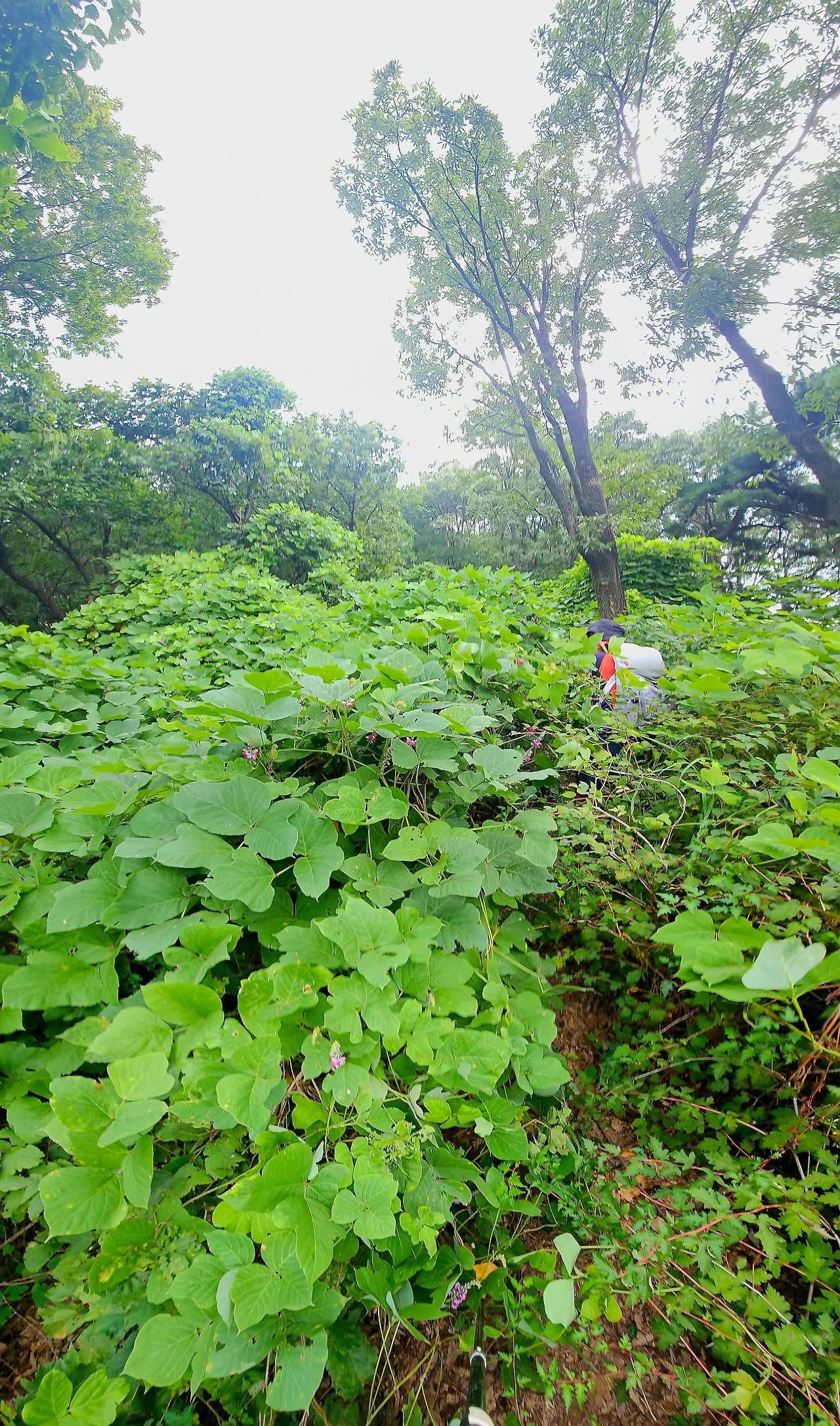 등로인 듯 아닌 듯 잡목이 막아서는 급경사를 따라 한참 동안 기어오르듯 발을 옮겨 주 능선으로 올라섰다. 어느새 얼굴에는 땀이 비 오듯 하고 셔츠는 땀에 흥건히 젖었다. 솔가지 참나무가지 등 땔감이 지천으로 깔린 길은 사람들이 다닌 지 오래되었는지 희미하고 곳곳을 멧돼지가 헤집어 놓았다. 손을 휘휘 저어 물리쳐 보지만 귓가에서 잉잉거리며 성가시게 달려드는 날벌레들은 아랑곳하질 않는다. 잔잎이 달린 나뭇가지를 꺾어 양쪽 모자 밑에 끼워 귀를 덮으니 윙윙대는 소리가 조금 잠잠해졌다.