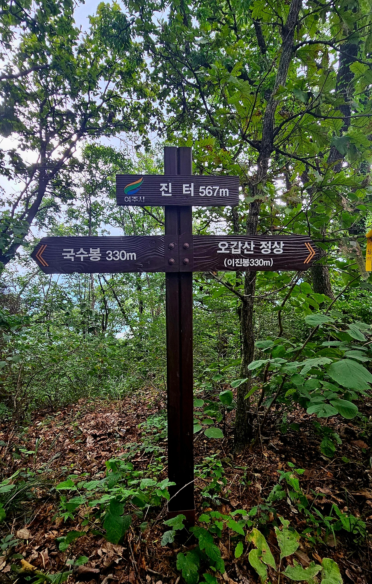 오갑산 정상에서 국수봉으로 이어지는 능선의 등로는 한결 편하고 반듯하게 정비되어 있다. 그 중간쯤에 '진터'라는 이정표가 자리한다. 진터에서 국수봉까지 300미터 거리 등로 주변 능선은 텃밭을 일굴 수 있을 정도로 넓고 편평하다. 등로 주변에서 간간이 눈에 띄던 깨어진 기왓장이 국수봉 턱밑에서는 무더기로 보인다. 예전 어느 때인가 기와까지 얹은 군사 진지가 자리하고 있었음을 짐작할 수 있다.