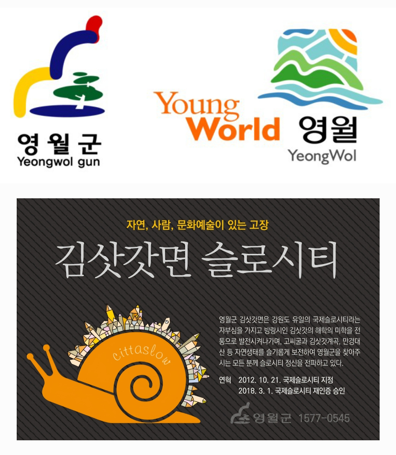 1994년 폐광된 상동읍 텅스텐 광산을 인수한 캐나다 'Almonty Industries' 社가 본격적으로 채광 사업을 재개하면 영월 경제가 되살아날 지 모를 일이지만, 첩첩 겹치는 능선과 강물 물결 문양에 'Young World'라는 문구가 들어 있는 영월군의 슬로건과 슬로시티 로고가 오래도록 함께하면 좋겠다.